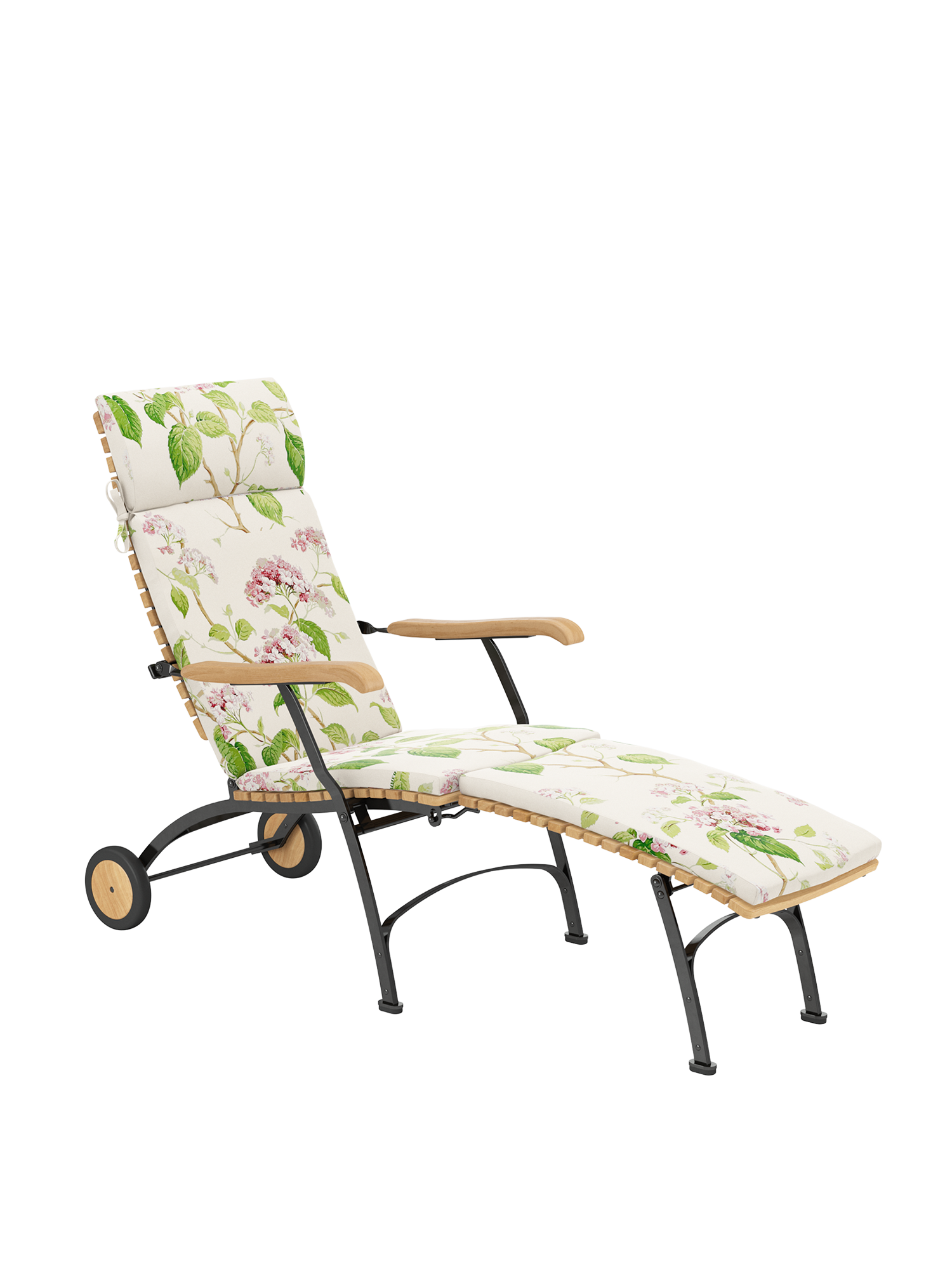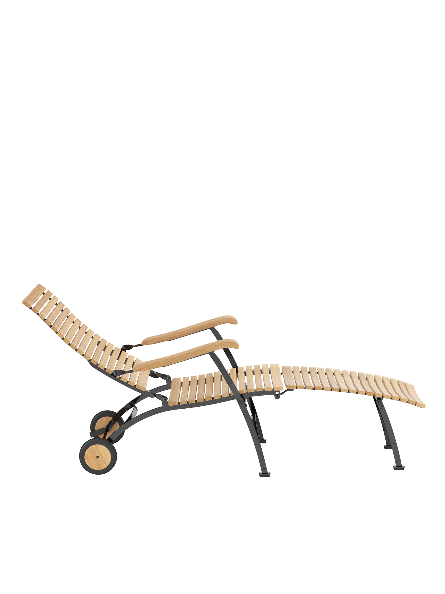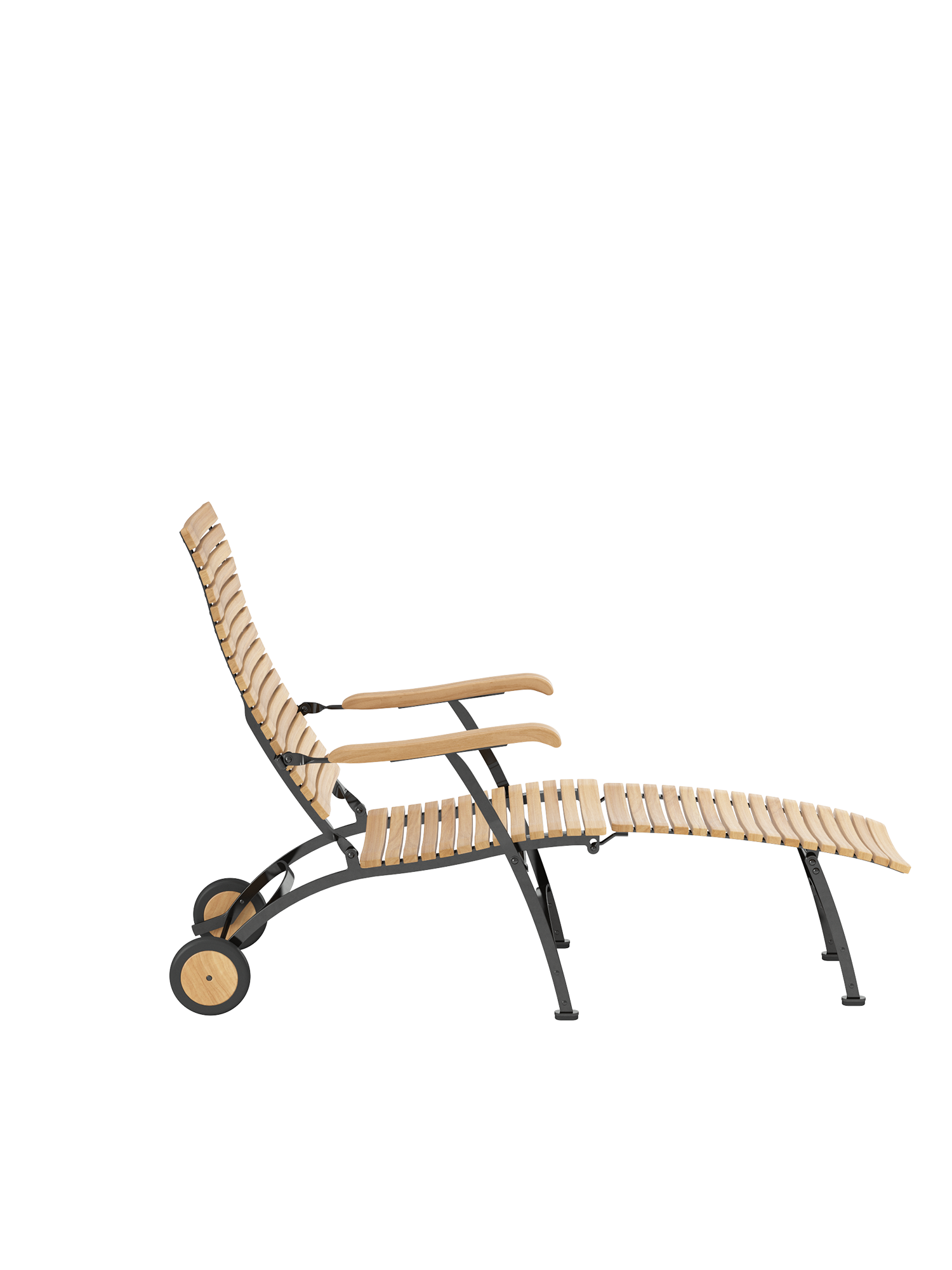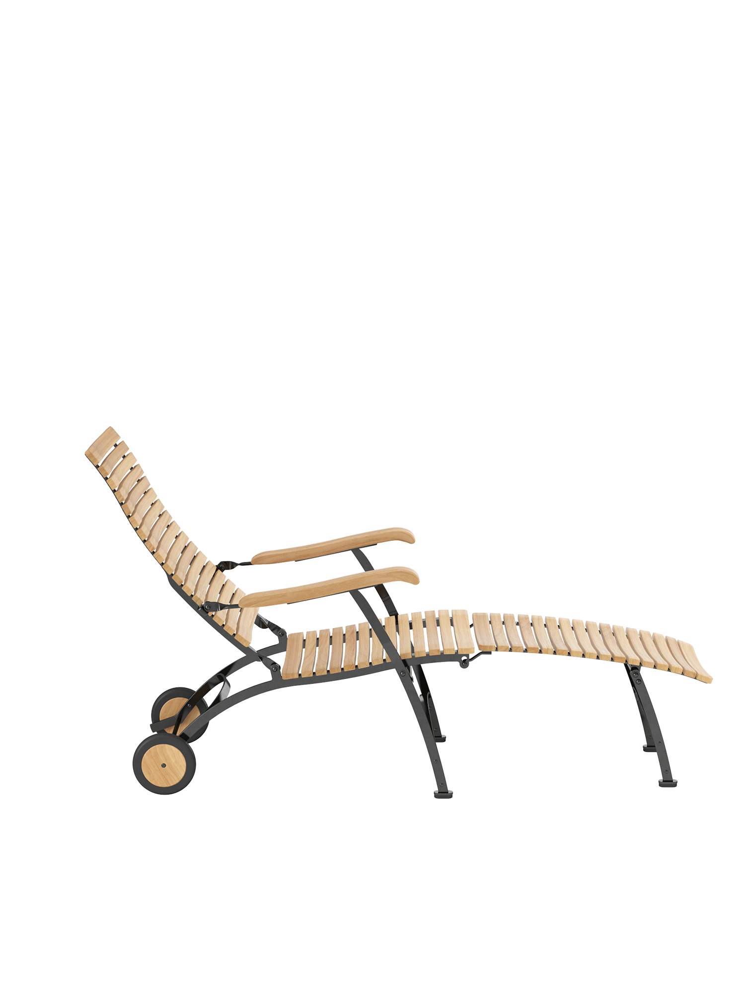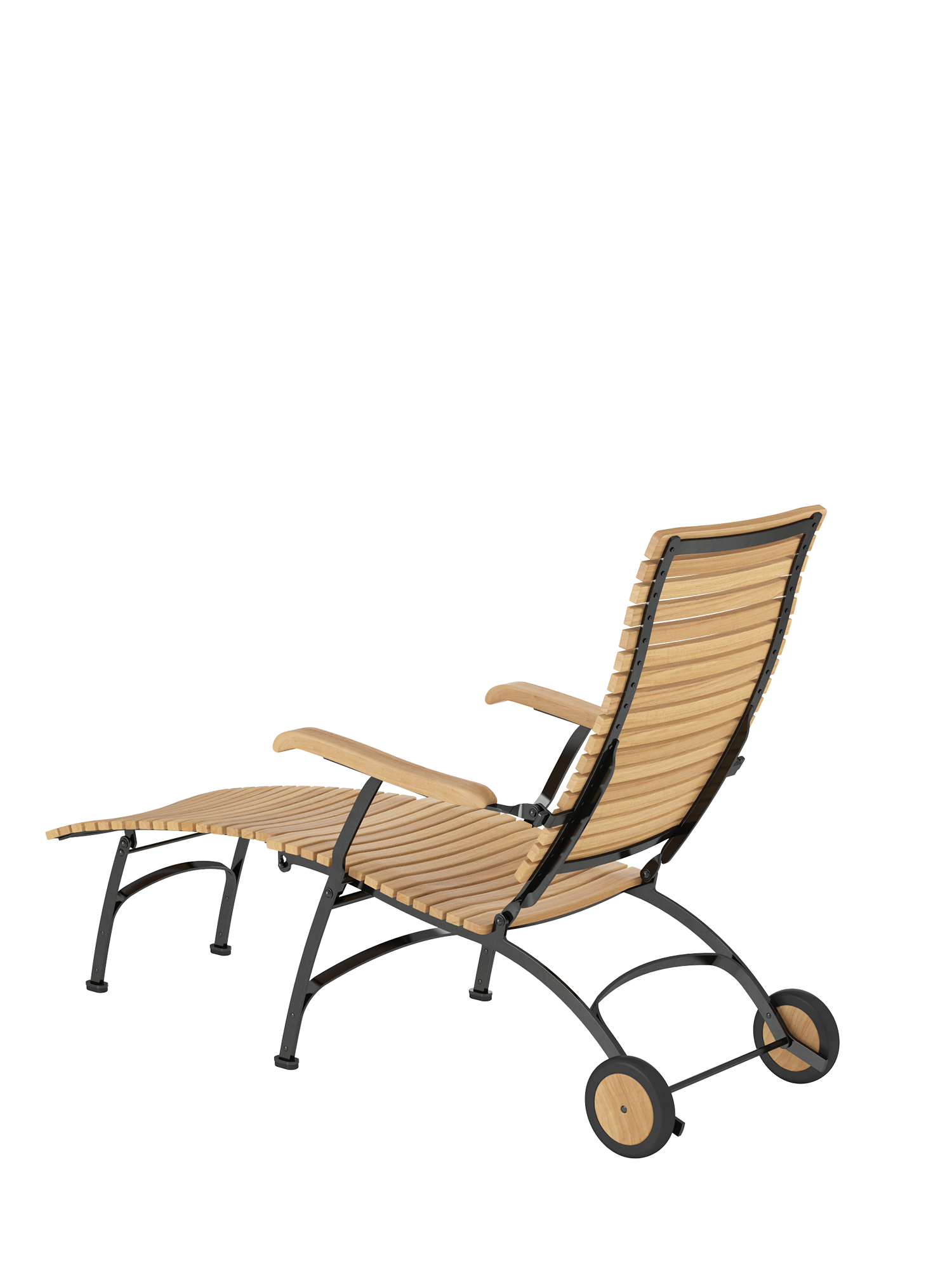 Alle Drehverbindungen aus Edelstahlbolzen sind rostfrei gelagert - für eine dauerhafte Funktion im Freien. Laufrollen aus hochwertigem Polyamid, die unter der Sitzfläche angebracht sind, unterstützen leichtgängiges Klappen und schonen die beschichteten Metallteile. Das Gestell ist aus verzinktem und damit rostgeschütztem Stahl, graphitschwarz pulverbeschichtet. Mit seinen Rädern aus Teak lässt sich der Deck Chair einfach durch den Garten bewegen. Fußgleiter aus abriebfestem Kunststoff schützen wertvolle Böden vor Kratzern.