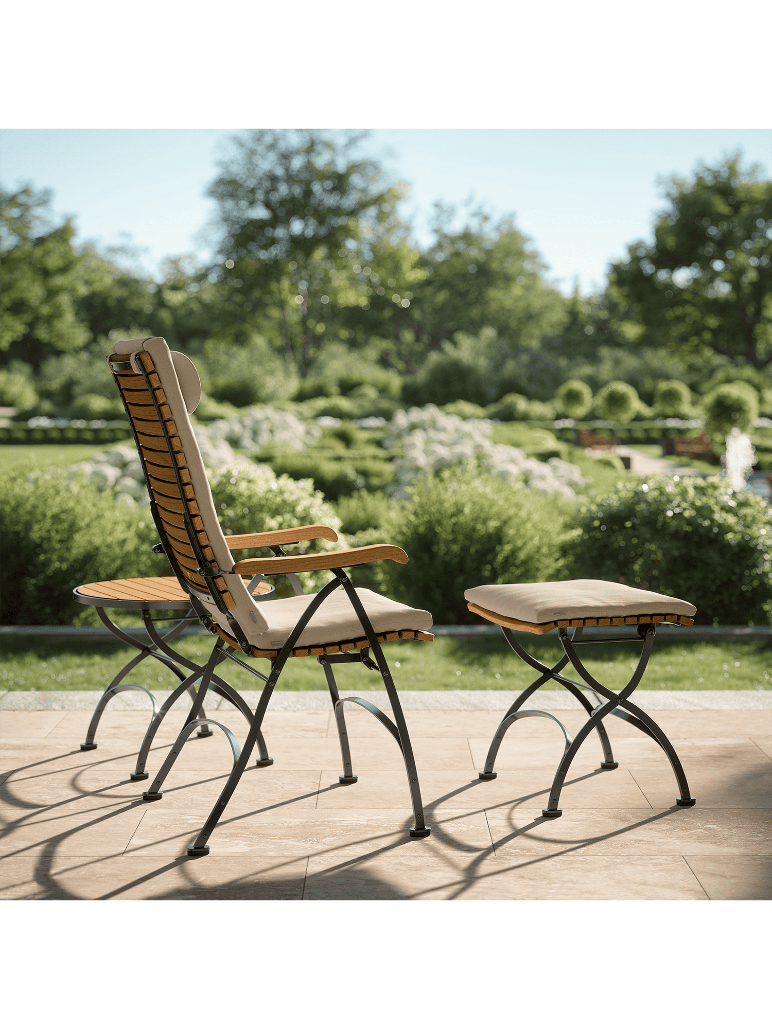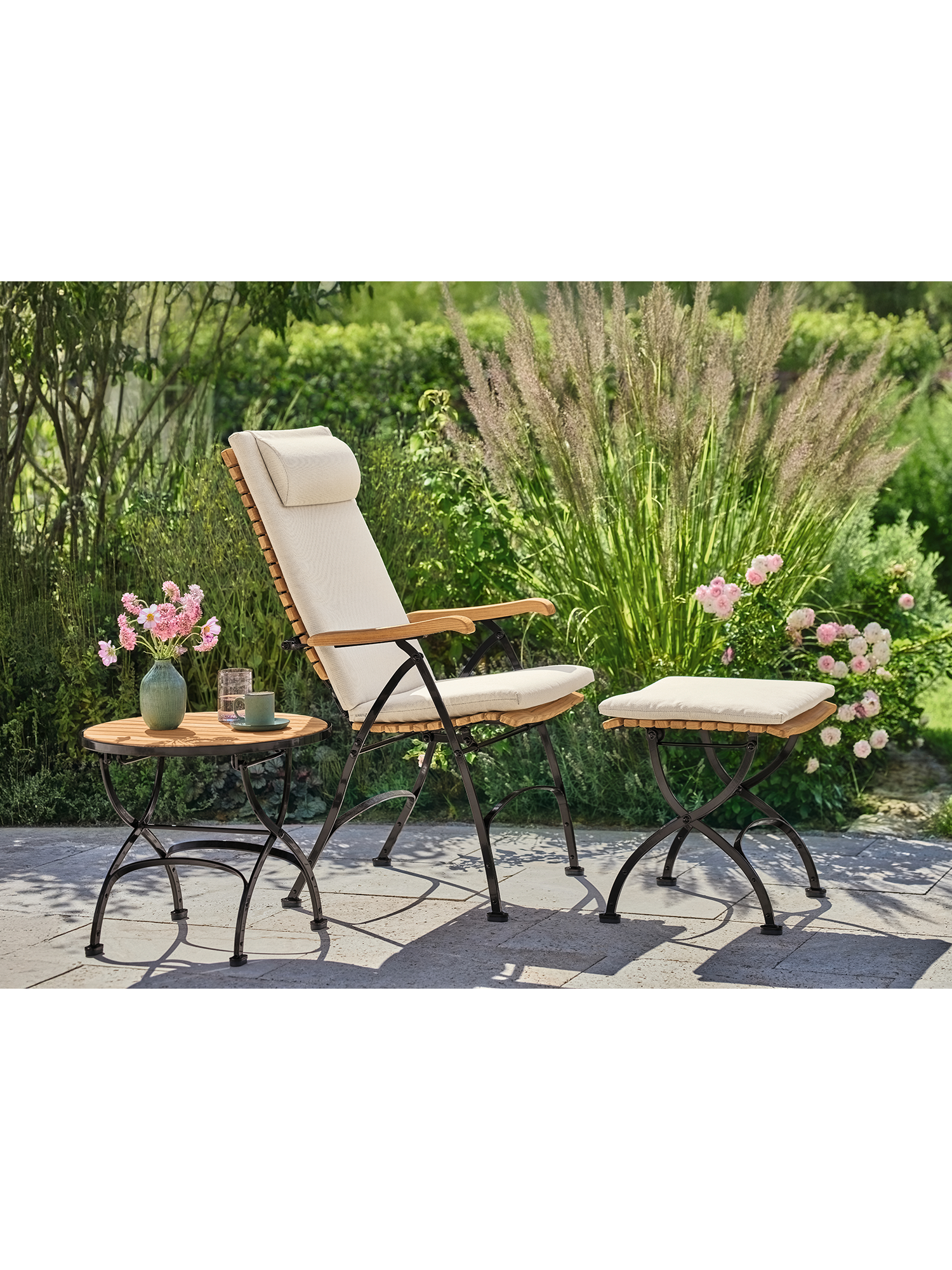 Im Handumdrehen aufgeklappt, erweitert er den Recliner zum Liegestuhl und bietet sich selbst als unkomplizierten Sitzplatz an. Seine Sitzfläche besteht aus ergonomisch geformten Teakleisten, das Gestell aus verzinktem, pulverbeschichtetem Stahl. Auflagen in verschiedenen Farbtönen erhöhen noch die Bequemlichkeit der Gartenmöbel und setzen feine Akzente.