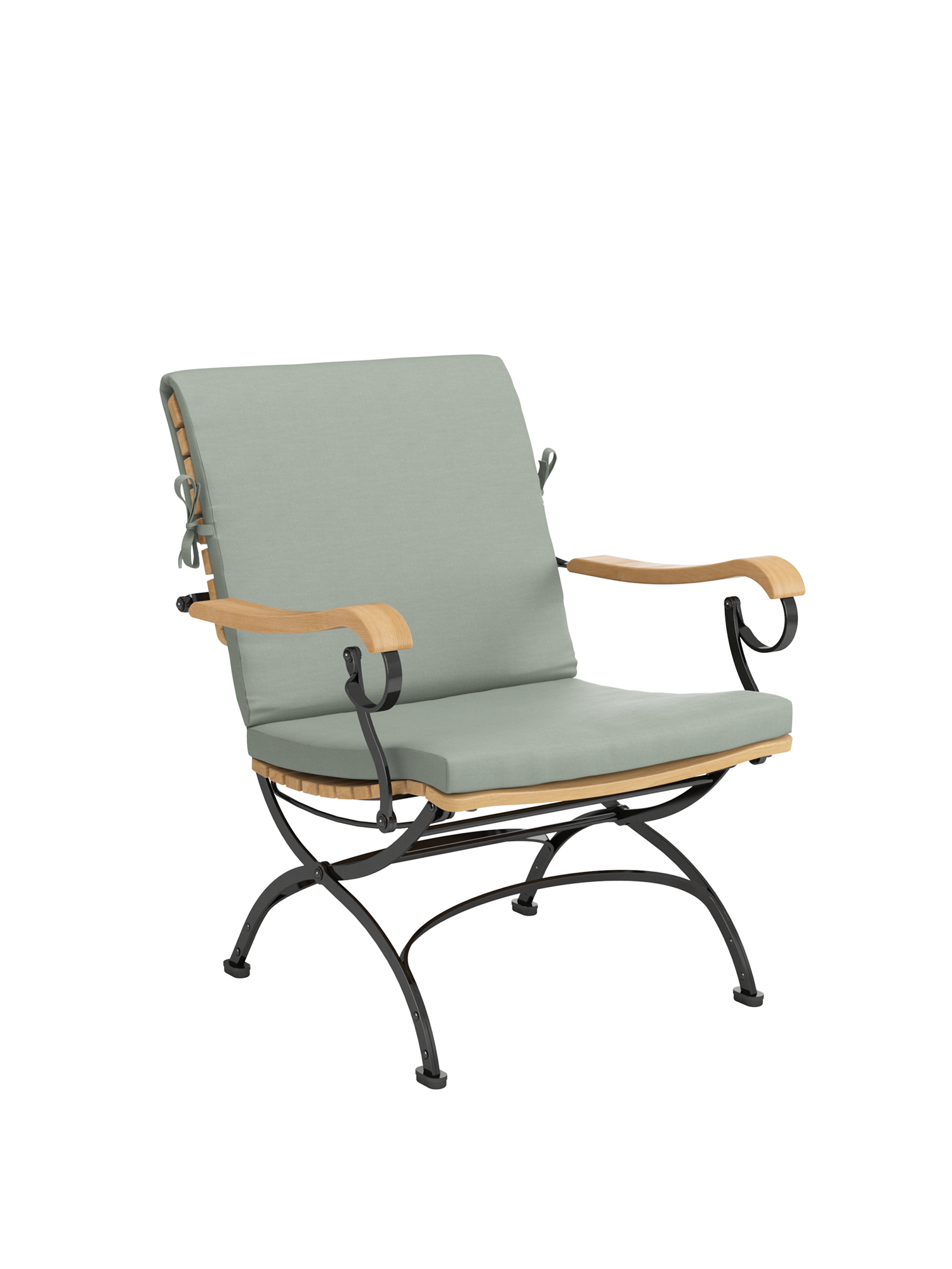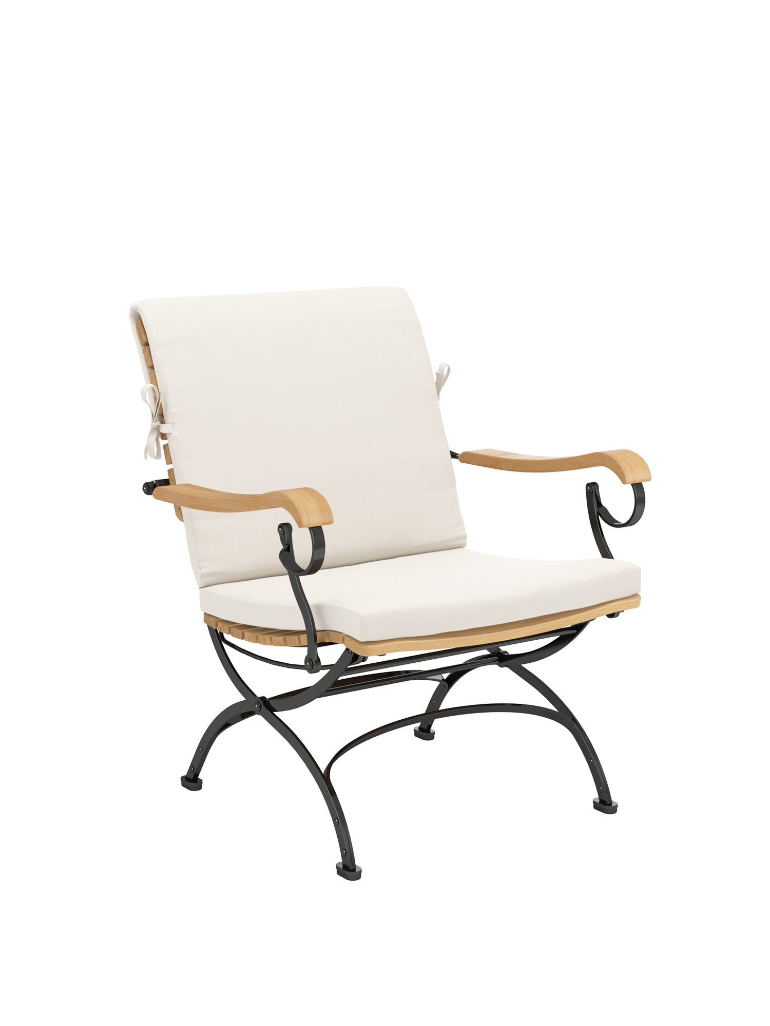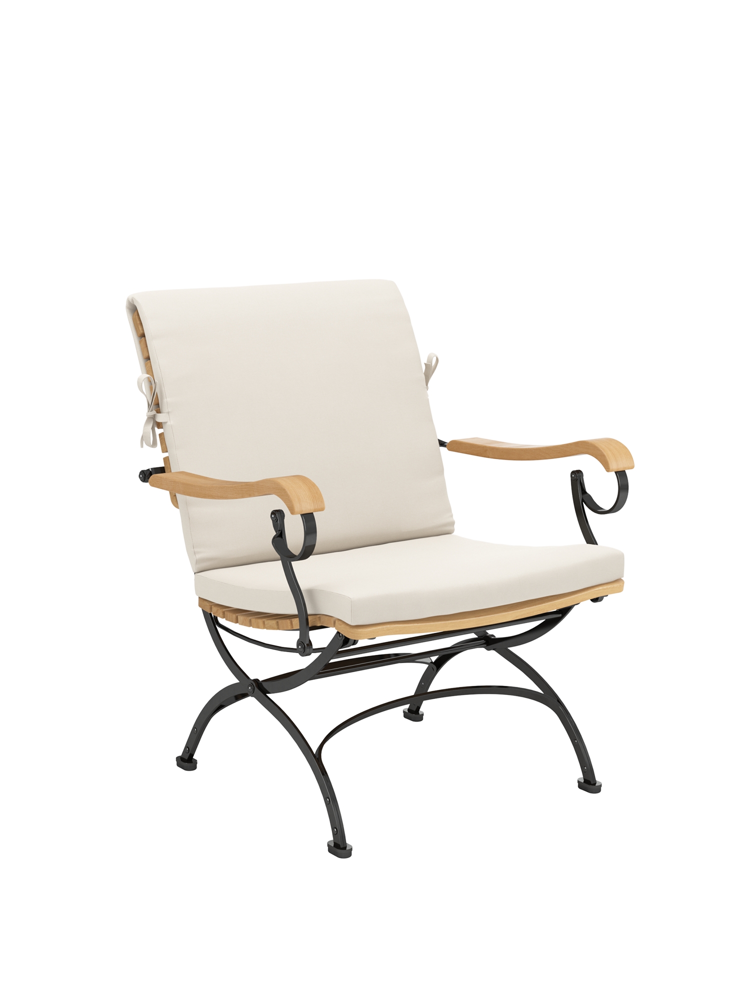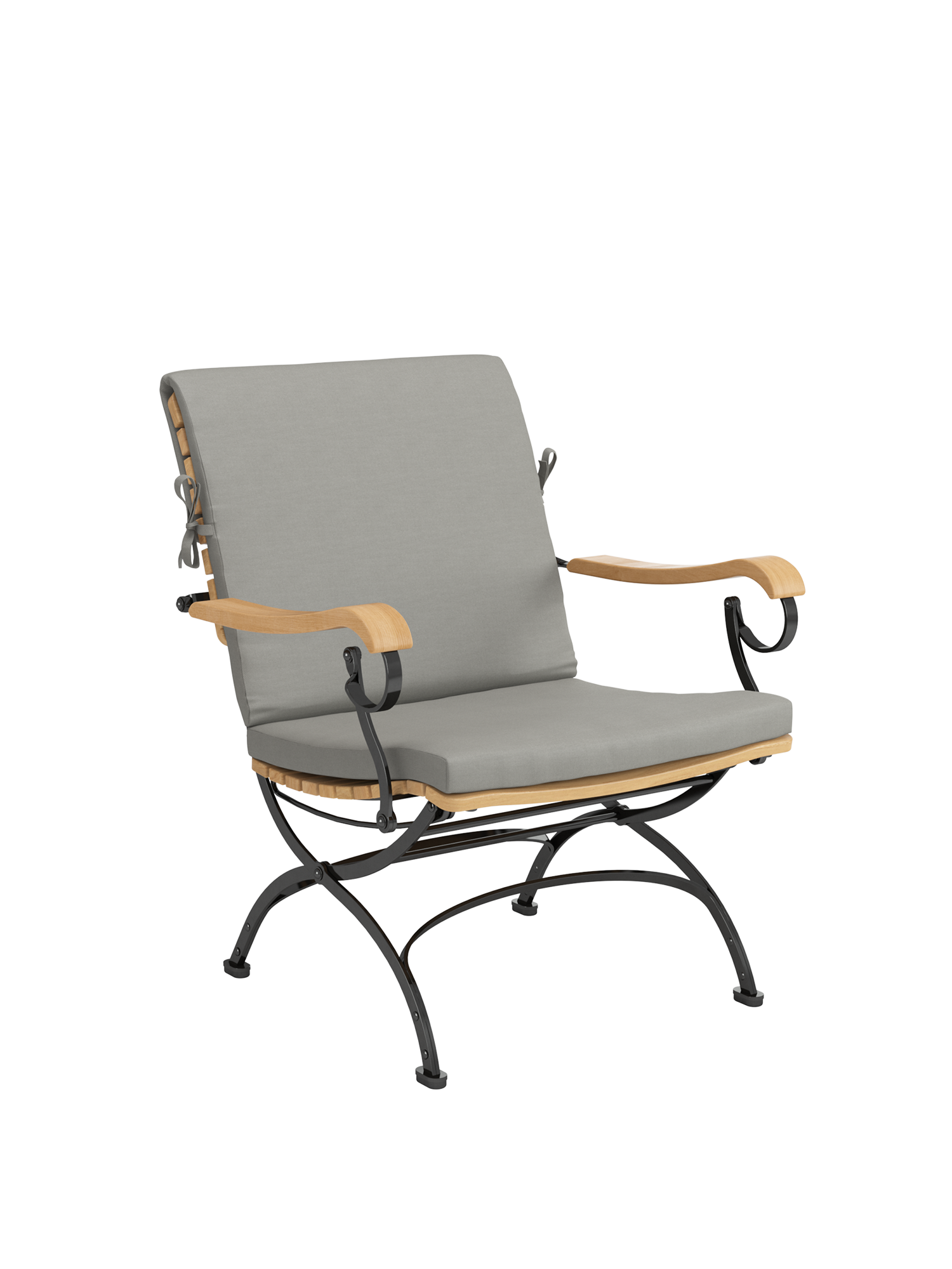 Mit deutlich mehr Platz zwischen den Armlehnen beweist der klappbare Klassiker aus Teakholzleisten und pulverbeschichtetem Stahl besondere Loungequalitäten. Armlehnen aus wetterfestem Plantagenteak schmeicheln der Hand und entlasten den Körper. Die große Sitzfläche des Gartensessels aus Teak ist dreidimensional geformt, so dass sie sich dem Körper anschmiegt. Vorn ist sie zur besseren Schenkelauflage abgerundet. Auflagen in verschiedenen Farbtönen erhöhen noch die Bequemlichkeit der Möbel und setzen feine Akzente.