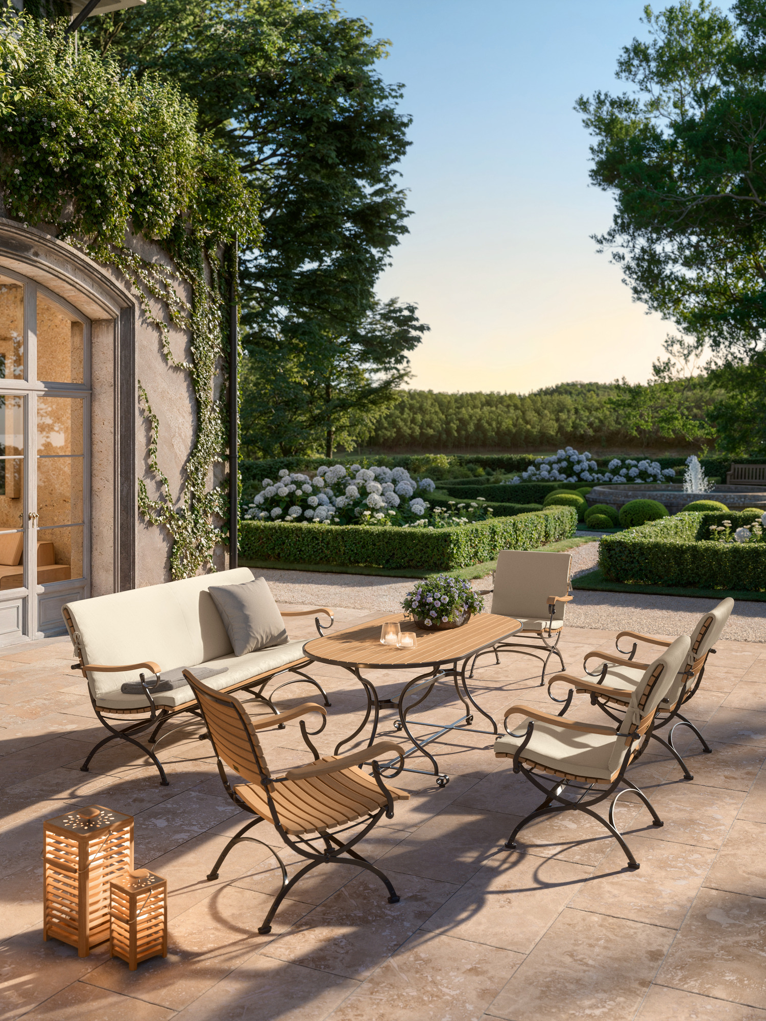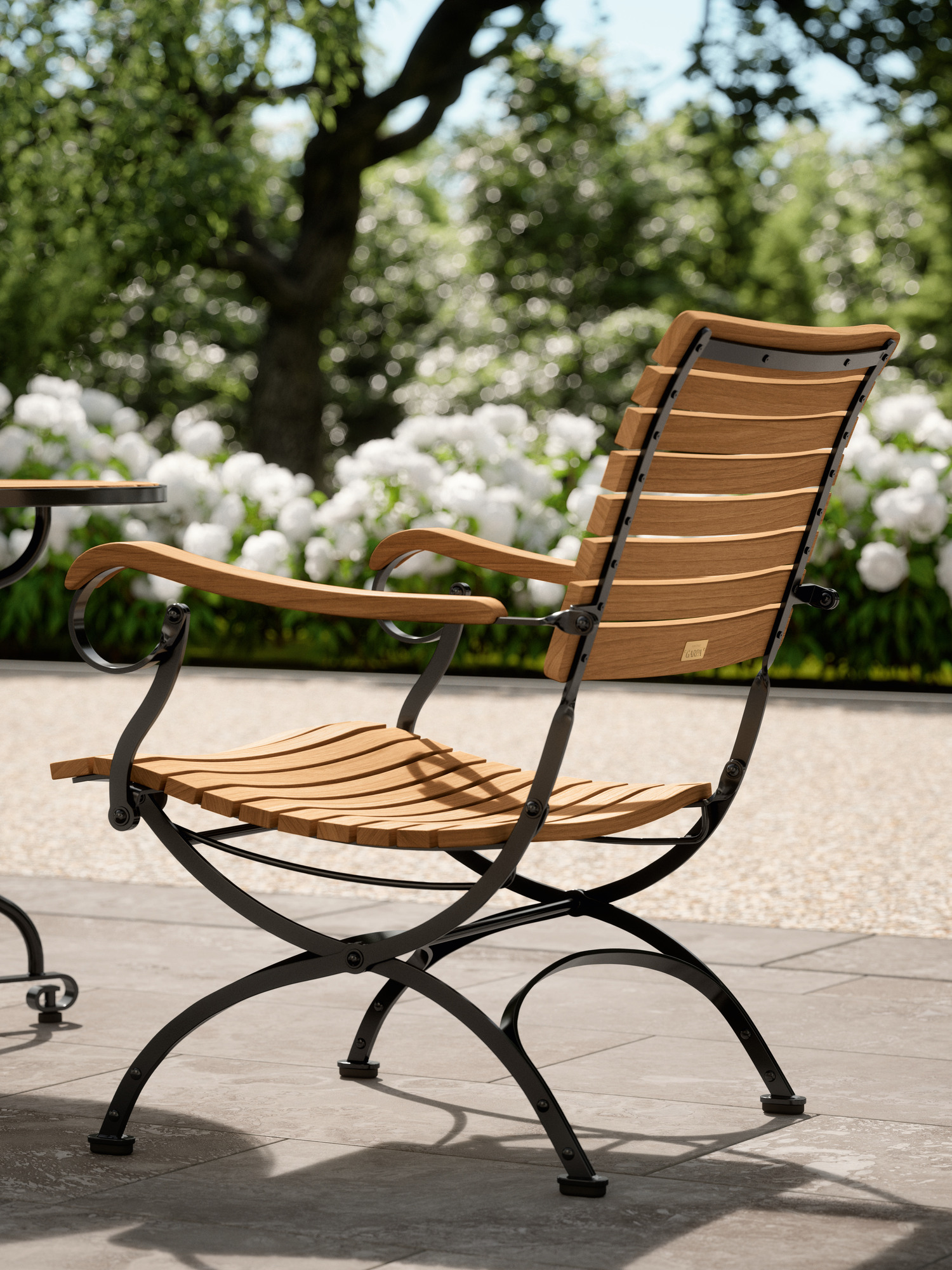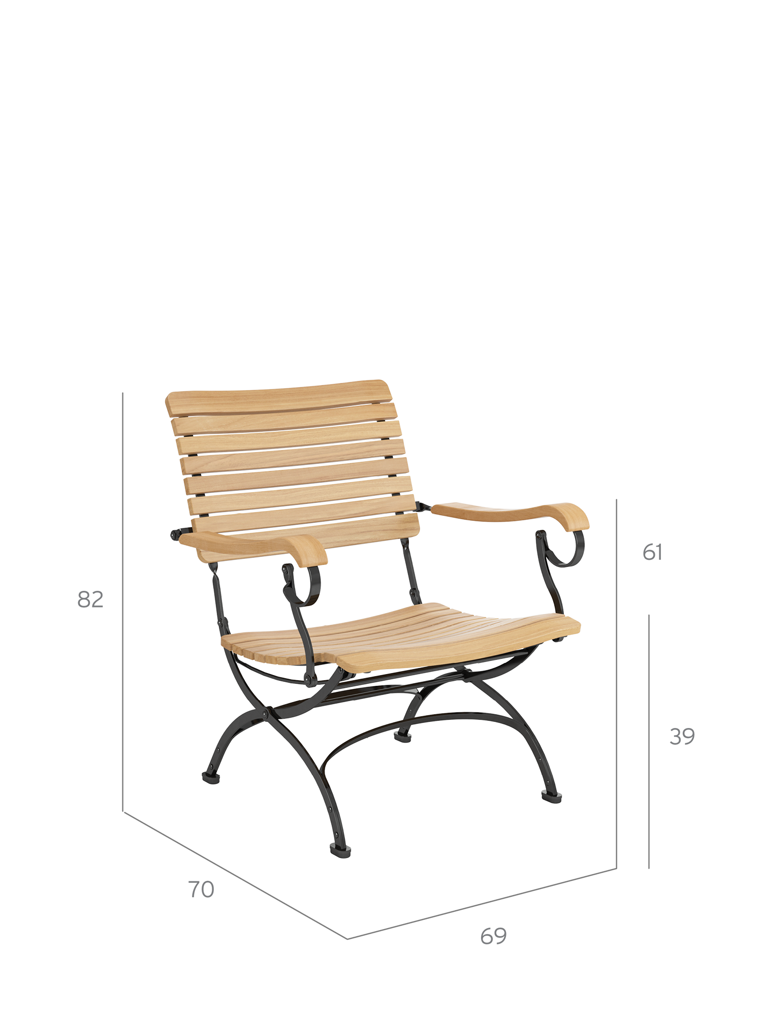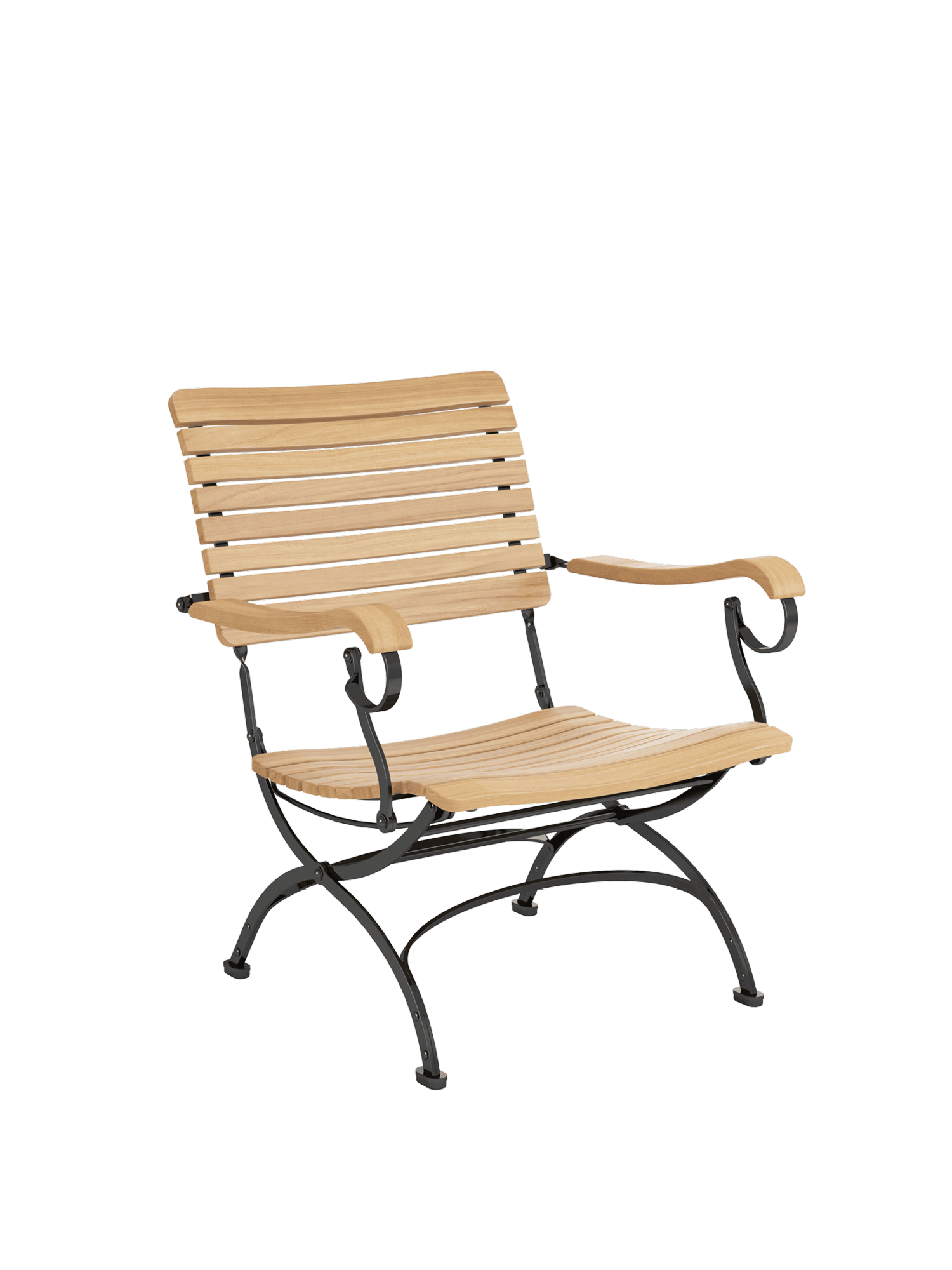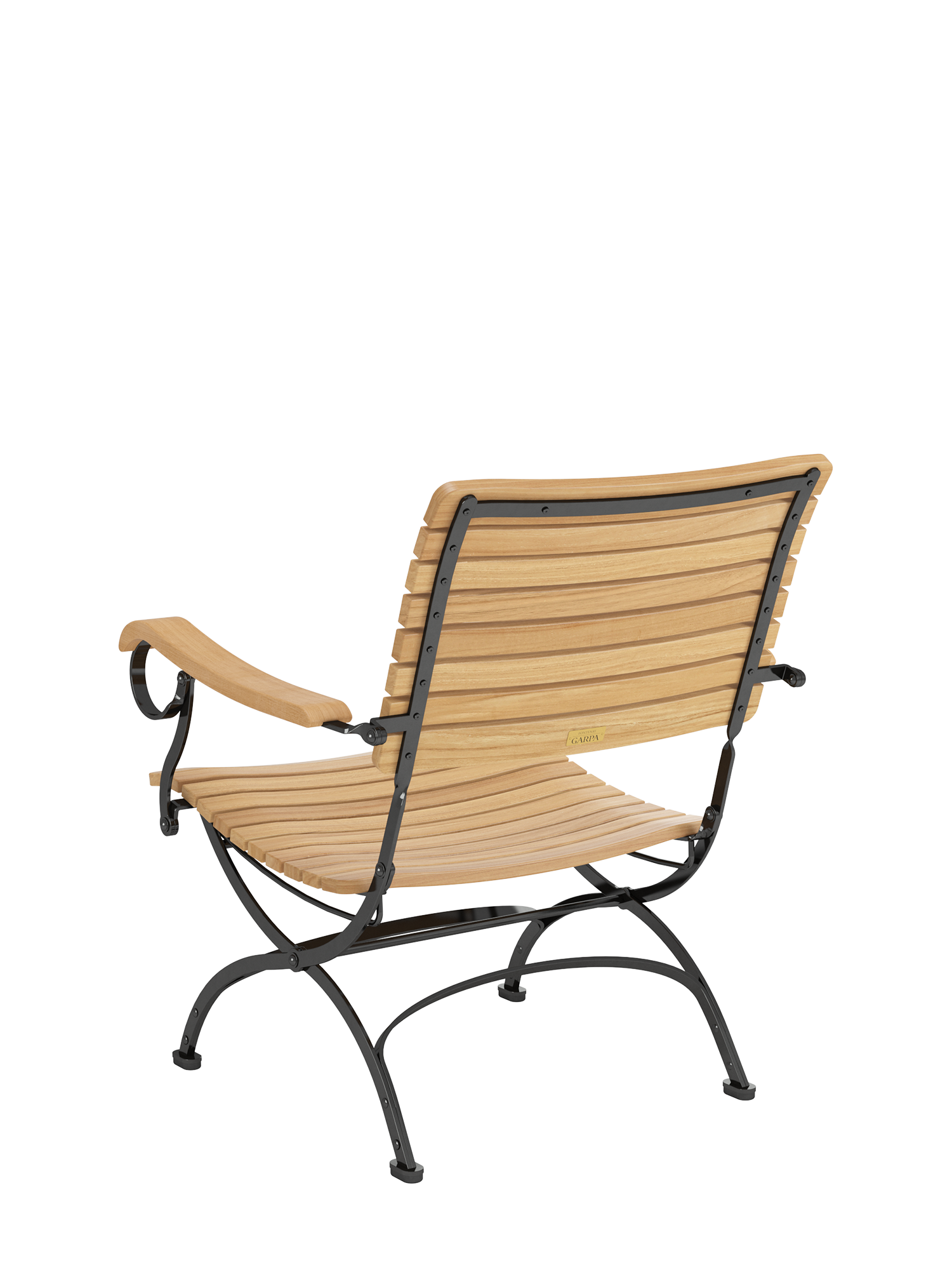 Mit deutlich mehr Platz zwischen den Armlehnen beweist der klappbare Klassiker aus Teakholzleisten und pulverbeschichtetem Stahl besondere Loungequalitäten. Armlehnen aus wetterfestem Plantagenteak schmeicheln der Hand und entlasten den Körper. Die große Sitzfläche des Gartensessels aus Teak ist dreidimensional geformt, so dass sie sich dem Körper anschmiegt. Vorn ist sie zur besseren Schenkelauflage abgerundet. Auflagen in verschiedenen Farbtönen erhöhen noch die Bequemlichkeit der Möbel und setzen feine Akzente.