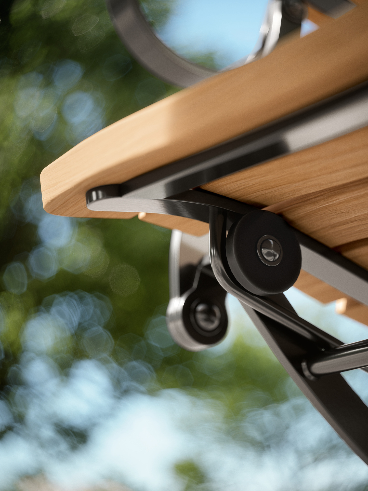 Alle Drehverbindungen aus Edelstahlbolzen sind rostfrei gelagert - für eine dauerhafte Funktion im Freien. Laufrollen aus hochwertigem Polyamid, die unter der Sitzfläche angebracht sind, unterstützen leichtgängiges Klappen und schonen die beschichteten Metallteile. Das Gestell besteht aus verzinktem und damit rostgeschütztem Stahl, graphitschwarz pulverbeschichtet. Zusammengefaltet ist der Sessel 23 cm schmal. Fußgleiter aus abriebfestem Kunststoff schützen wertvolle Böden vor Kratzern.
