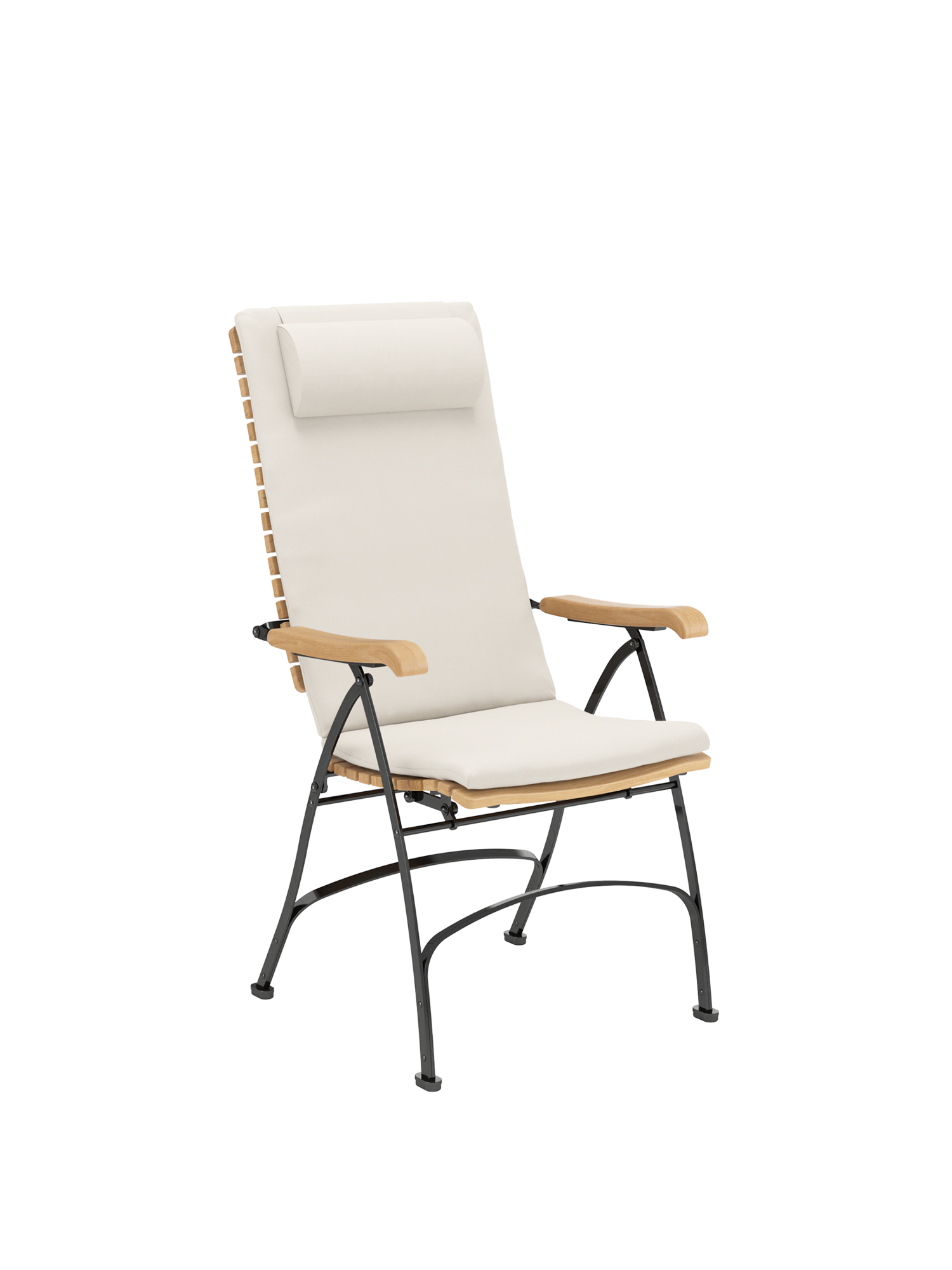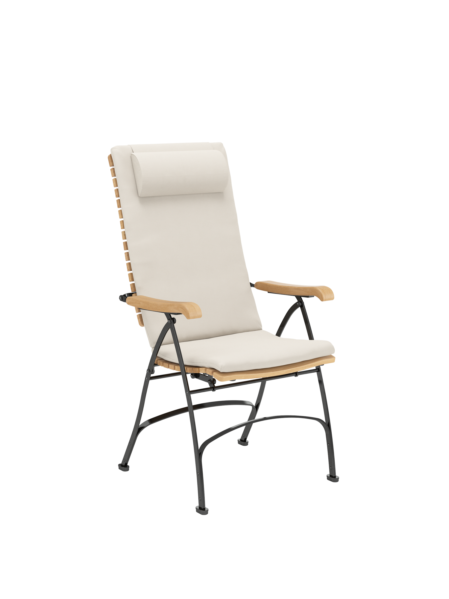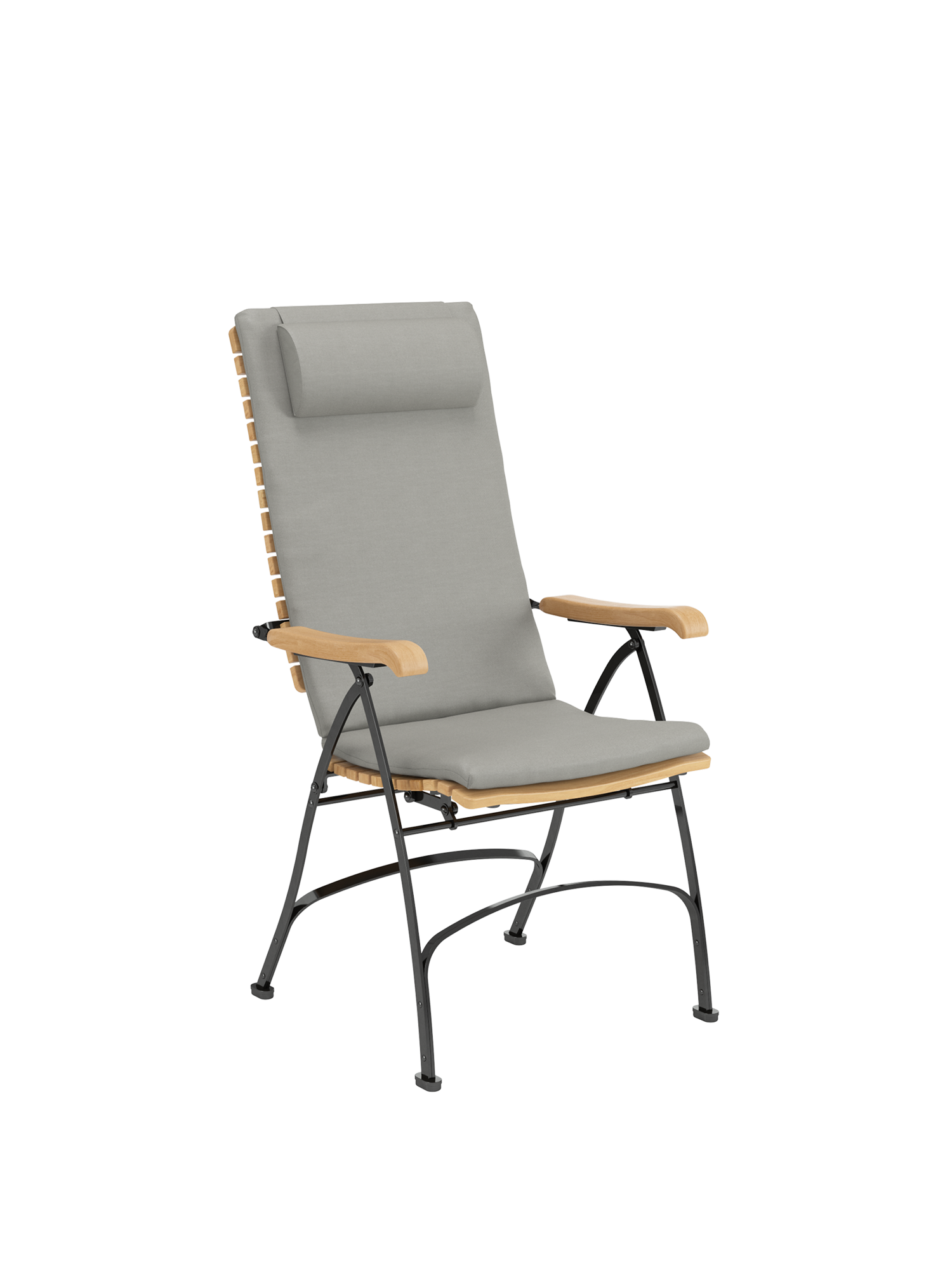 Mit extra hoher Lehne und dreifach verstellbarem Rückenteil bringt der Recliner willkommenen Komfort direkt an den Tisch. In illustrer Runde lehnt man sich nach dem Essen einfach zurück und genießt die Gesellschaft. Armlehnen aus Plantagenteak schmeicheln der Hand und entlasten den Körper. Auflagen in verschiedenen Farbtönen erhöhen noch die Bequemlichkeit der Möbel und setzen feine Akzente.