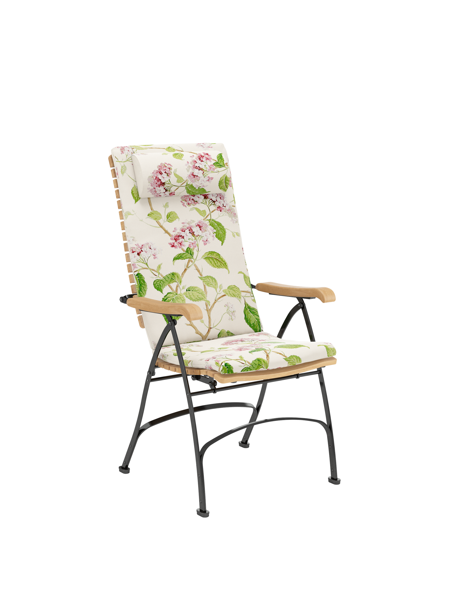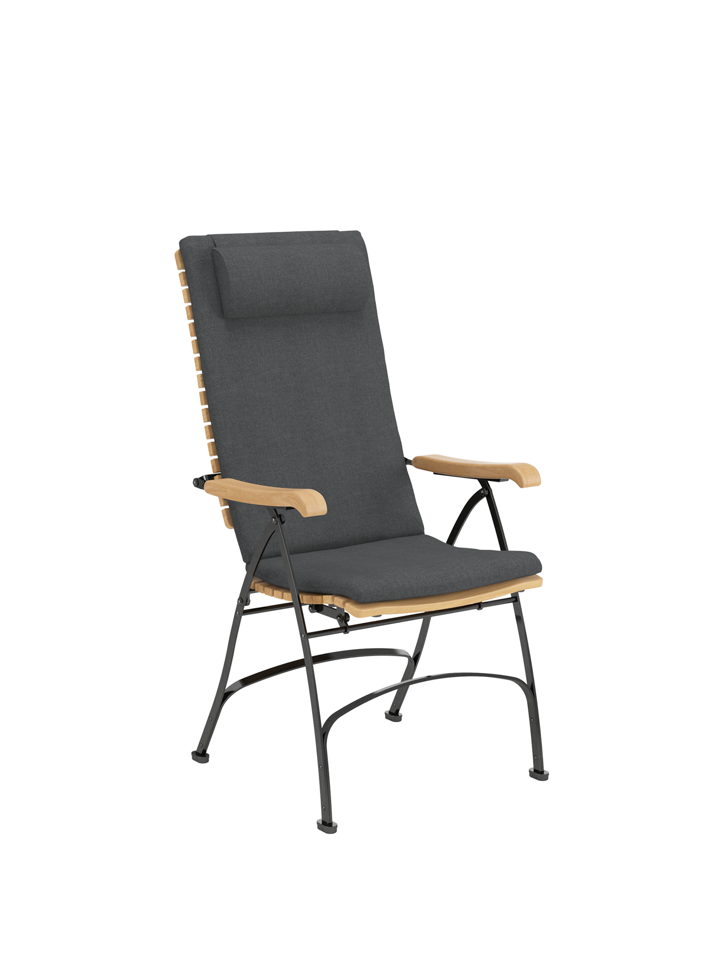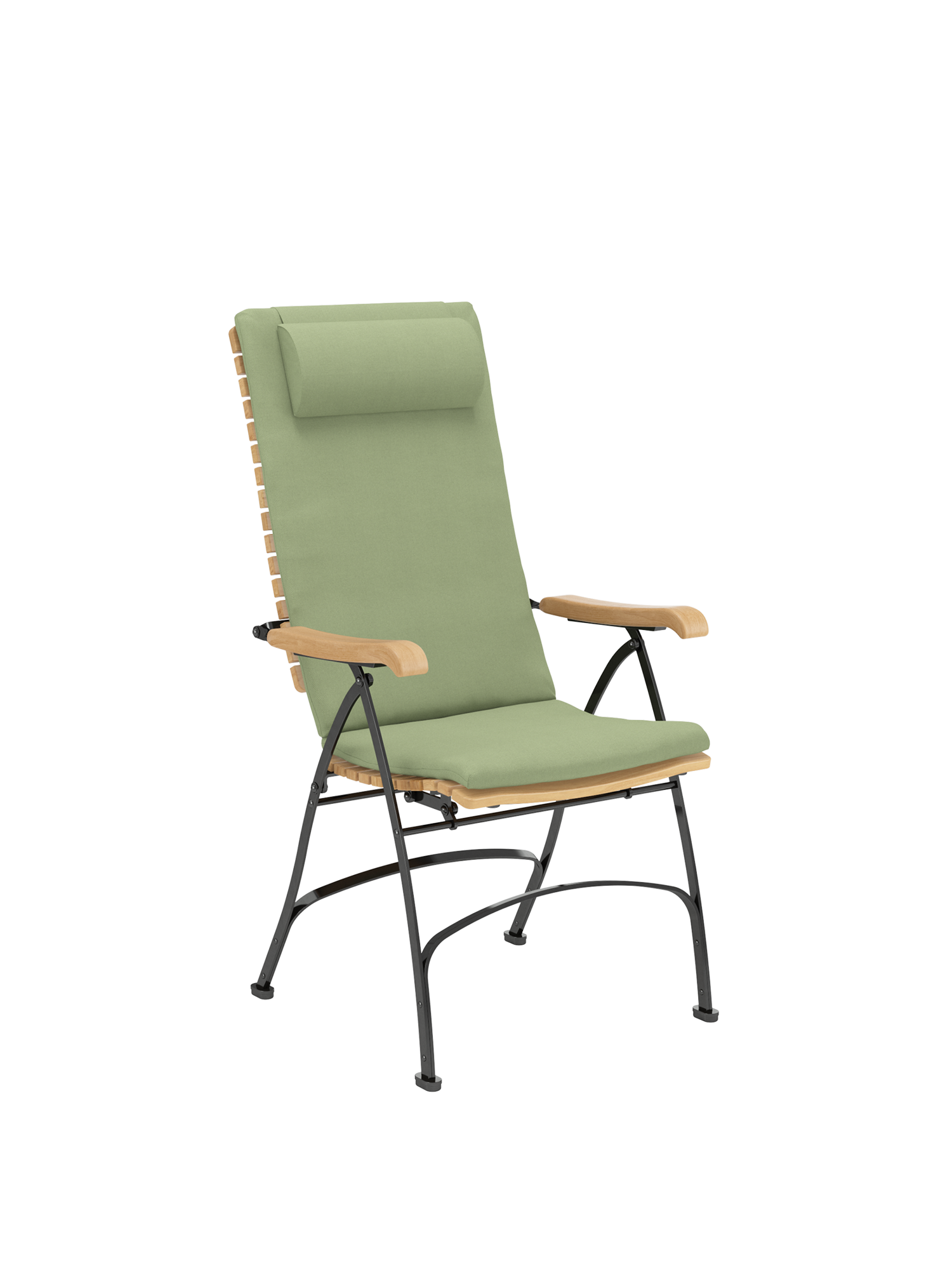 Mit extra hoher Lehne und dreifach verstellbarem Rückenteil bringt der Recliner willkommenen Komfort direkt an den Tisch. In illustrer Runde lehnt man sich nach dem Essen einfach zurück und genießt die Gesellschaft. Armlehnen aus Plantagenteak schmeicheln der Hand und entlasten den Körper. Auflagen in verschiedenen Farbtönen erhöhen noch die Bequemlichkeit der Möbel und setzen feine Akzente.