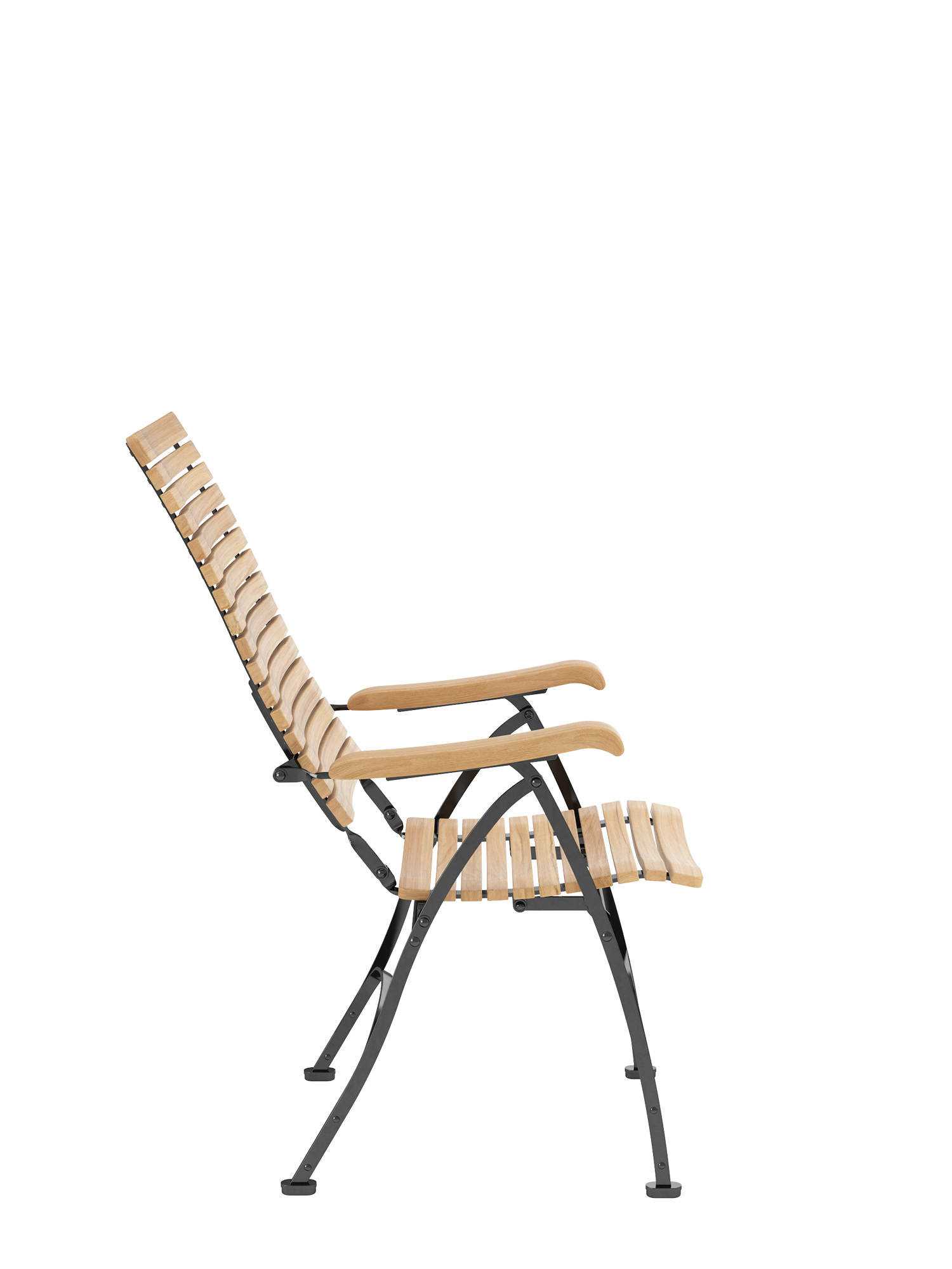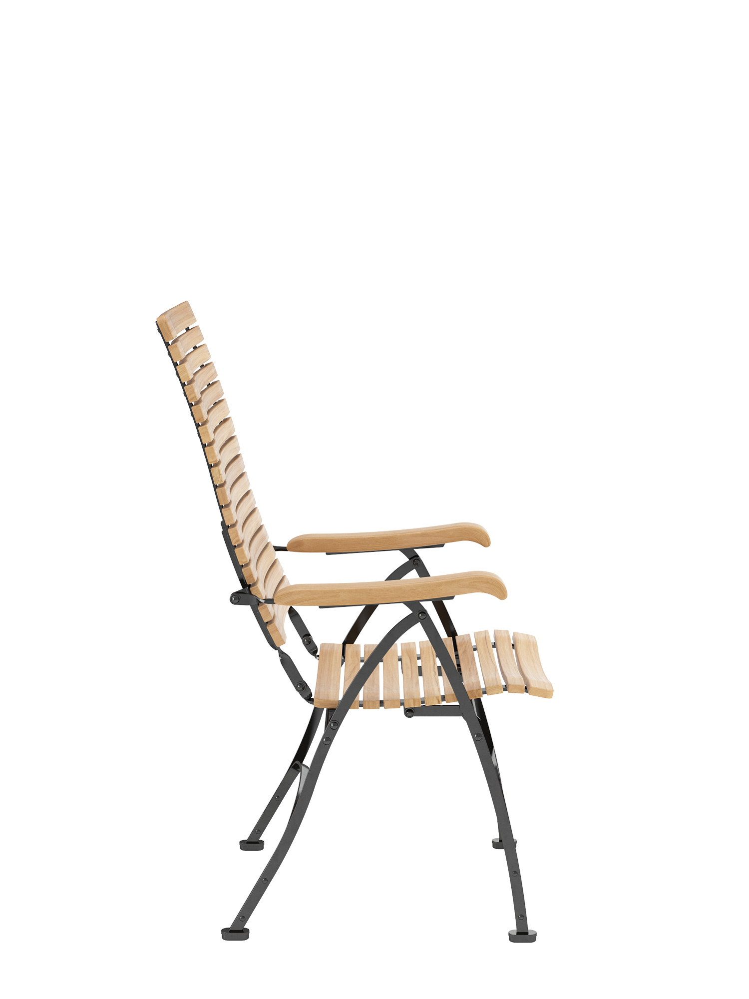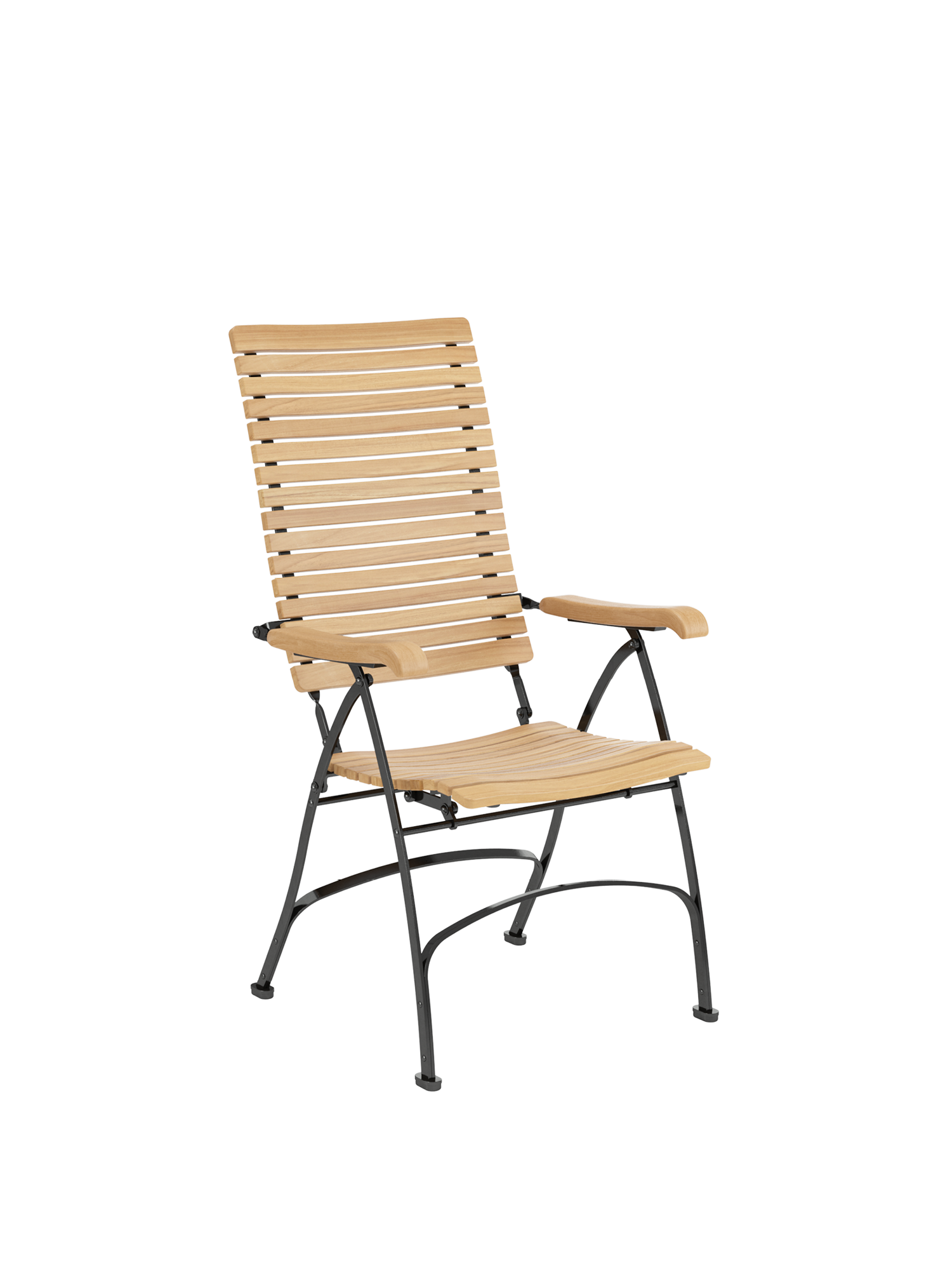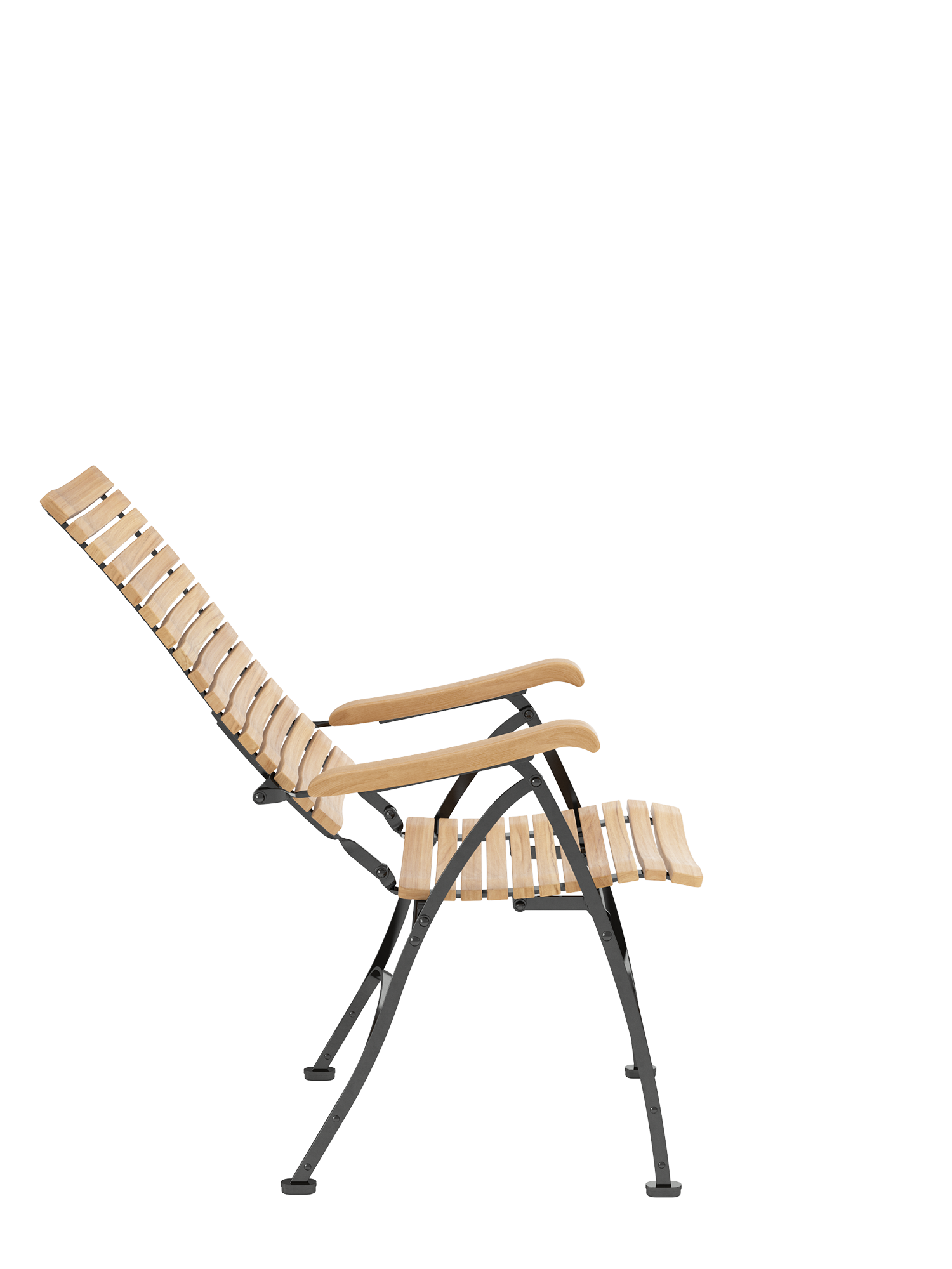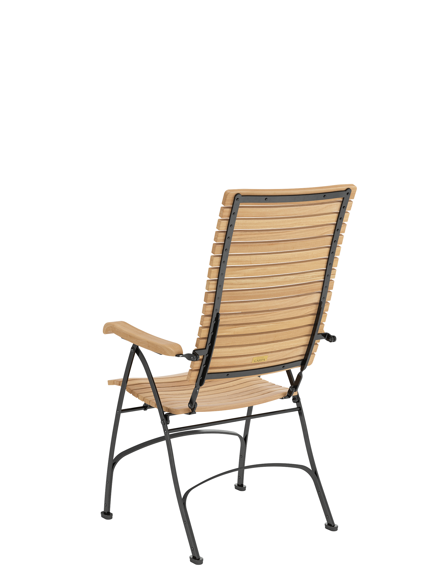Alle Drehverbindungen aus Edelstahlbolzen sind rostfrei gelagert - für eine dauerhafte Funktion im Freien. Laufrollen aus hochwertigem Polyamid, die unter der Sitzfläche angebracht sind, unterstützen leichtgängiges Klappen und schonen die beschichteten Metallteile. Die große Sitzfläche aus Teak ist dreidimensional geformt, so dass sie sich dem Körper anschmiegt. Vorn ist sie zur besseren Schenkelauflage abgerundet. Das Gestell besteht aus verzinktem und damit rostgeschütztem Stahl, graphitschwarz pulverbeschichtet. Fußgleiter aus abriebfestem Kunststoff schützen wertvolle Böden vor Kratzern.