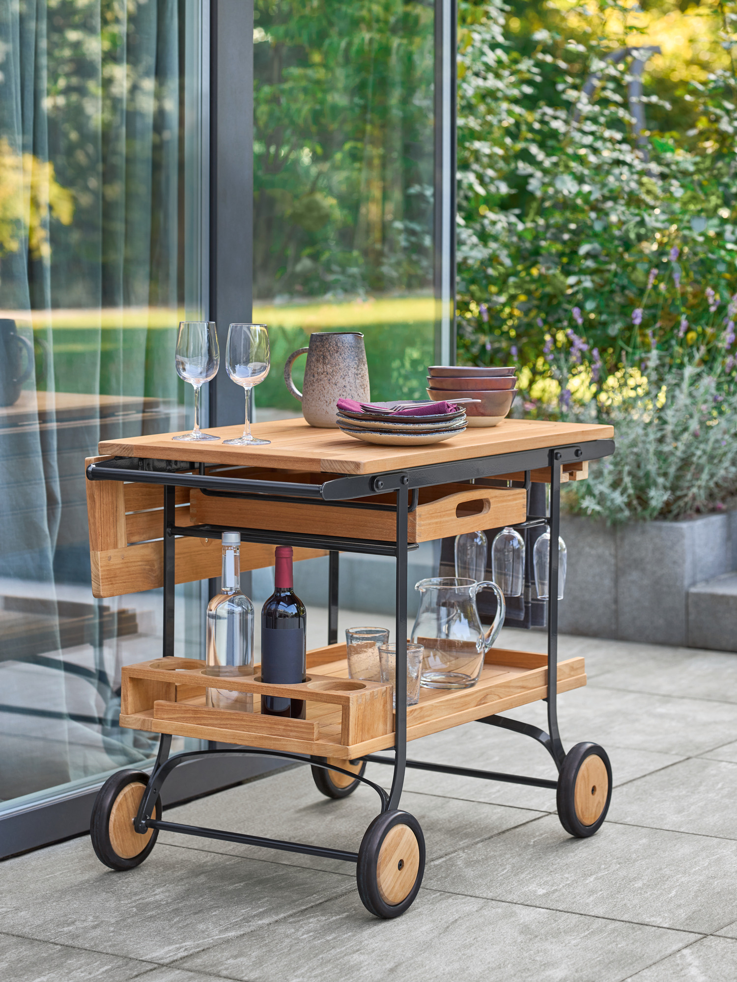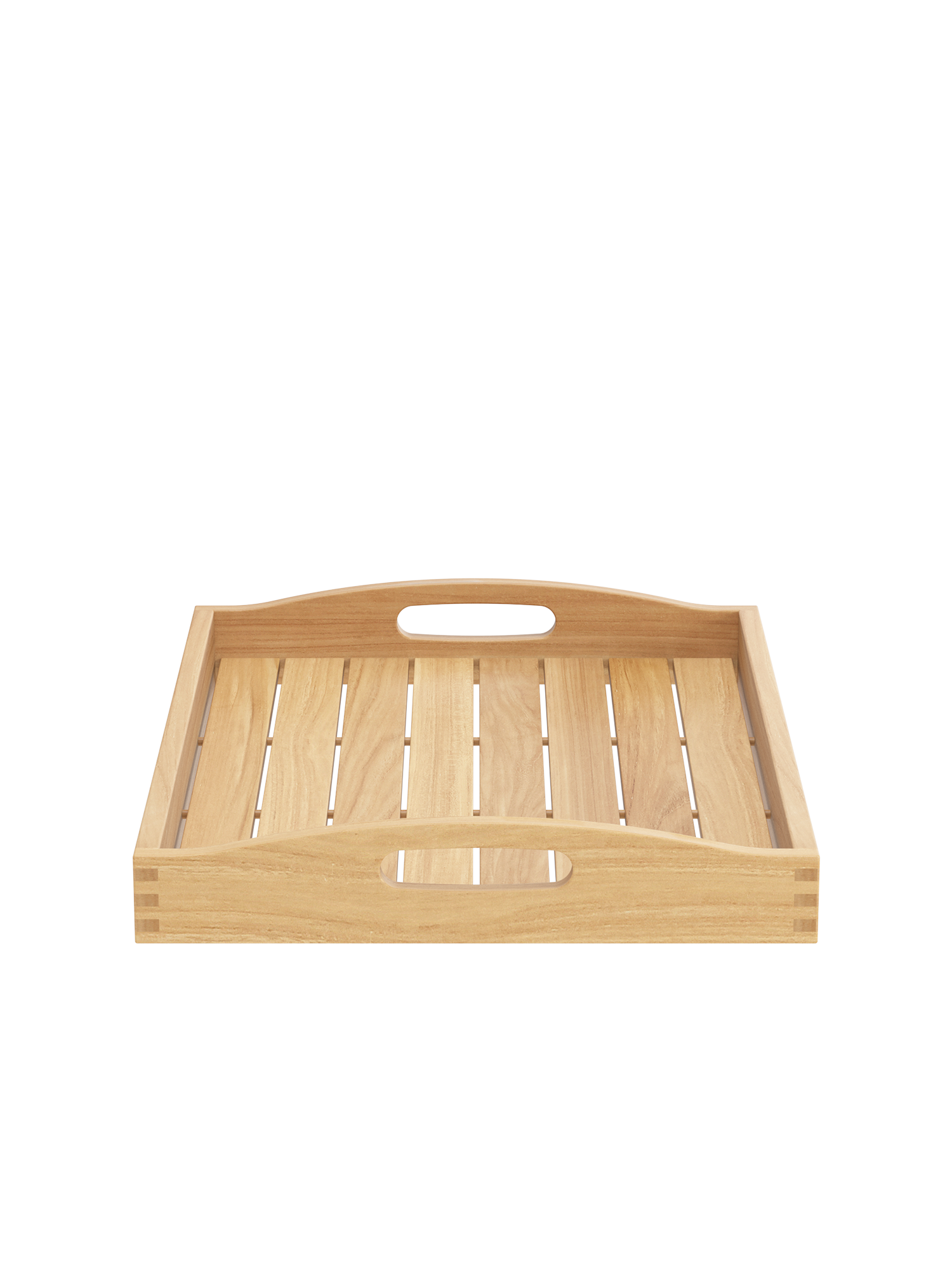 Das Tablett des Barwagens der Fontenay Kollektion ist als schönes Accessoire auch einzeln erhältlich. Es besteht aus massivem Teak.