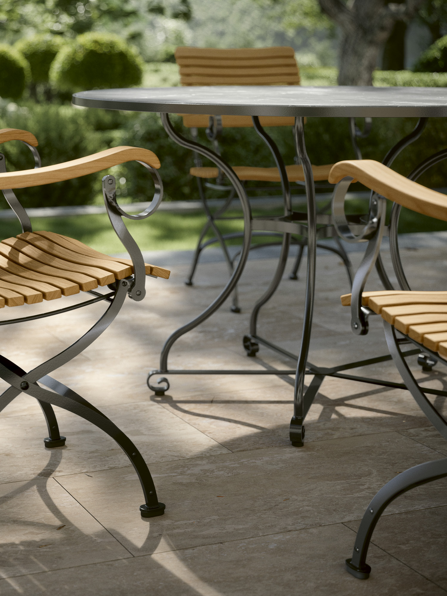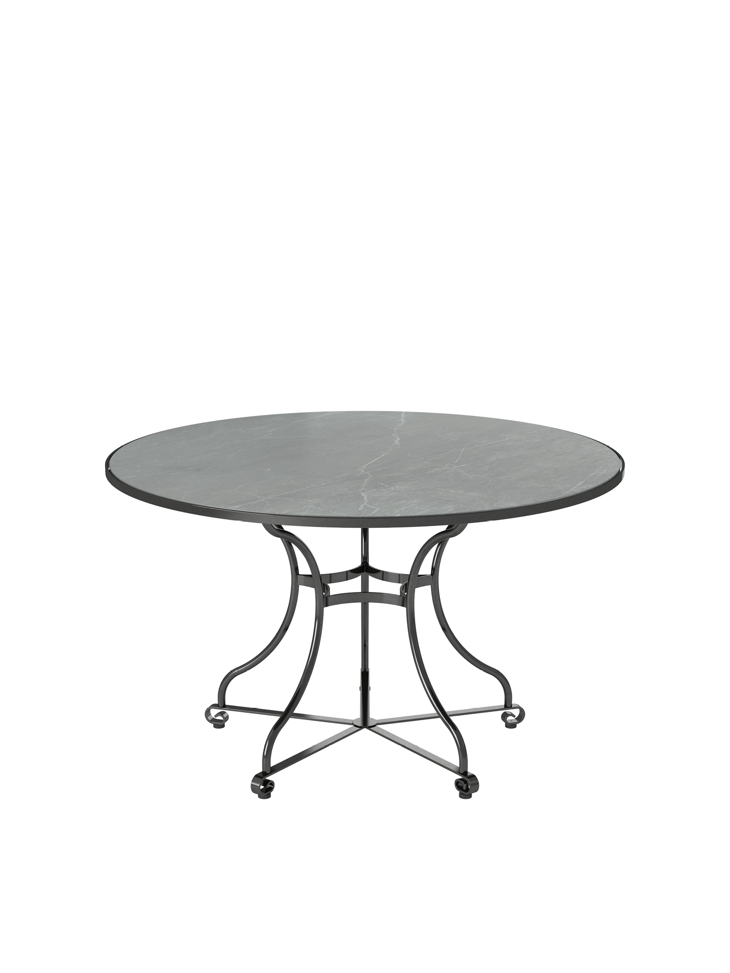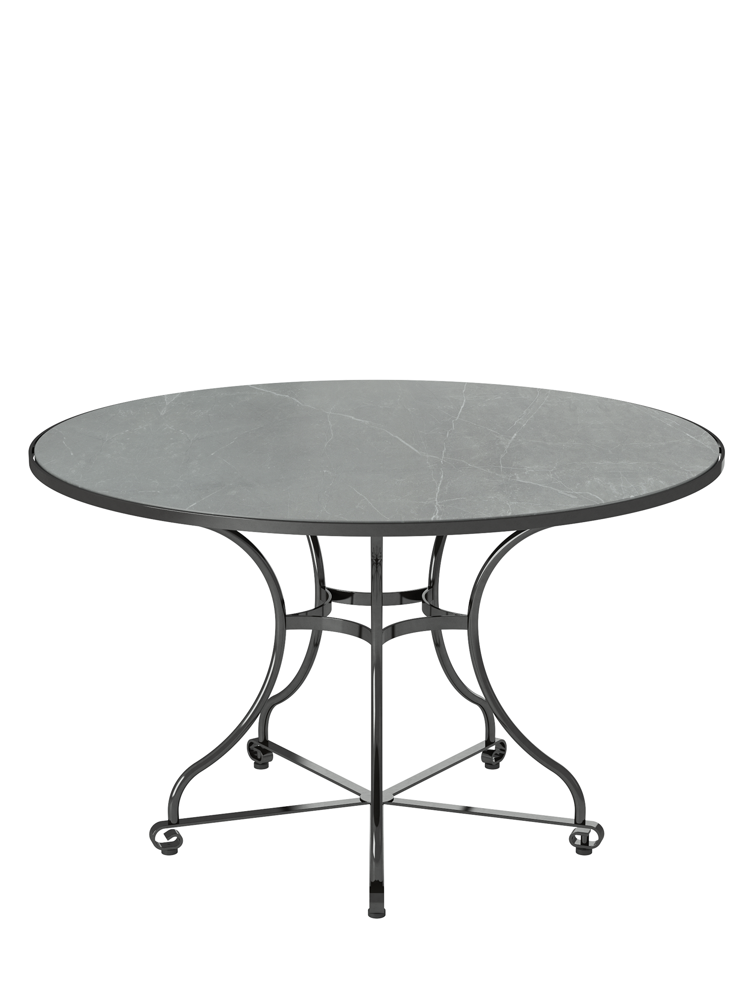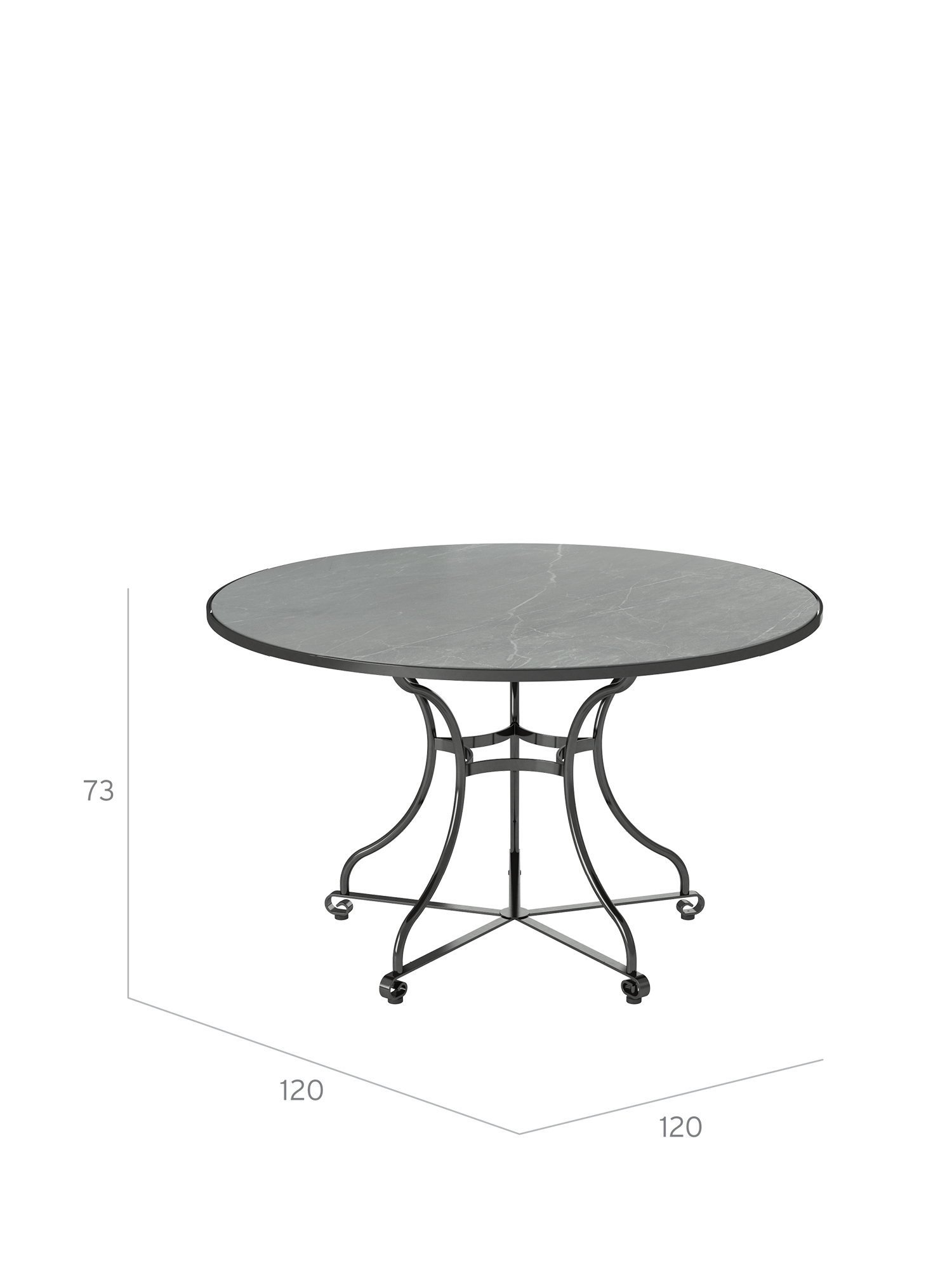 Die mattgraue Keramikplatte mit der Anmutung dekorativ gemaserten Marmors verleiht dem klassischen Gartentisch einen edlen Akzent.