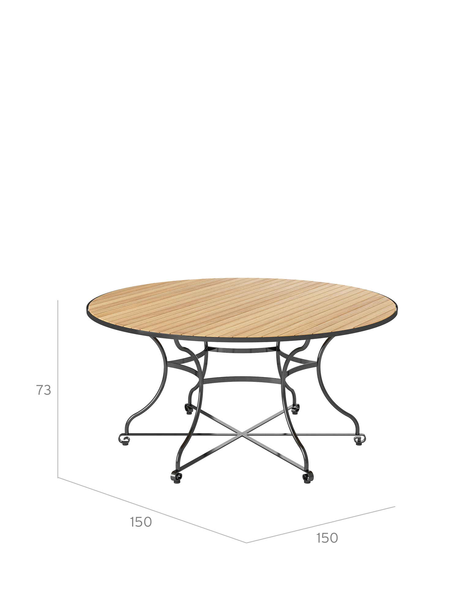 Für ein Treffen in großer Runde: Die Fontenay Tische mit einer Oberfläche aus Plantagenteak laden mit selbstverständlicher Eleganz zur Tafel. Das hochwertige Material widersteht problemlos Regen und Sonneneinstrahlung, Temperaturschwankungen und Frost. Im Laufe der Zeit entwickelt das Holz durch Witterungseinflüsse eine natürliche silbergraue Patina. Alle Fontenay Tische haben ein Gestell aus verzinktem, pulverbeschichtetem Stahl, die Tischplatte wird von einem Stahlreif gefasst. Fußgleiter aus abriebfestem Kunststoff gleichen Unebenheiten aus und schützen wertvolle Böden.