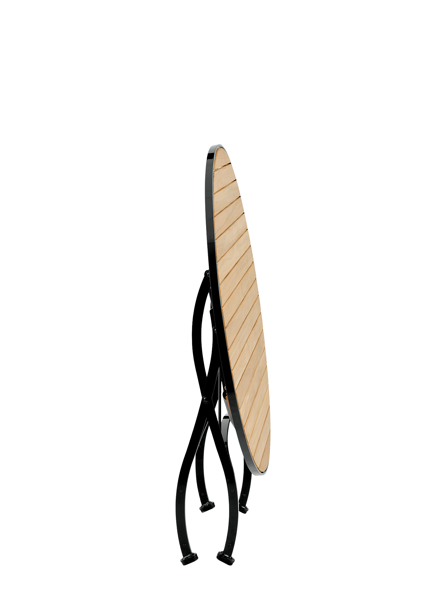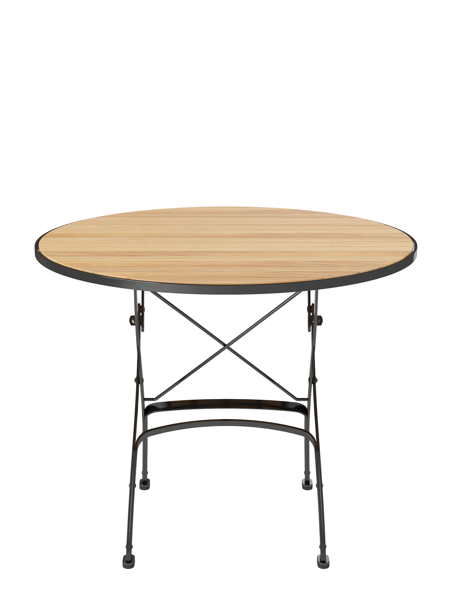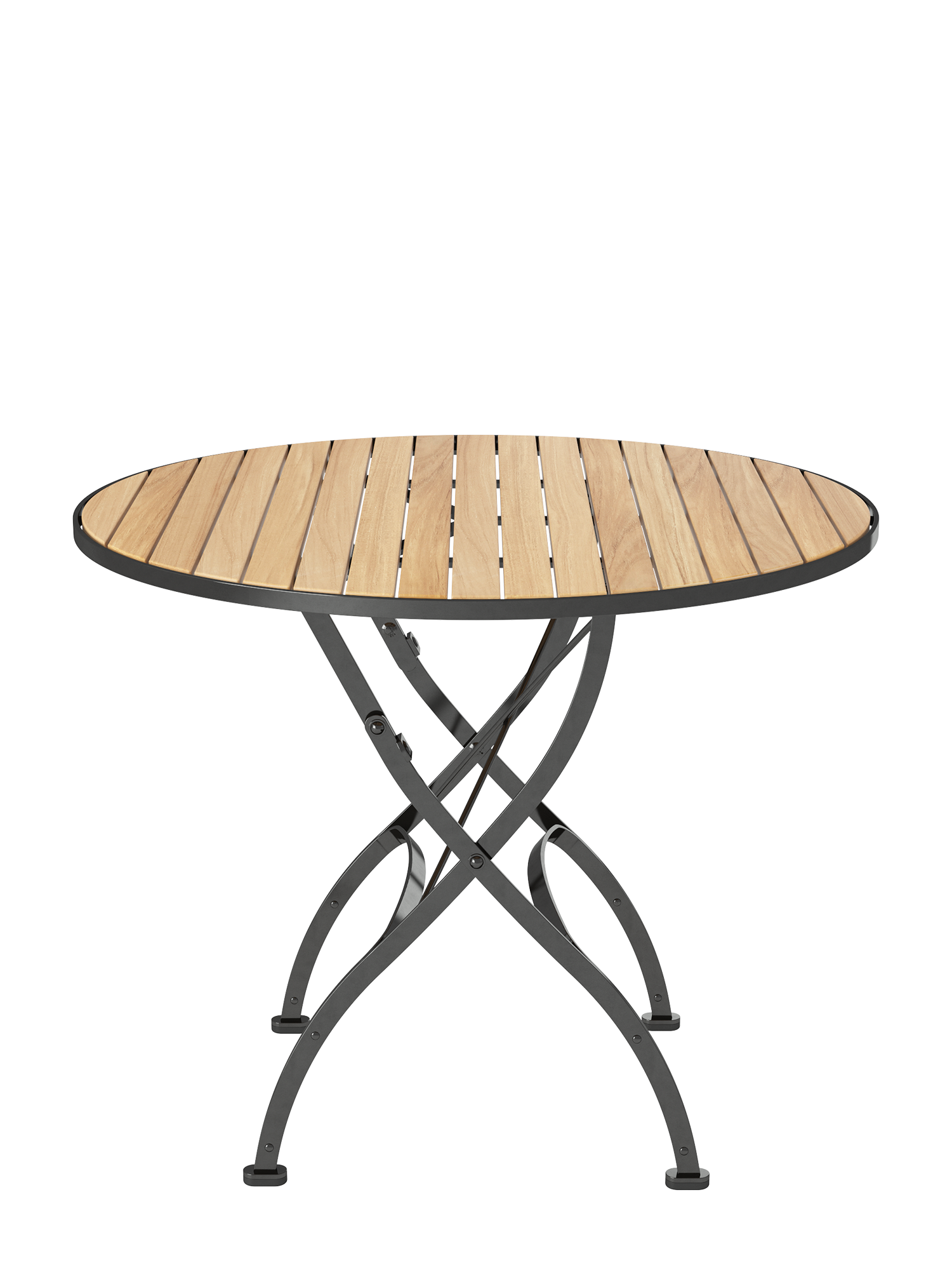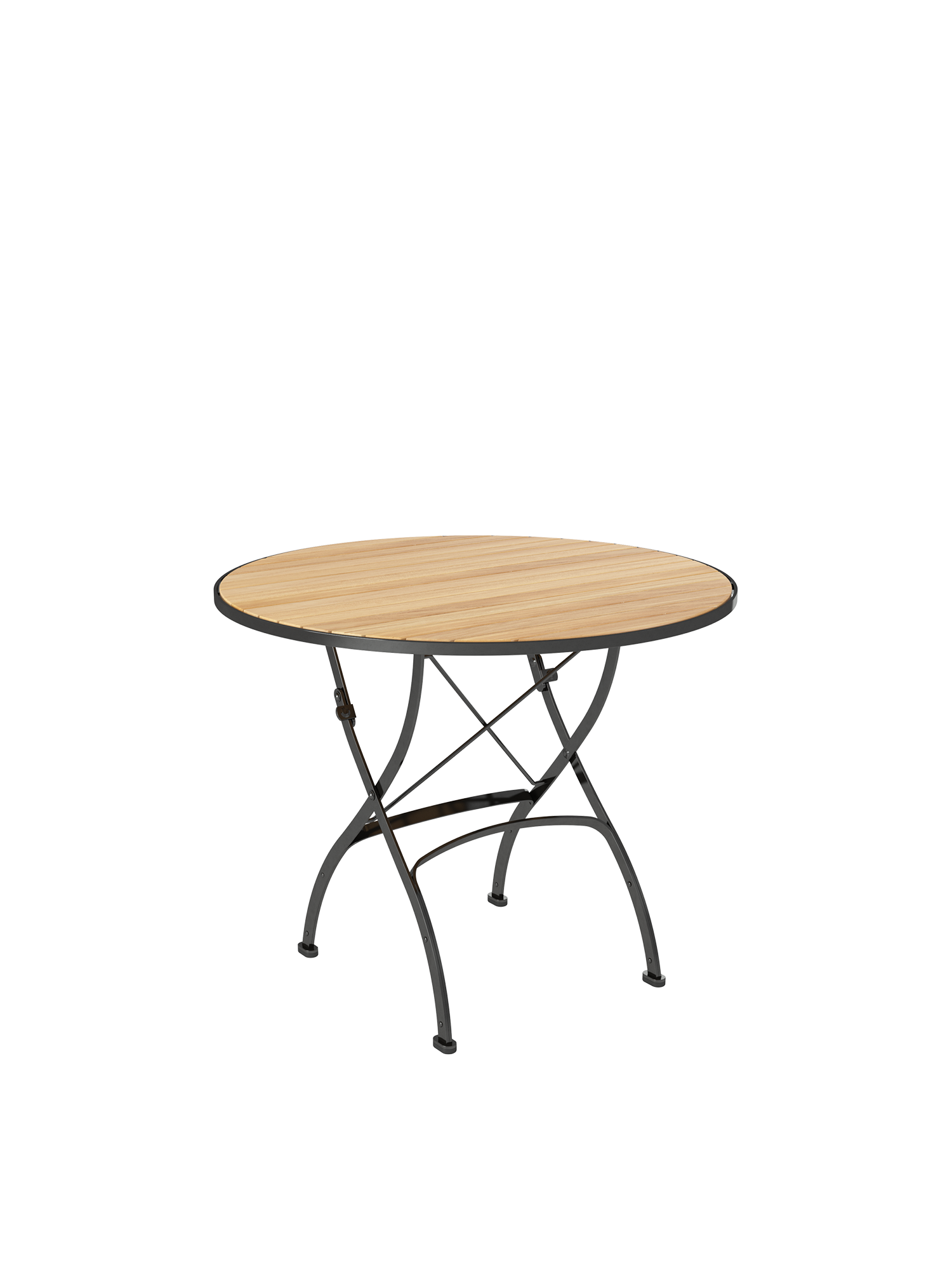 Präzise bearbeitete Leisten aus massivem Plantagenteak prägen die edle Anmutung des klappbaren Gartentisches der Fontenay Kollektion, der sich platzsparend verstauen lässt.