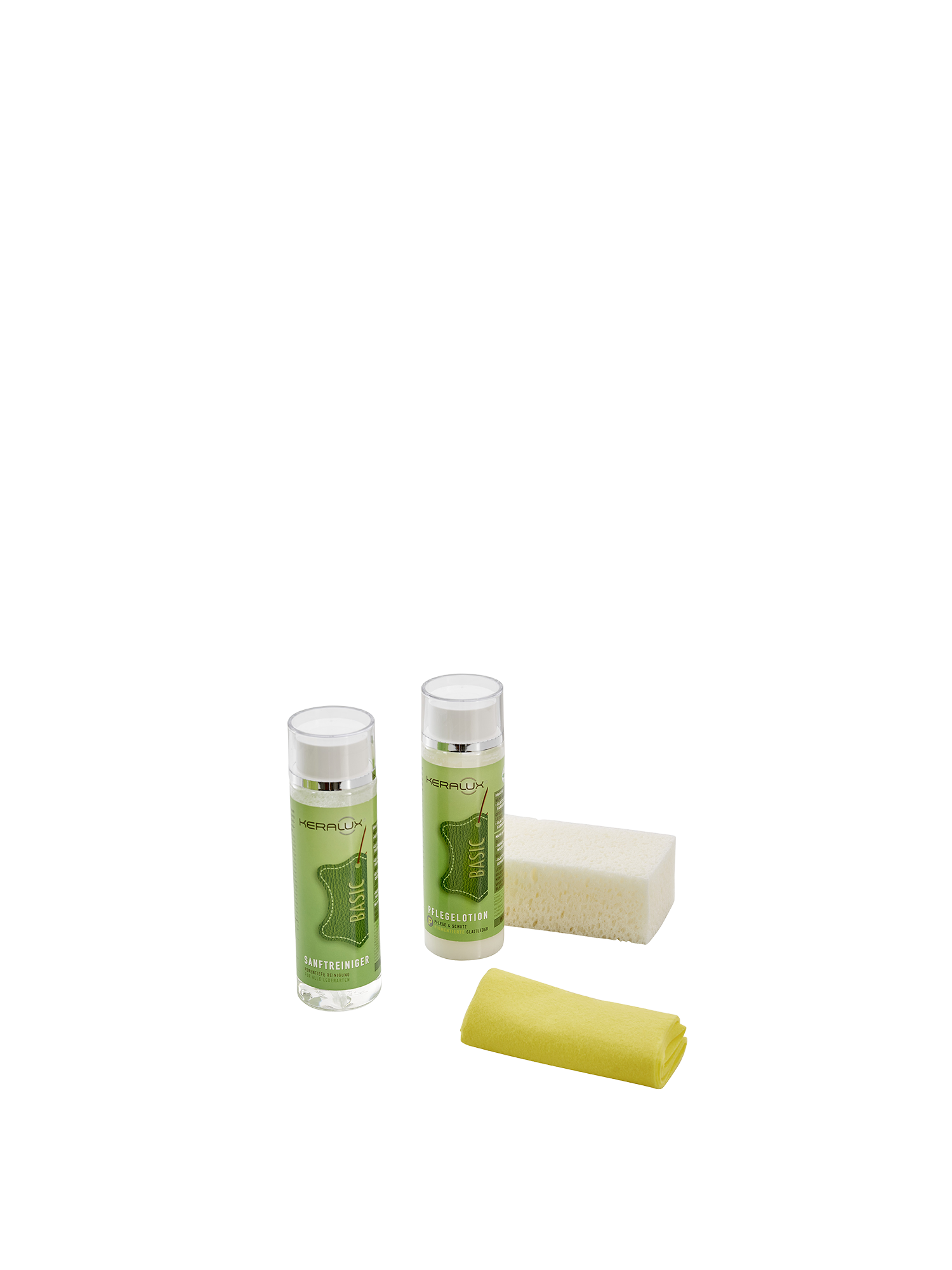 - enthält: 200 ml Sanftreiniger, 200 ml Pflegelotion, Schwamm, Tuch