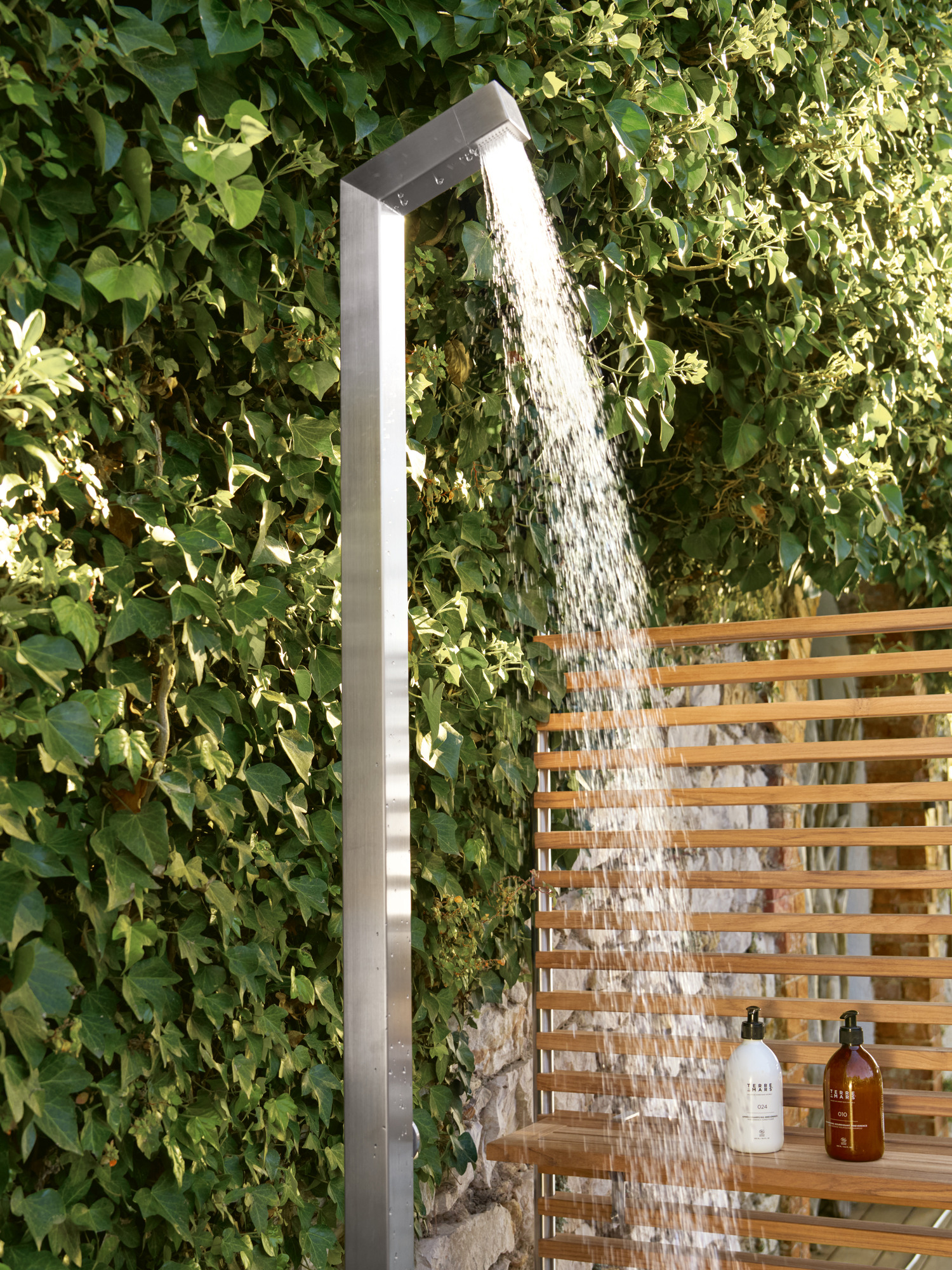 Die Gartendusche schont insofern Ressourcen, als auch kalt – ohne Gas- oder Stromanschluss – geduscht werden kann und das verbrauchte Wasser dem Garten zugutekommt, statt ins Abwasser zu fließen. Um den Boden nicht zu belasten, empfehlen wir eine Dusche mit Naturseife.