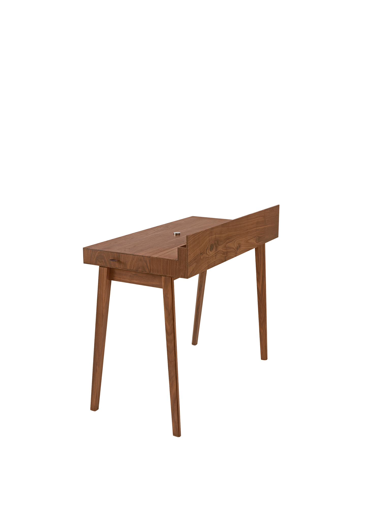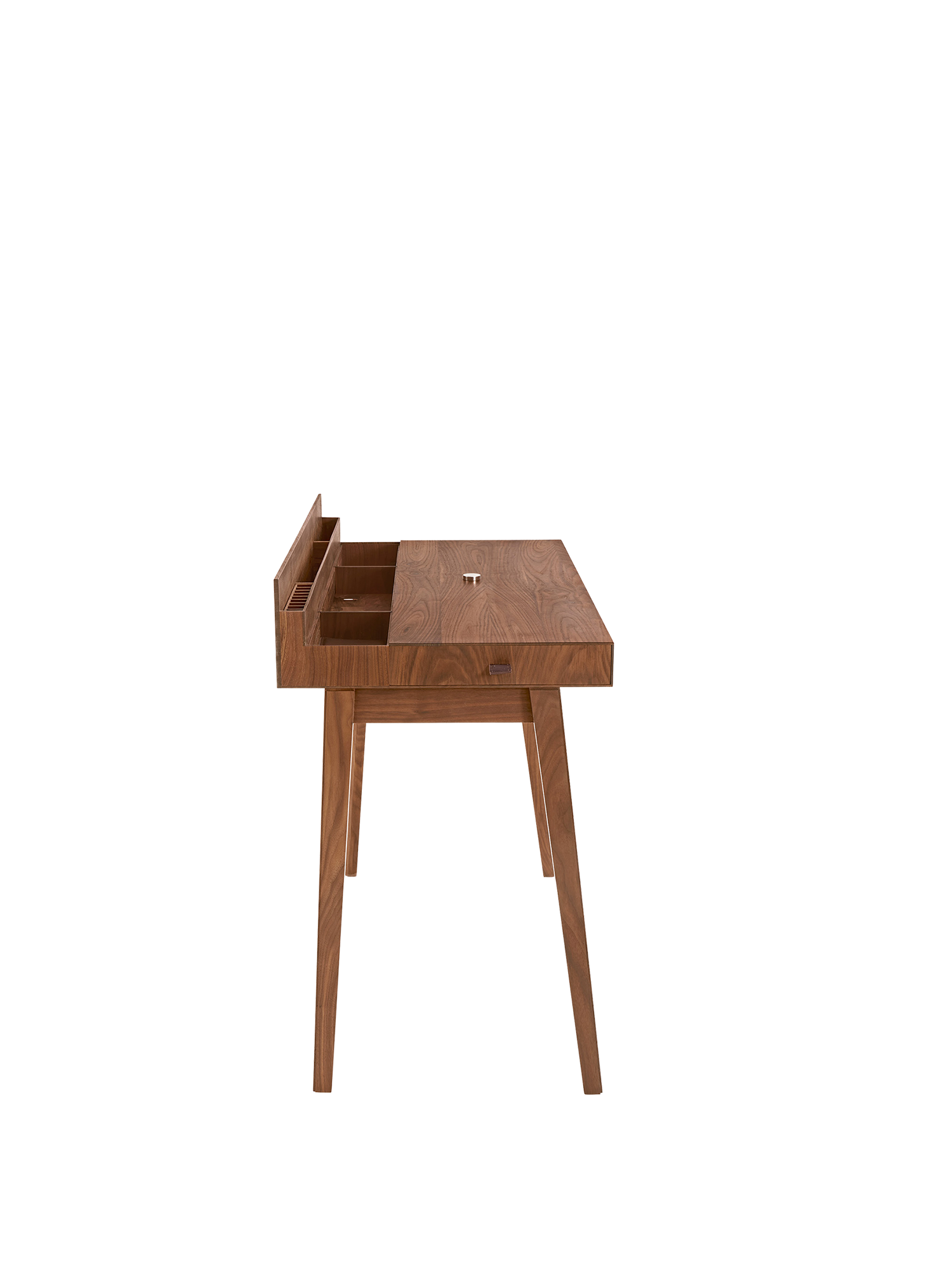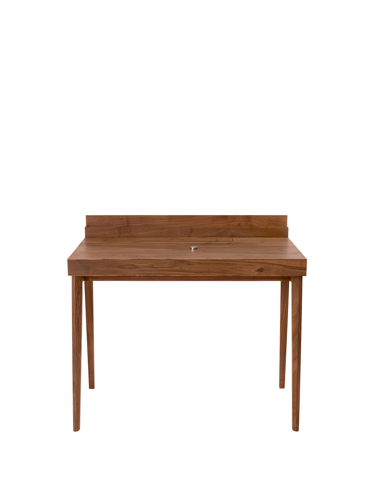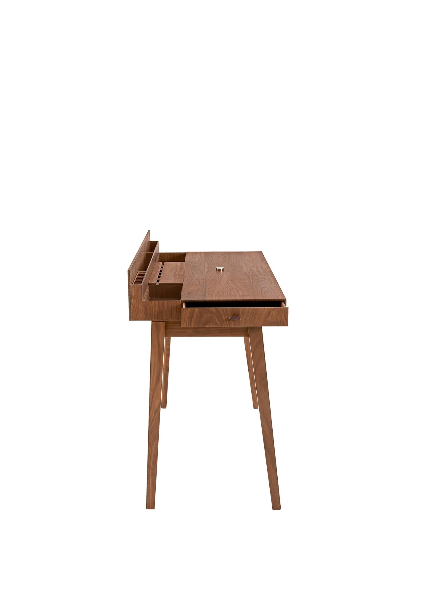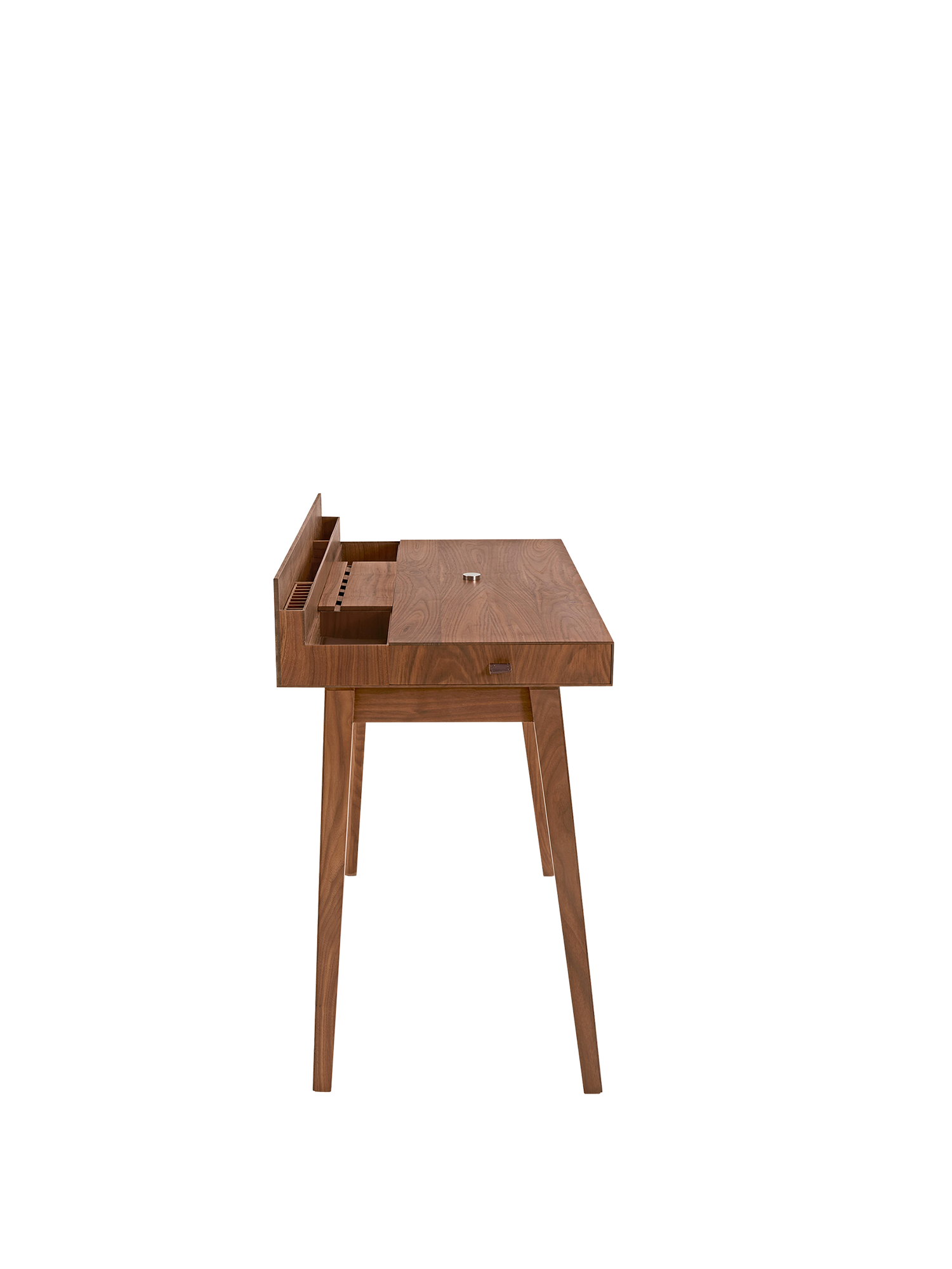 Im Sekretär aus amerikanischem Nussbaum hat diese Weisheit perfekte Gestalt angenommen. Zwei seitliche Schubladen, ein abgedecktes Fach in der Tischplatte mit einer Öffnung für Kabel, ein Behälter für Stifte, eine Ablage fürs Mobiltelefon und ein mittels Magnet zu öffnendes Geheimfach bieten jedenfalls beste Voraussetzungen.