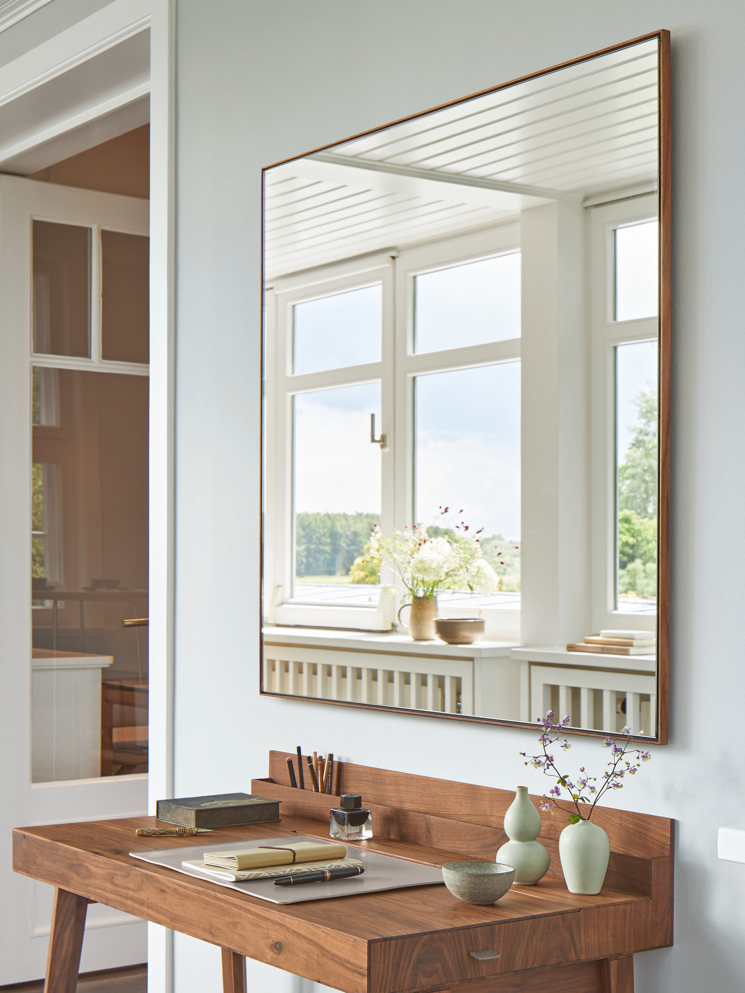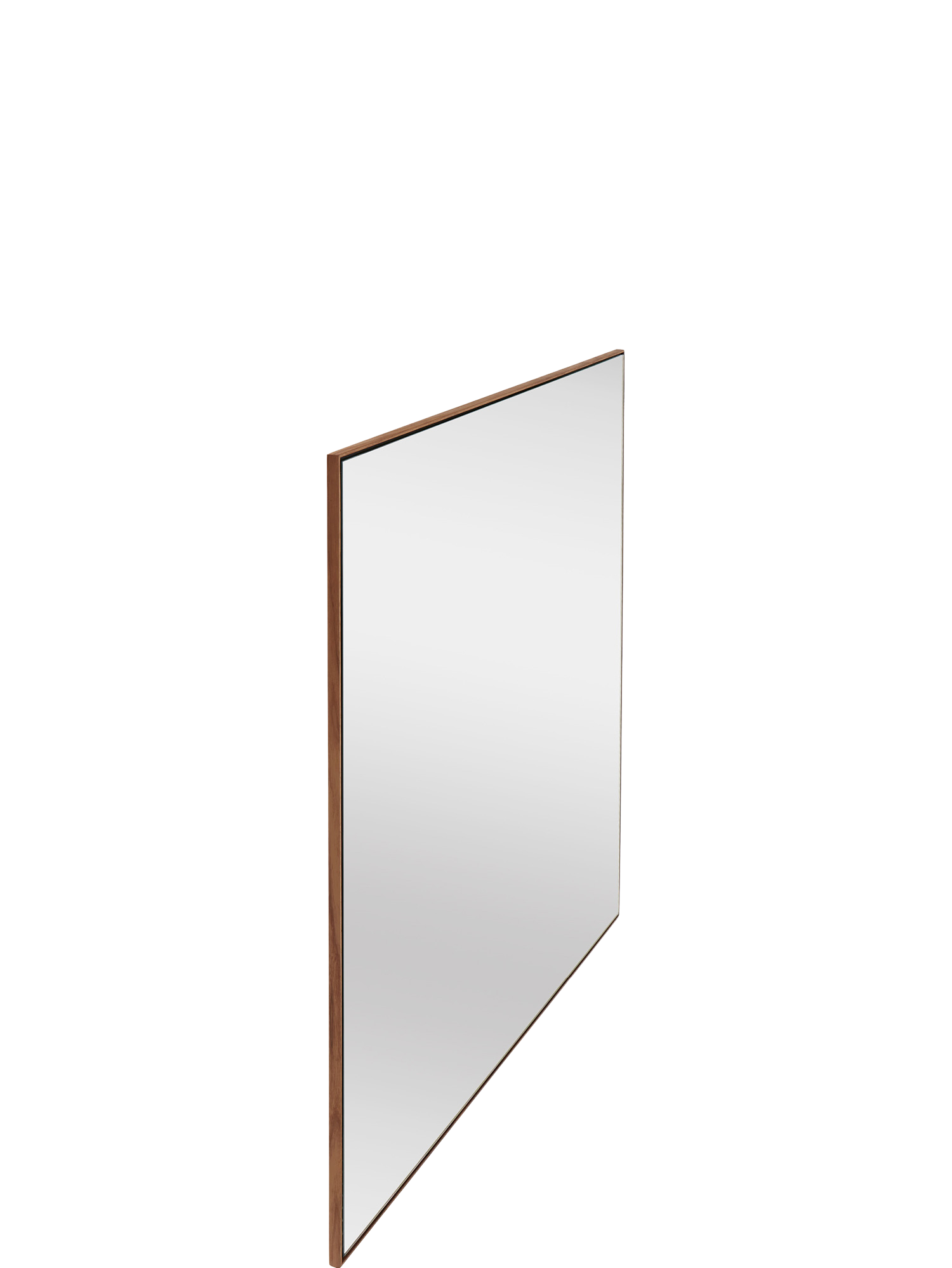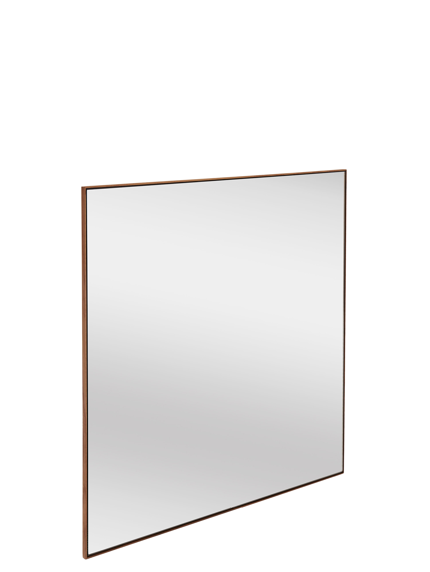 Ein Blickfang in wohnlichen Innenräumen: Der große quadratische Spiegel der Garvo Serie hat einen schmalen Rahmen aus amerikanischem Nussbaum.