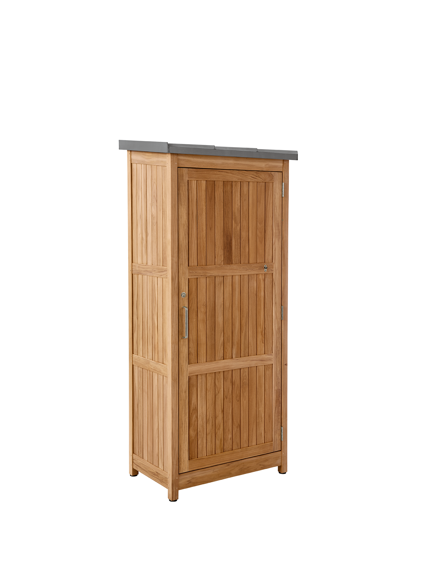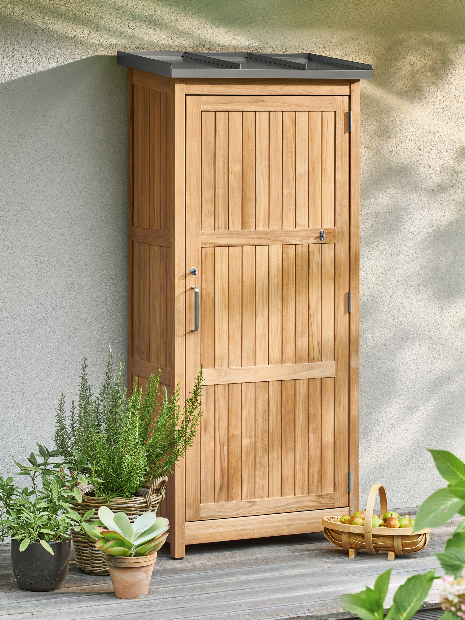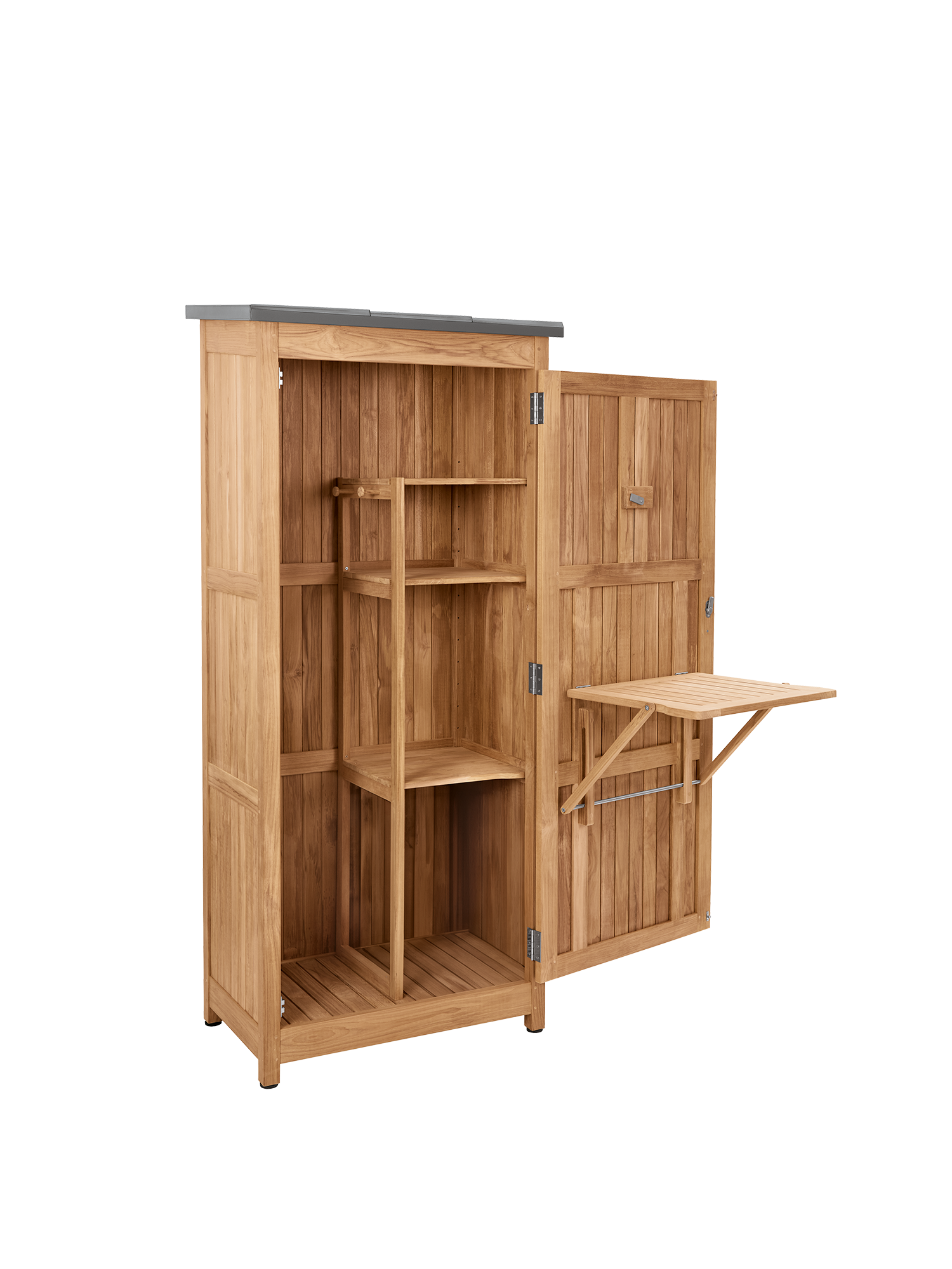 Der Geräteschrank aus Teak bietet viel Platz für all die Dinge, die im Garten schnell zur Hand sein sollen.