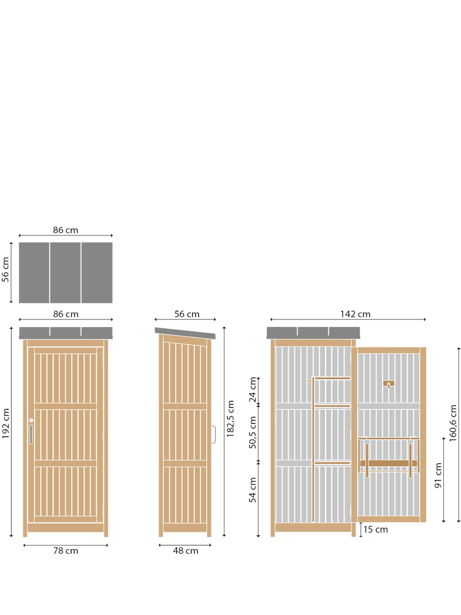 Mehrere Regalböden, Haken und ein praktischer Klapptisch sorgen für Stauraum und zusätzliche Arbeitsfläche. Das Dach des verschließbaren Geräteschranks besteht aus verzinktem, pulverbeschichtetem Stahl, die Beschläge sind aus Edelstahl.