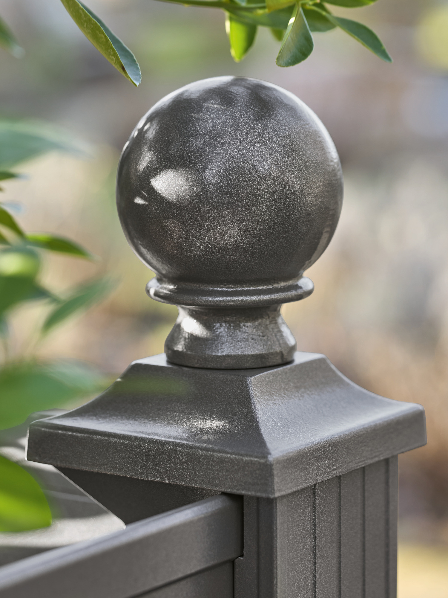 Von Kugeln gekrönt und von starken Füßen getragen demonstrieren die säulenartigen Eckelemente des Grenoble Pflanzkübels Standfestigkeit. Elegant und robust wirkt der Blumenkübel dank des grauen pulverbeschichteten Aluminiums. Ein filigranes Hochrelief auf der Vorderseite zeigt das Garpa Stammhaus.