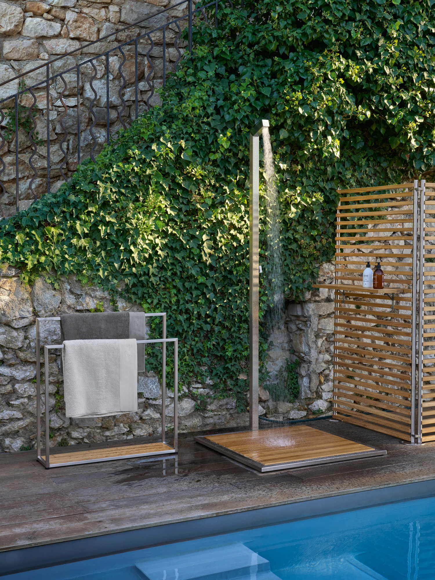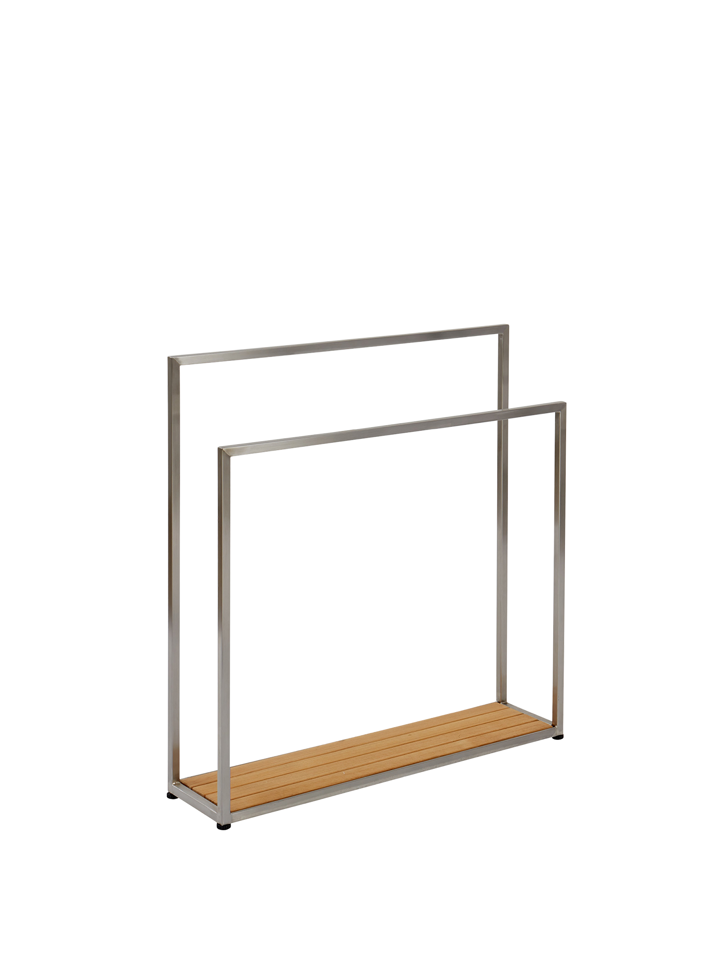 Der geradlinige Handtuchhalter mit zwei gestaffelten Holmen aus Edelstahl hat einen Boden aus wetterfestem Teak. Höhenversteller sorgen für einen festen Stand.