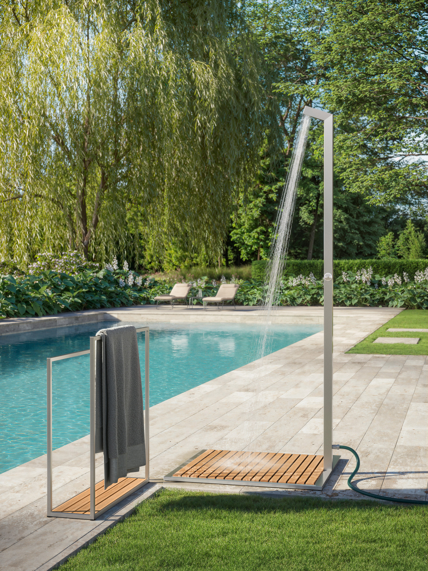 Neben der Gartendusche hält der praktische Halter flauschige Handtücher stets griffbereit.