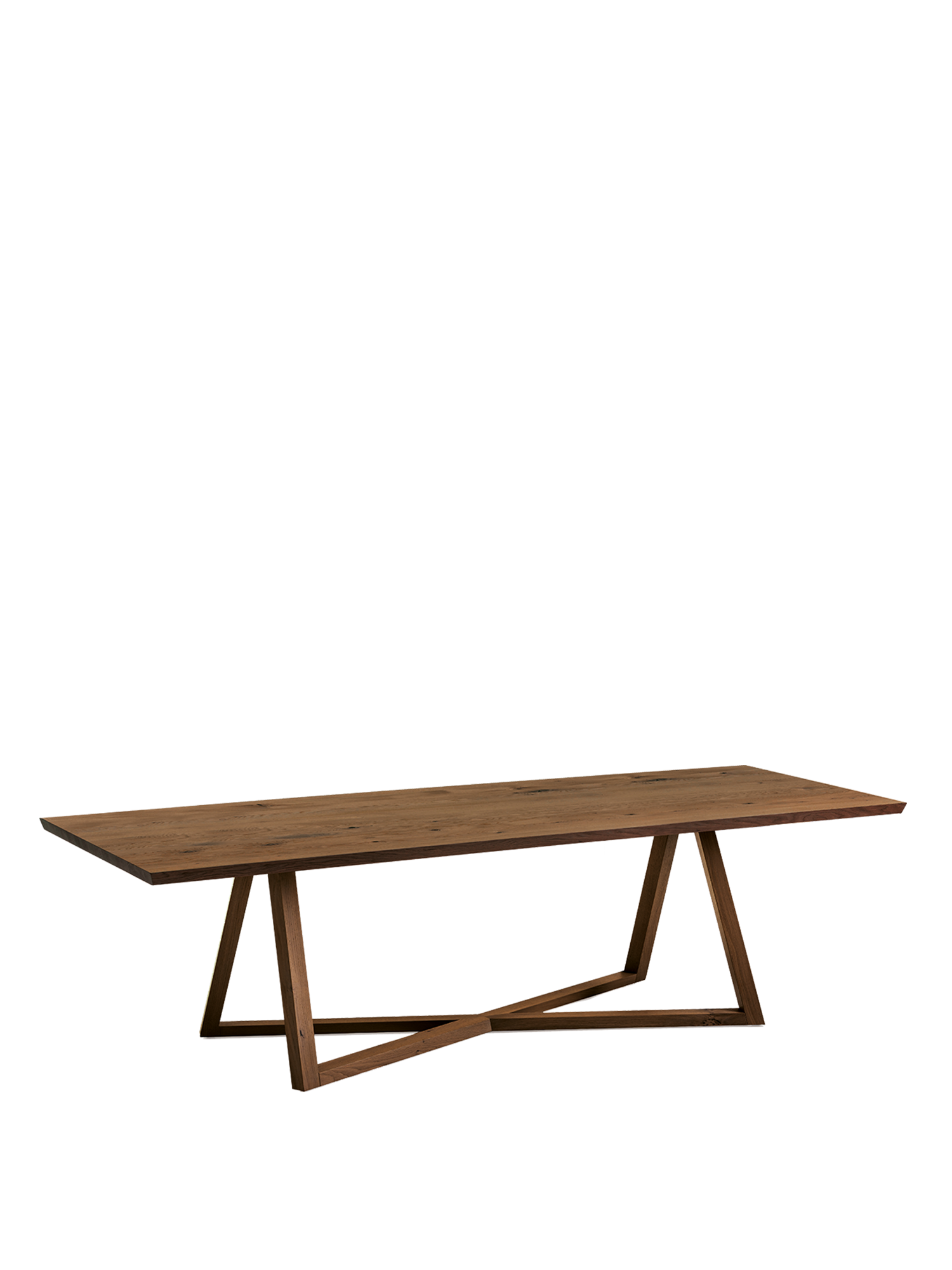 Mit einer Breite von drei Metern lädt der Hyde Tisch zum Dinner der besonderen Art. Sowohl die Oberfläche als auch das Gestell sind aus massivem Nussbaum gefertigt. Die zurückgestellten Beine gewähren angenehme Beinfreiheit. Pro Seite können zwei Hyde Sofas platziert werden, auf denen insgesamt acht Personen Platz finden. Auf Wunsch vergrößern zwei Teano Stühle die Sitzgruppe an den Tischenden.