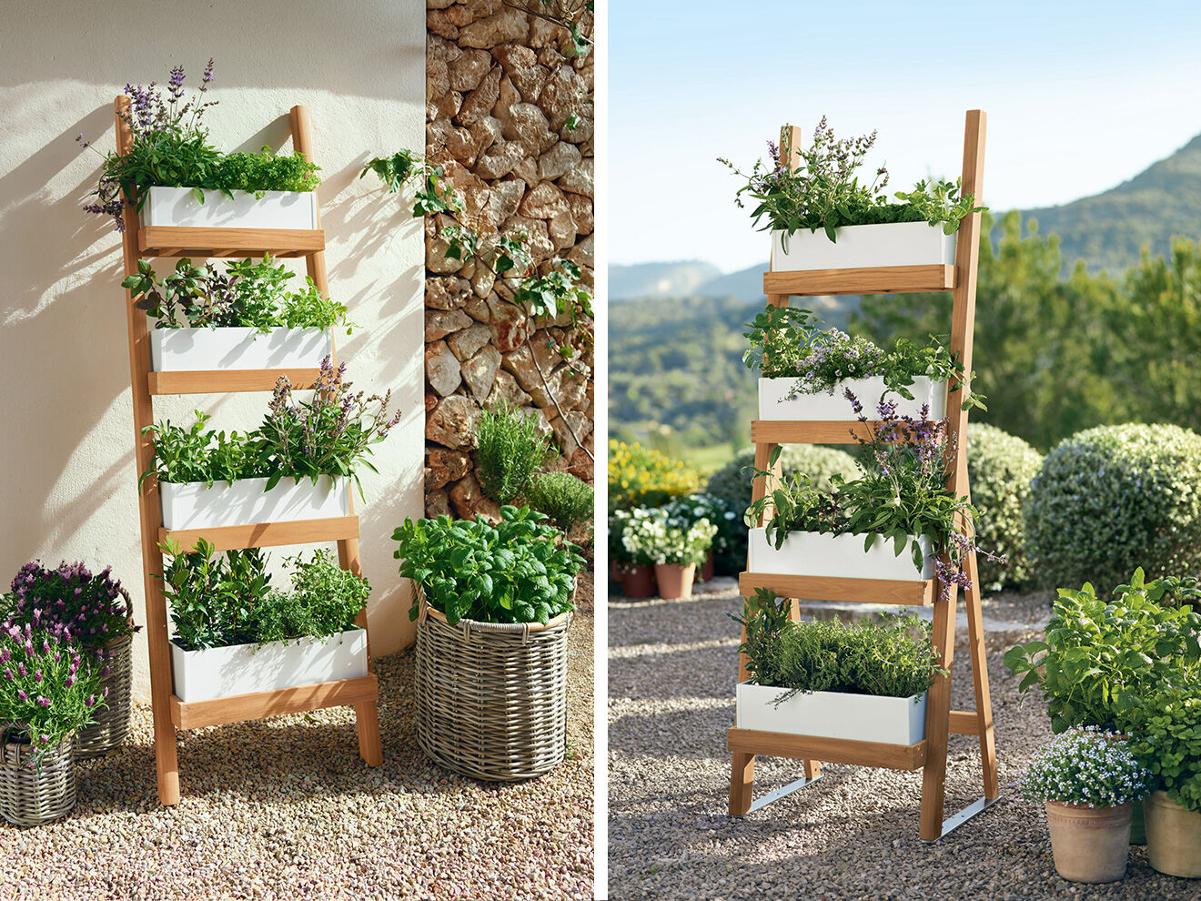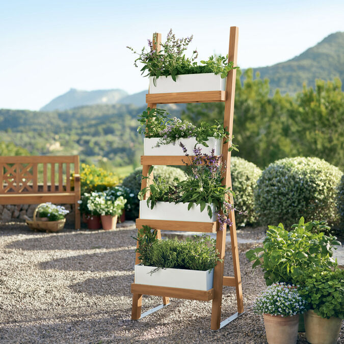 Gut aufgestellt: Mit jeder Stufe der aufstrebenden Normandie Pflanzleiter steigert sich der Genuss. Insbesondere Kräuter und niedrige Sommerblumen finden hier ideale Wachstumsbedingungen. Das Pflanzregal aus Teak mit vier mitgelieferten Pflanzkästen aus pulverbeschichtetem Aluminium in Weiß oder Graphit kann direkt an eine stabile Wand gelehnt oder mit einem optional erhältlichen Aufstellset frei platziert werden.