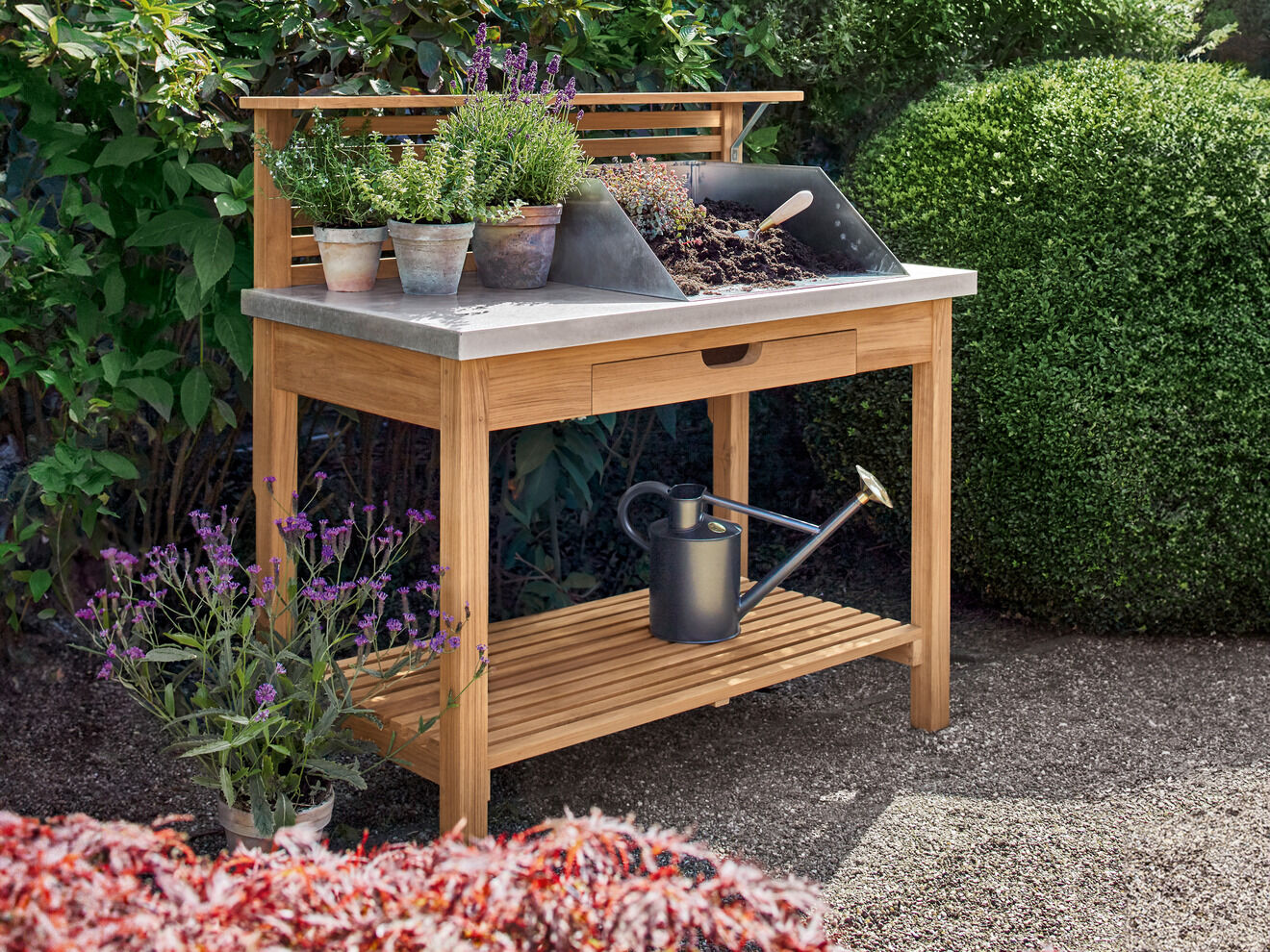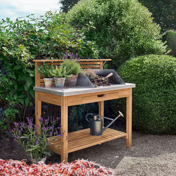Für alle vorbereitenden Maßnahmen empfiehlt sich der Pflanztisch mit einer bequemen Höhe von 90 Zentimetern. Wetterfest, aus hochwertigem Plantagenteak und mit einer Platte aus Zink bietet die klassische „Potting Bench“ eine komfortable Basis zum Umtopfen, Säen und Pikieren. Eine Schublade unter der Arbeitsfläche hat viel Platz für Schaufeln, Scheren und Samentütchen. Gießkannen, Pflanzgefäße und andere Hilfsmittel können auf dem unteren Regal verstaut werden. Eine Schütte aus Titanzink dient zum Anmischen der Gartenerde.