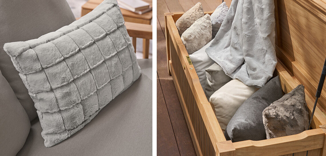 Feine Plaids aus hochwertigen Materialien umhüllen mit Wohlgefühl, kuschelige Kissen sind in verschiedenen Formen, Farben, Größen und Mustern erhältlich. Sie passen zu den Möbeln und Auflagen unserer Kollektion für den Innenbereich und lassen sich vielfältig kombinieren.