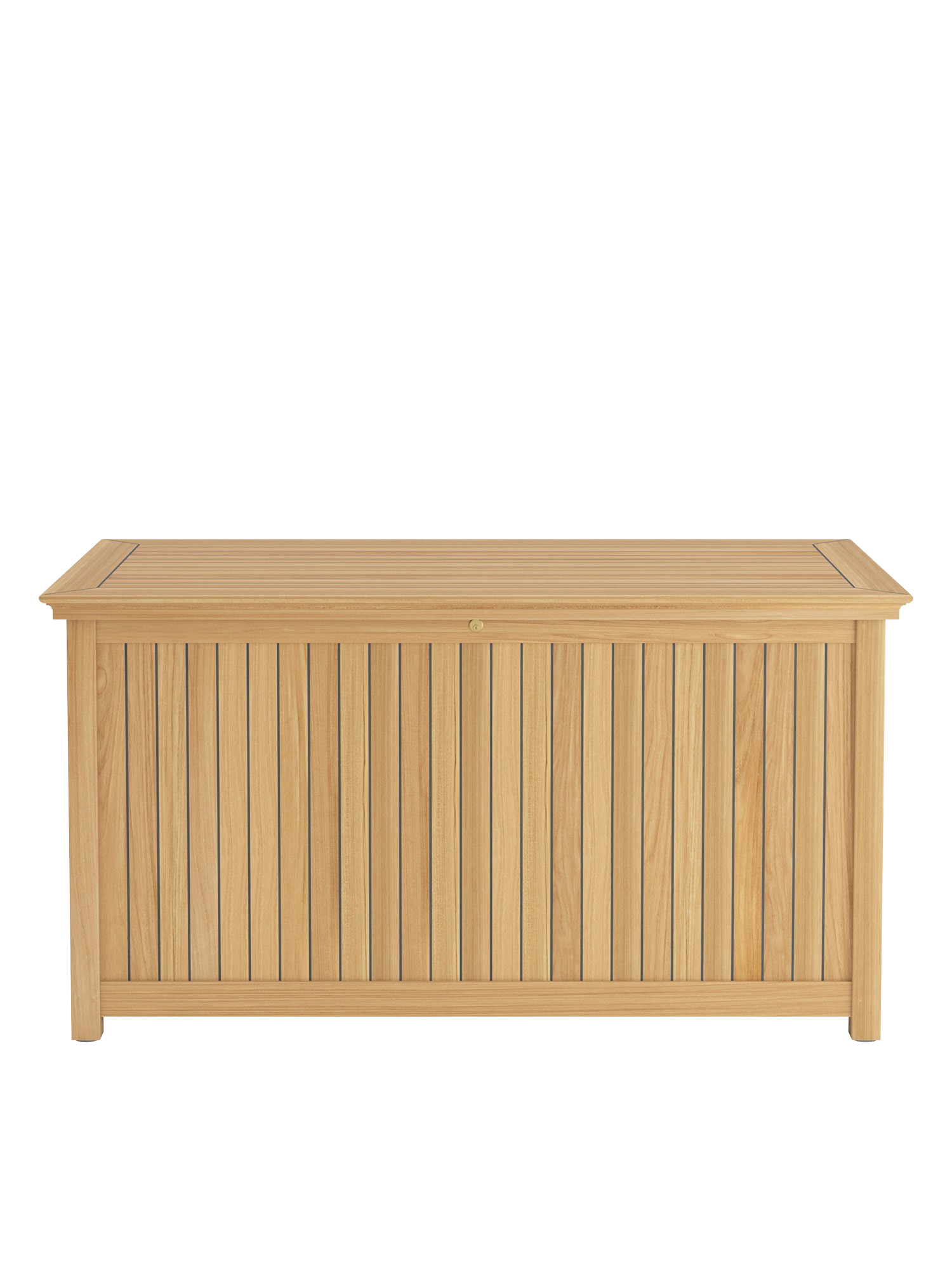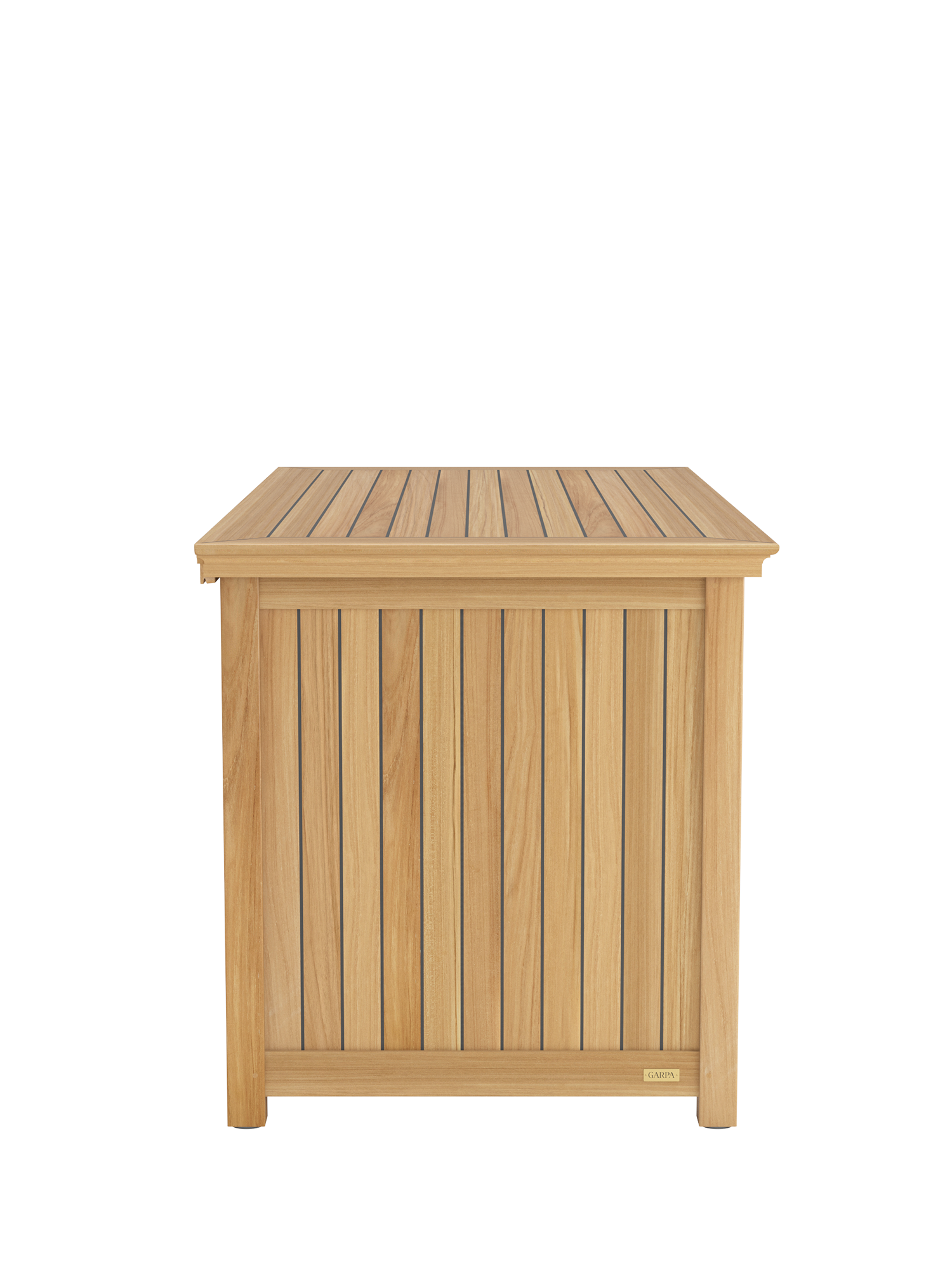 Die Kissentruhen für die Auflagen der Garpa Gartenmöbel zeigen sich perfekt in Form und Funktion. Alle konstruktiven Bauteile sind aus massivem Teak. Die Seiten und der Deckel bestehen aus wetterfestem Schichtholz, das mit 2,5 mm starkem Teak furniert und wie die Decksplanken von Hochseeyachten verfugt ist. Schloss und Scharniere sind aus hochwertigem Messing.