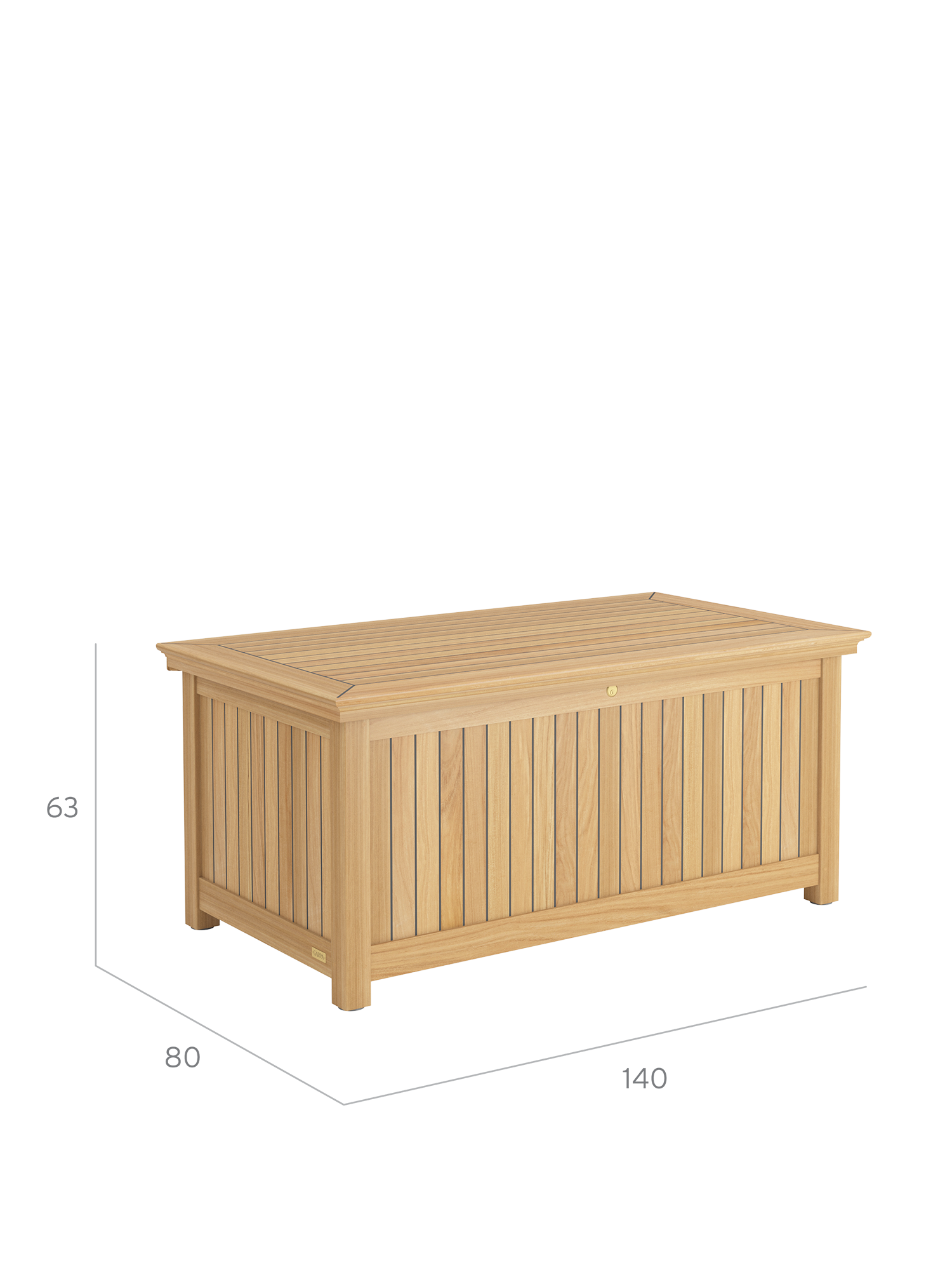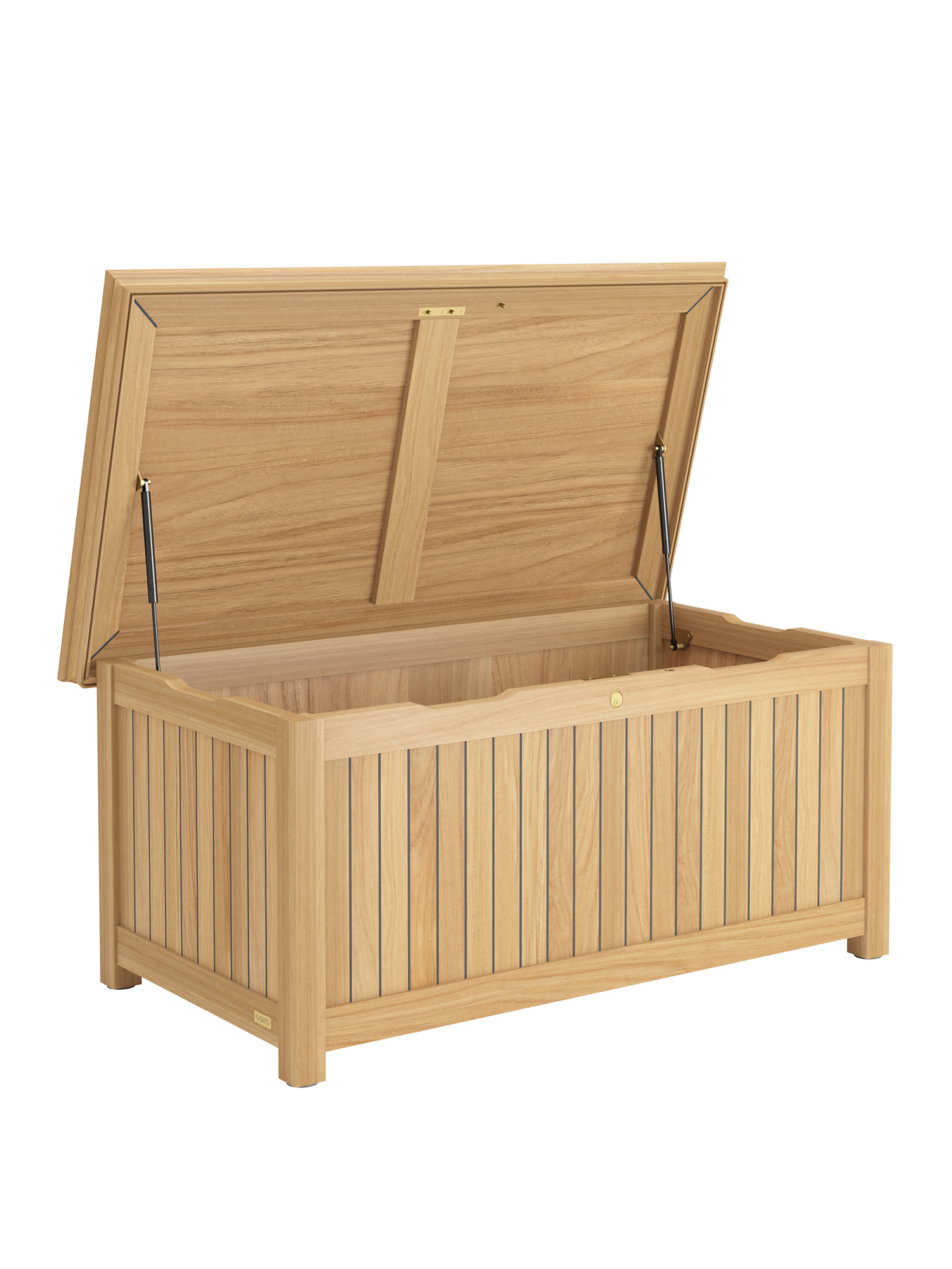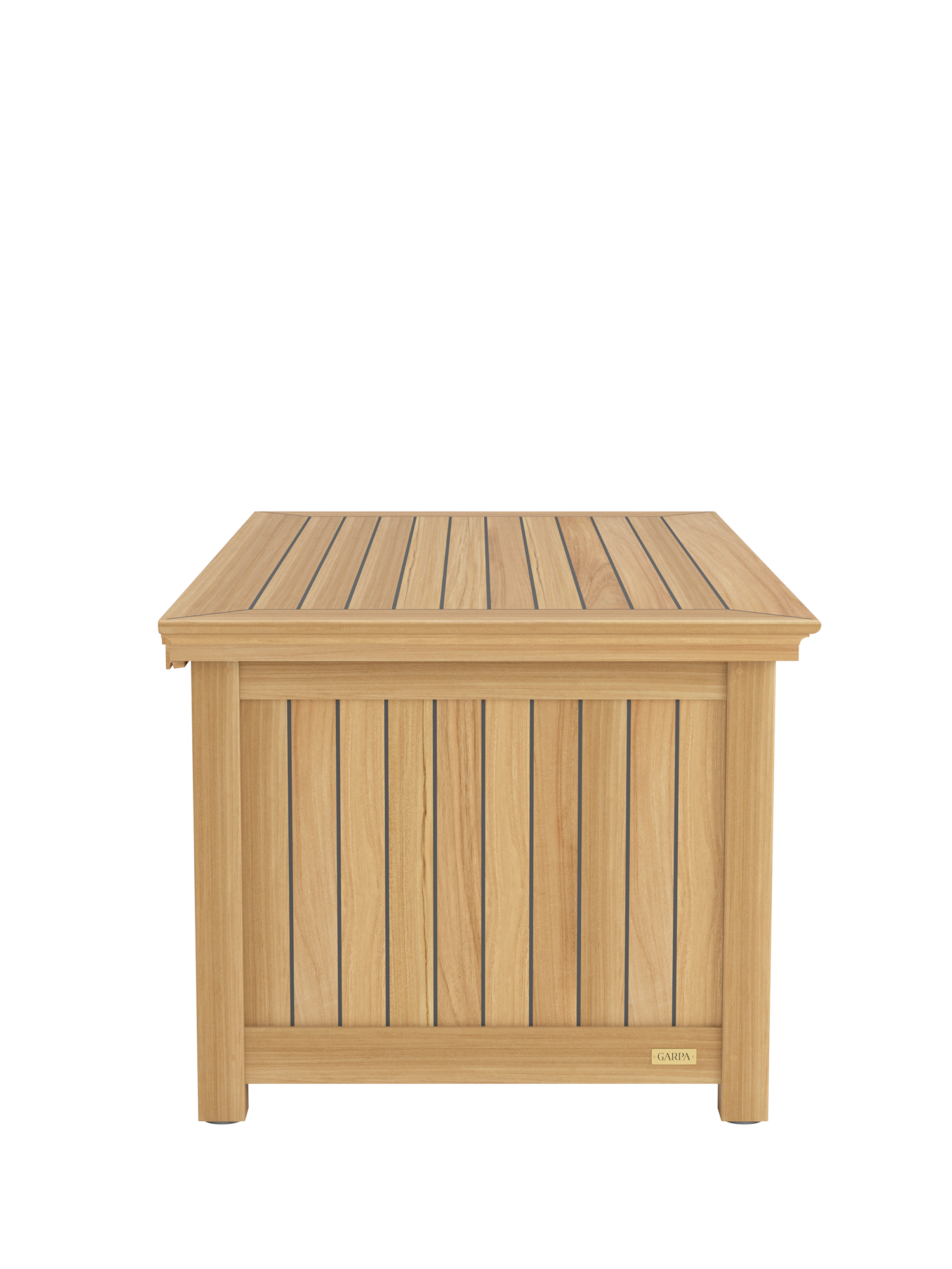 Die Kissentruhen für die Auflagen der Garpa Gartenmöbel zeigen sich perfekt in Form und Funktion. Alle konstruktiven Bauteile sind aus massivem Teak. Die Seiten und der Deckel bestehen aus wetterfestem Schichtholz, das mit 2,5 mm starkem Teak furniert und wie die Decksplanken von Hochseeyachten verfugt ist. Schloss und Scharniere sind aus hochwertigem Messing.