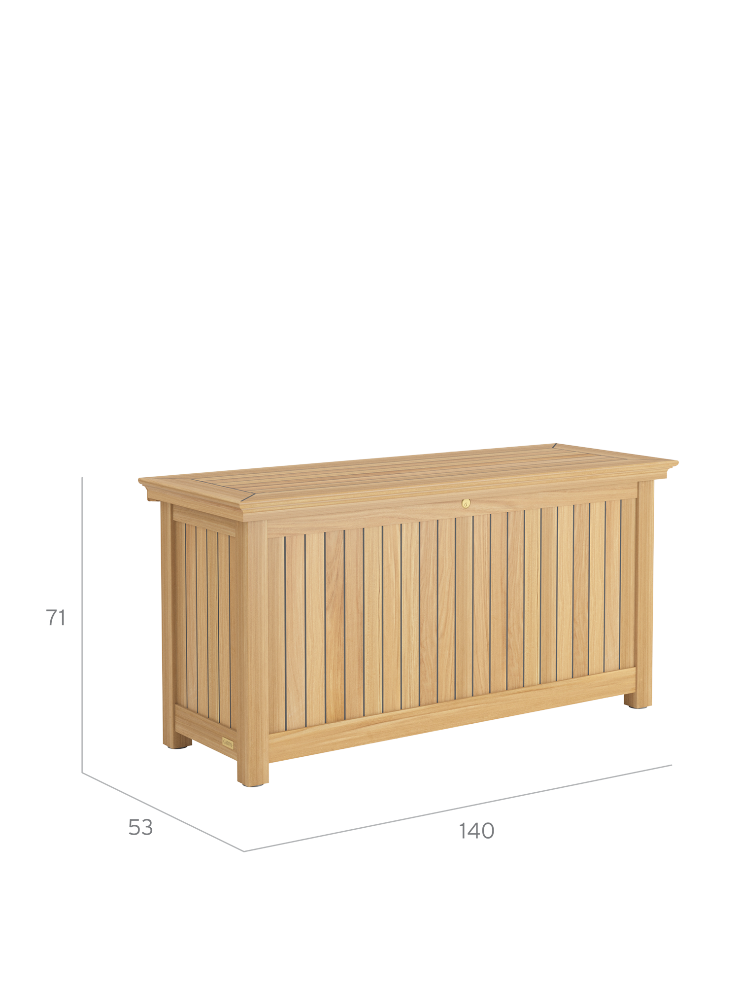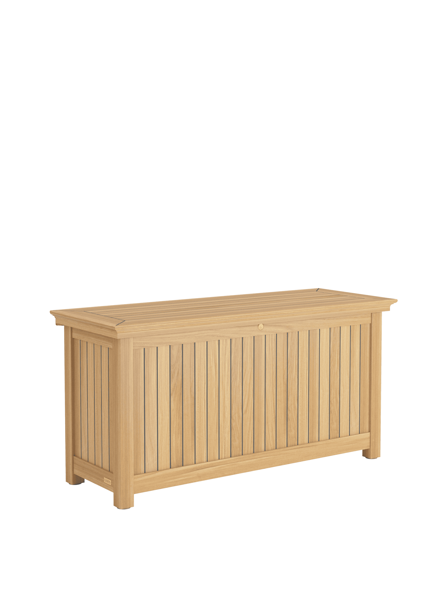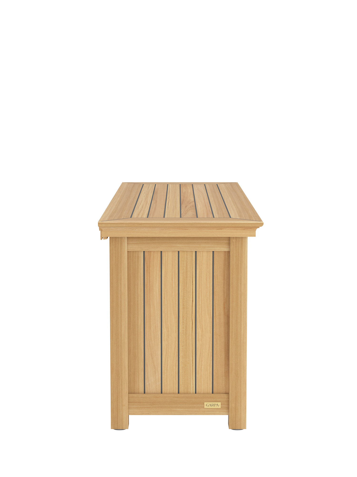 Die Kissentruhen für die Auflagen der Garpa Gartenmöbel zeigen sich perfekt in Form und Funktion. Alle konstruktiven Bauteile sind aus massivem Teak. Die Seiten und der Deckel bestehen aus wetterfestem Schichtholz, das mit 2,5 mm starkem Teak furniert und wie die Decksplanken von Hochseeyachten verfugt ist. Schloss und Scharniere sind aus hochwertigem Messing.