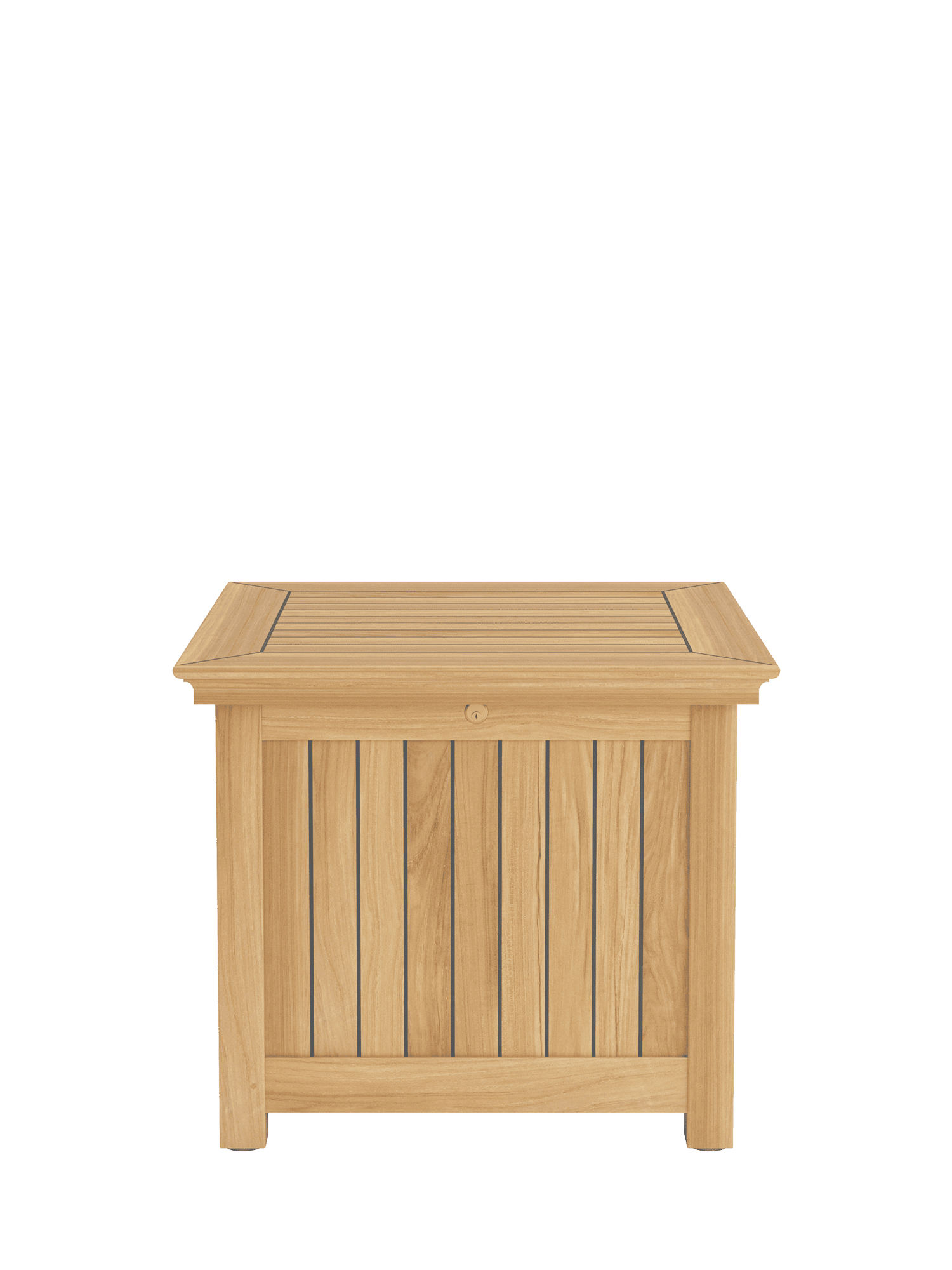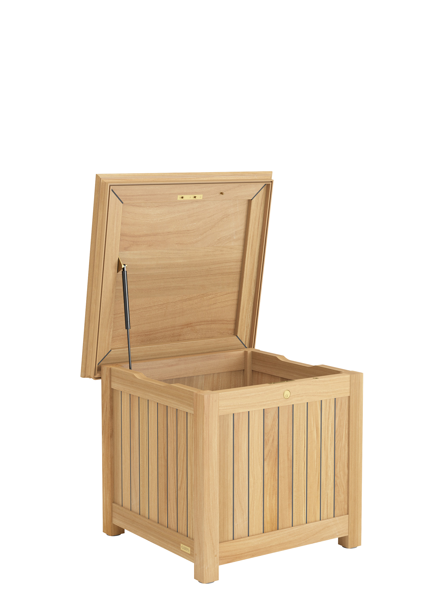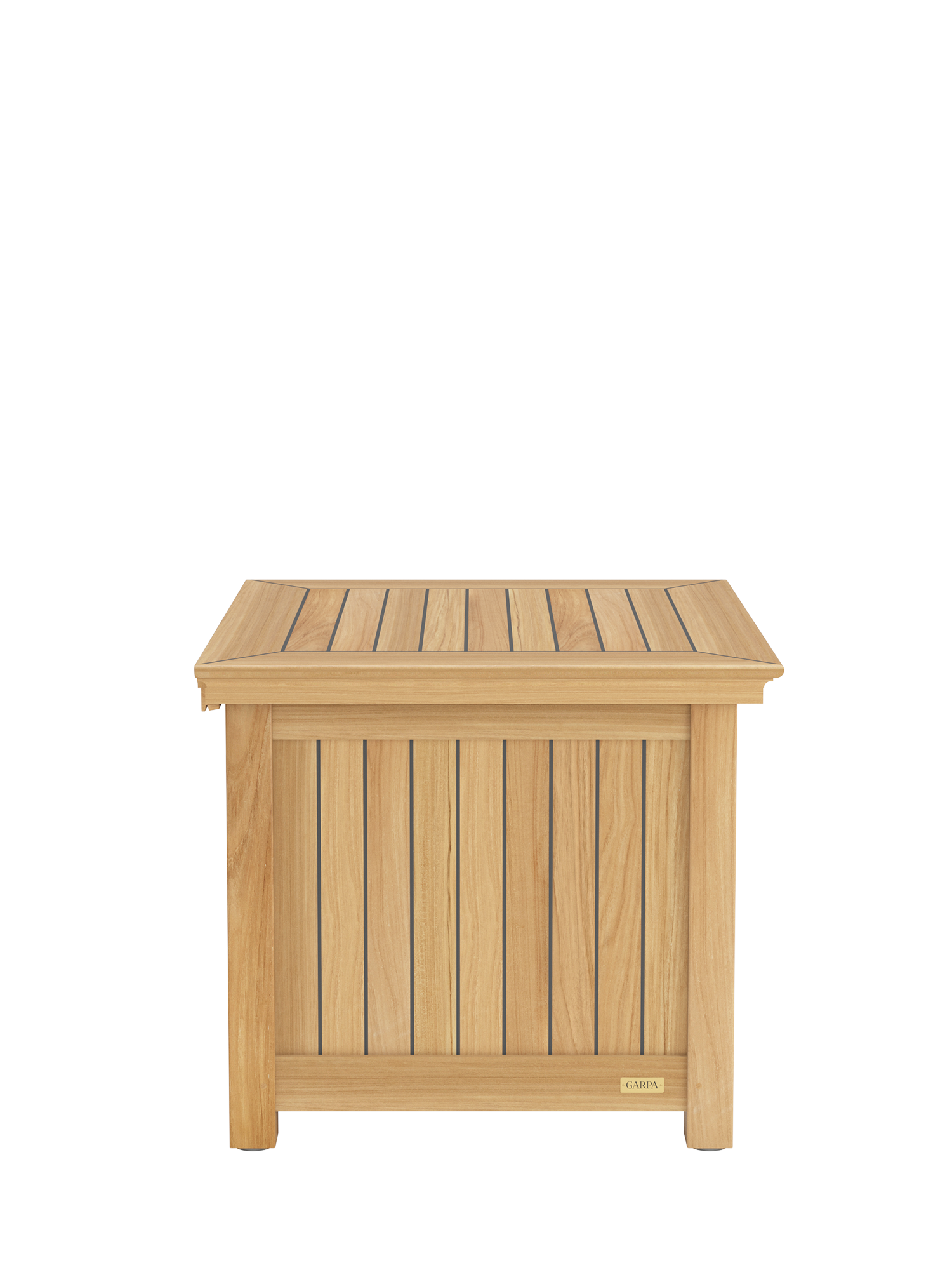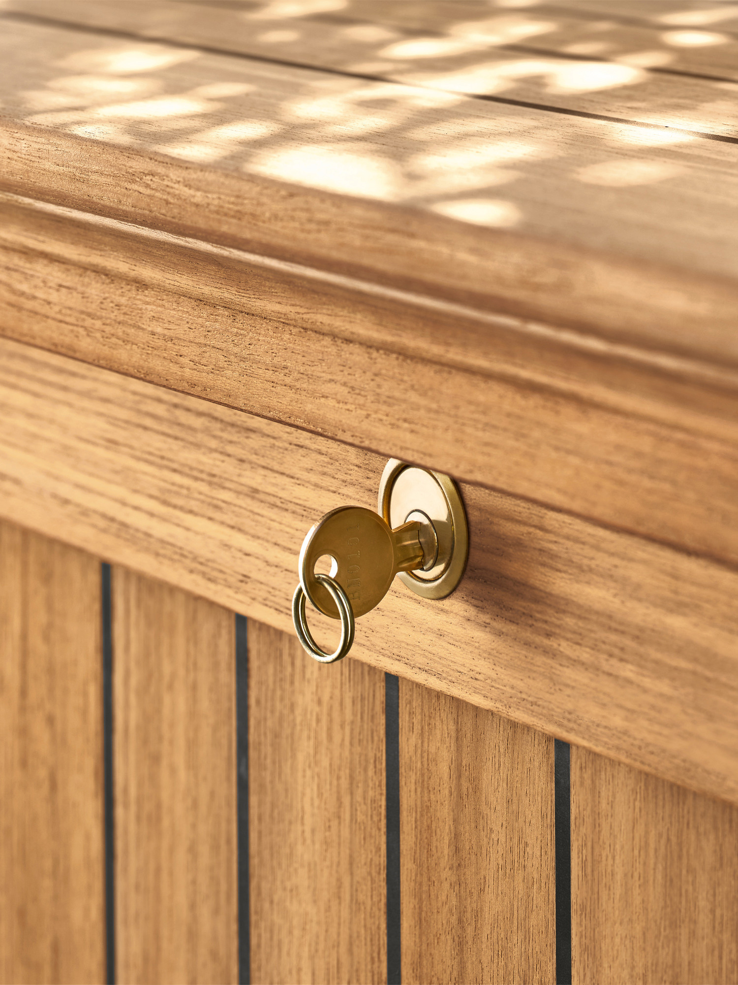 Die Kissentruhen für die Auflagen der Garpa Gartenmöbel zeigen sich perfekt in Form und Funktion. Alle konstruktiven Bauteile sind aus massivem Teak. Die Seiten und der Deckel bestehen aus wetterfestem Schichtholz, das mit 2,5 mm starkem Teak furniert und wie die Decksplanken von Hochseeyachten verfugt ist. Schloss und Scharniere sind aus hochwertigem Messing.