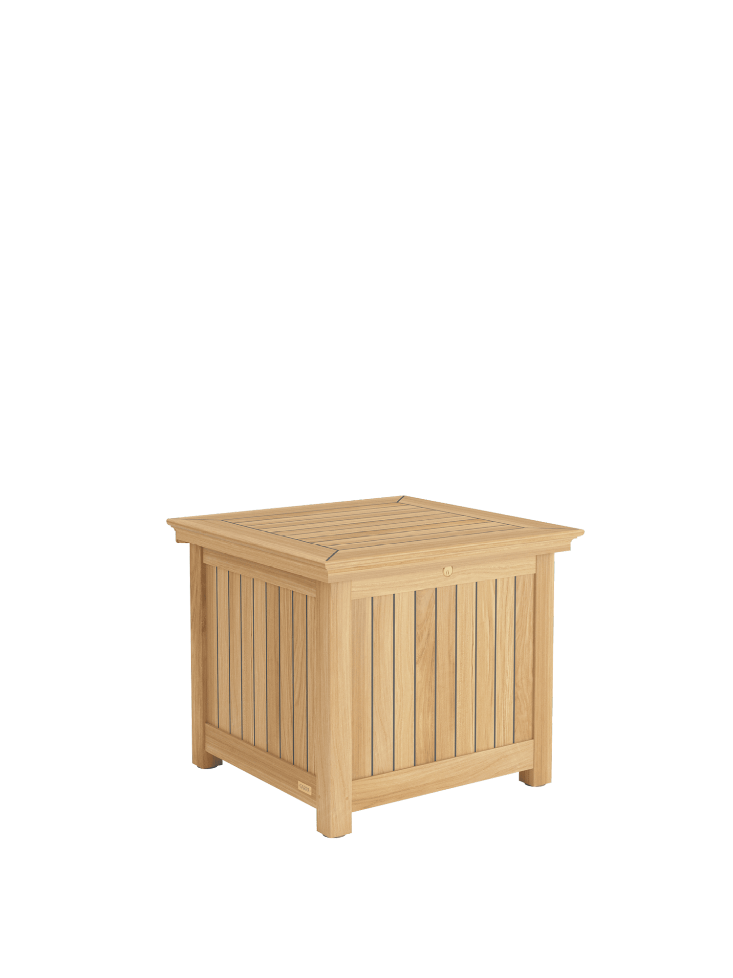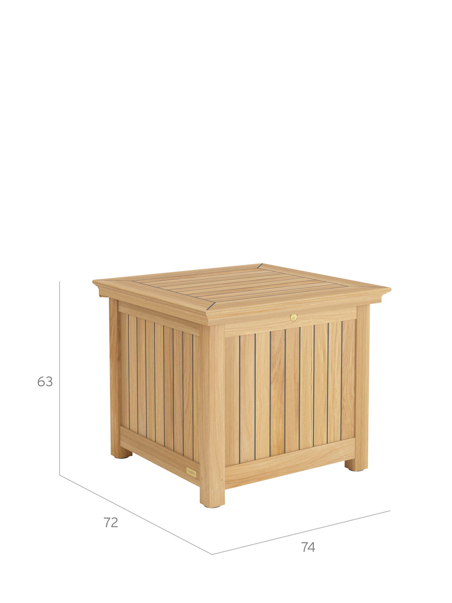 Die quadratische Kissentruhe im Format S bietet Platz für Auflagen von bis zu sechs Stühlen. Innen