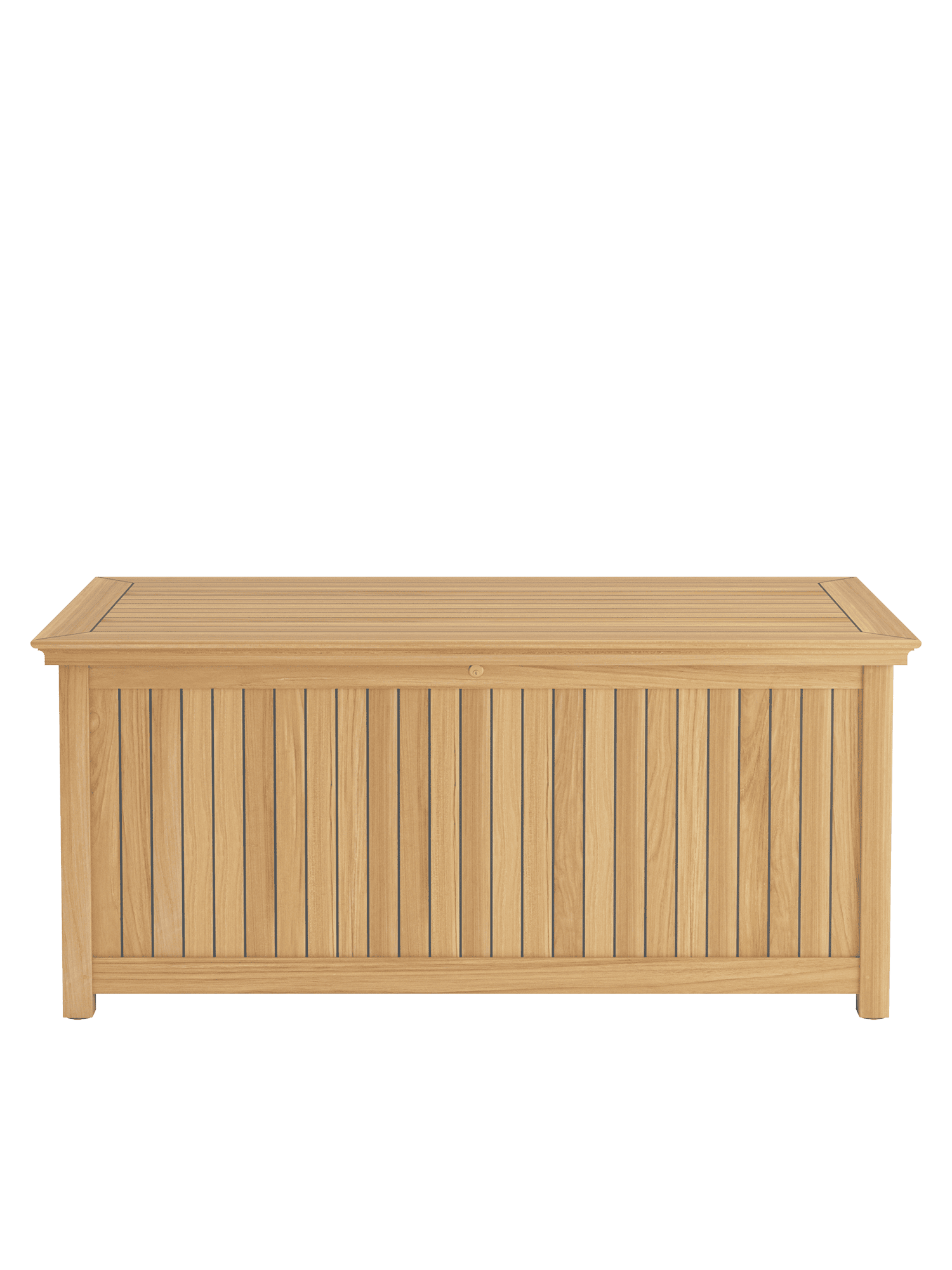 Die Kissentruhen für die Auflagen der Garpa Gartenmöbel zeigen sich perfekt in Form und Funktion. Alle konstruktiven Bauteile sind aus massivem Teak. Die Seiten und der Deckel bestehen aus wetterfestem Schichtholz, das mit 2,5 mm starkem Teak furniert und wie die Decksplanken von Hochseeyachten verfugt ist. Schloss und Scharniere sind aus hochwertigem Messing.