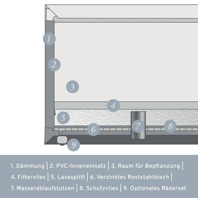 - Die Drainageschicht aus Lavasteinen und Filtervlies sowie das Wasserablaufsystem sind in den Boden der Gefäße integriert. (4-5)