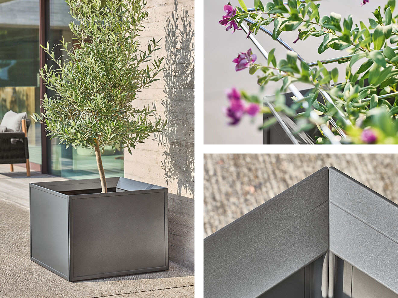 Gerade Linien, urbaner Stil: Die doppelwandigen kubischen Gefäße aus pulverbeschichtetem Aluminium folgen ihrer Bestimmung, Pflanzen formvollendet zur Geltung zu bringen. Selbst üben sie sich in vornehmer Zurückhaltung. Die schwebende Anmutung rührt wahlweise von verdeckt angebrachten Füßen oder Rollen her, die wenige Zentimeter Abstand zum Boden halten.