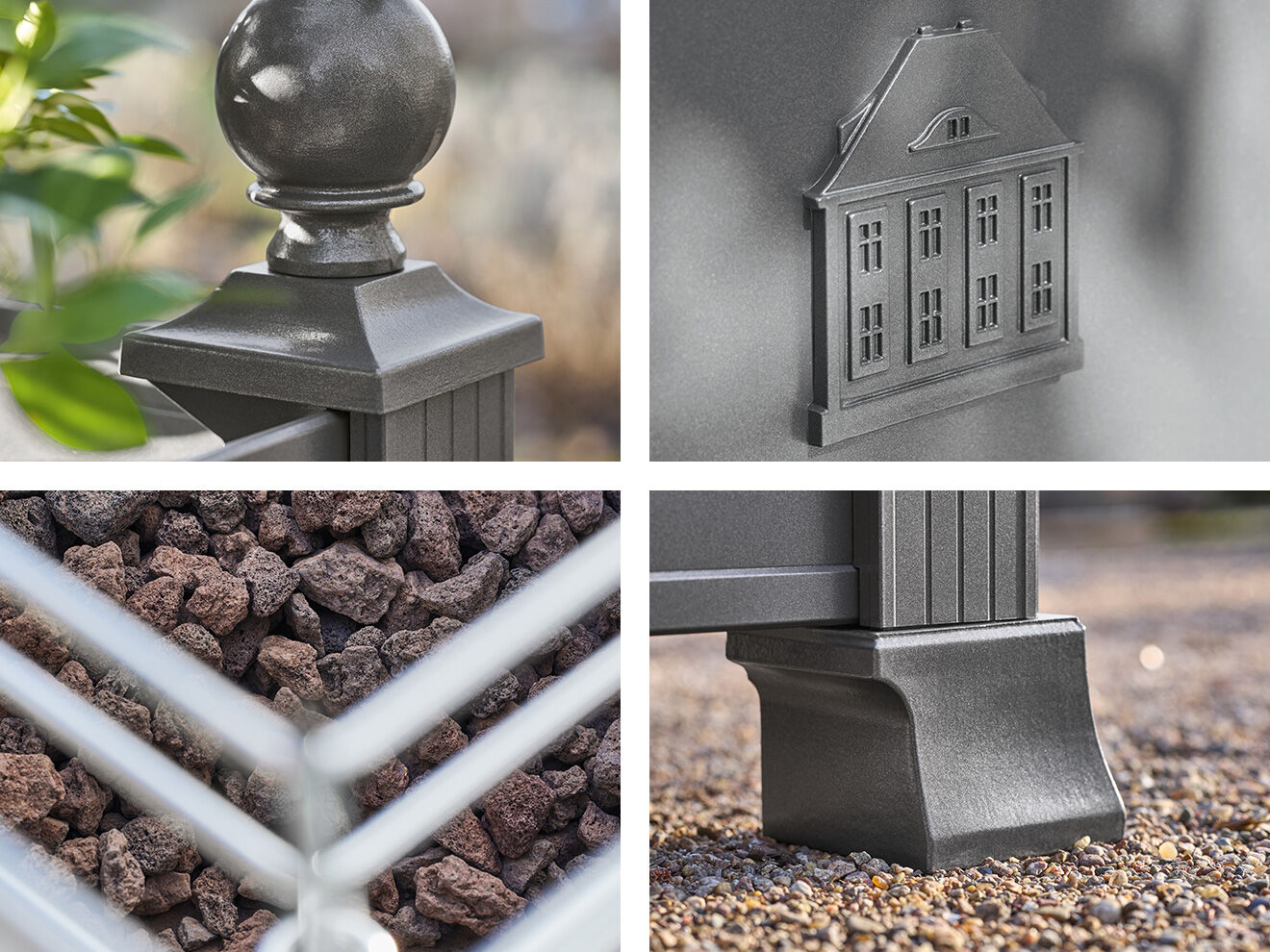 Das grau pulverbeschichtete Aluminium ist so elegant wie robust. Absolut witterungs- und frostbeständig ist es jeder Jahreszeit gewachsen und bleibt jahrzehntelang schön.