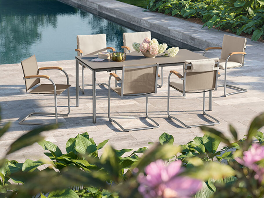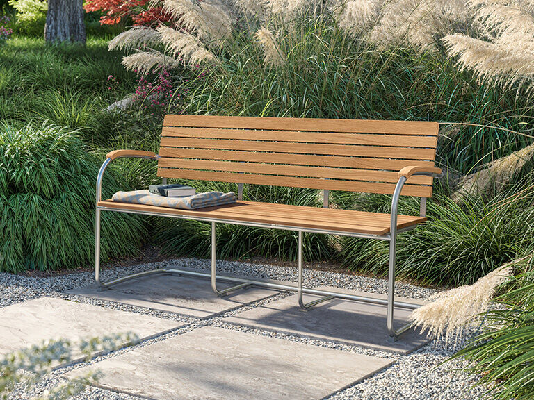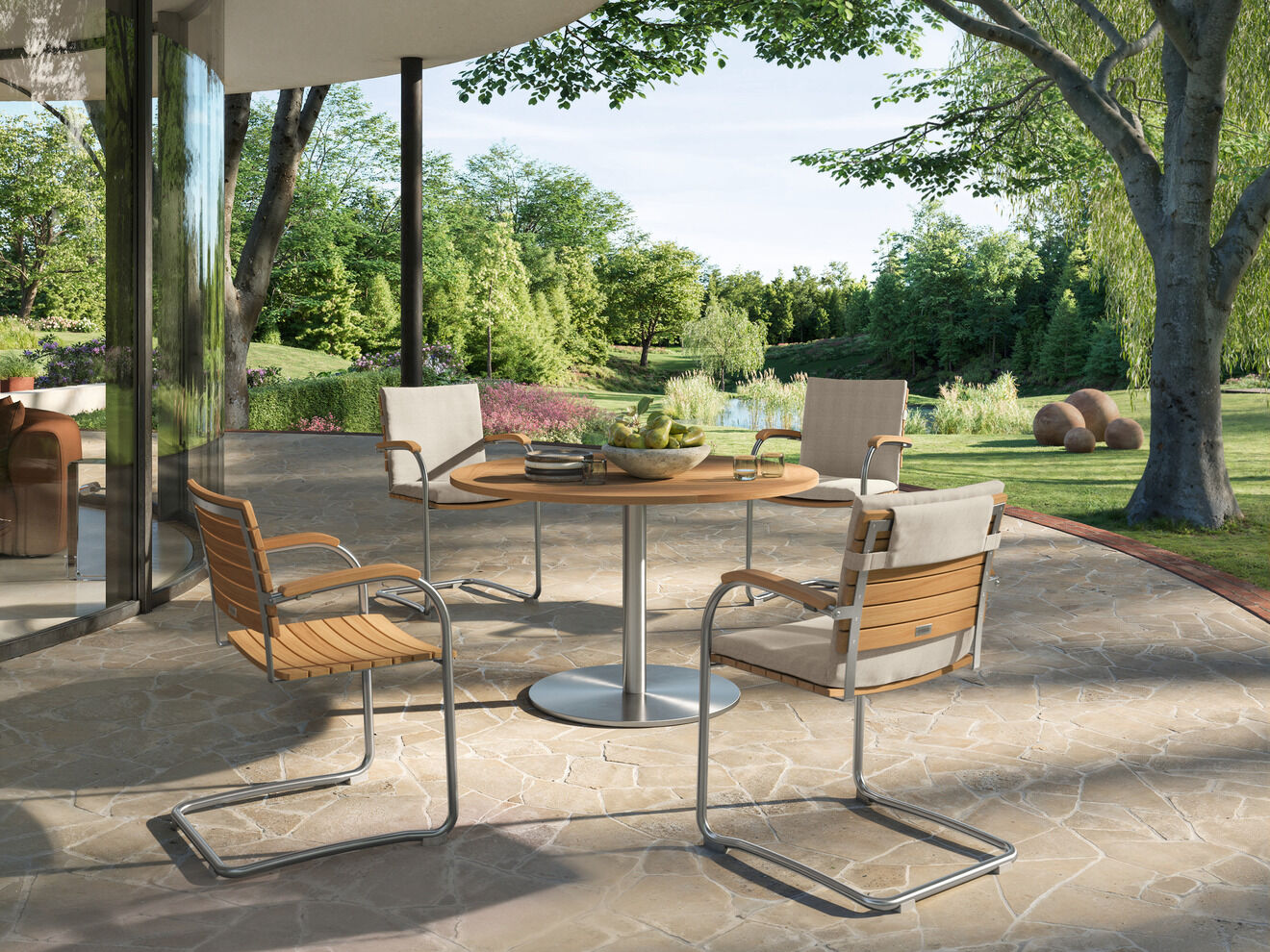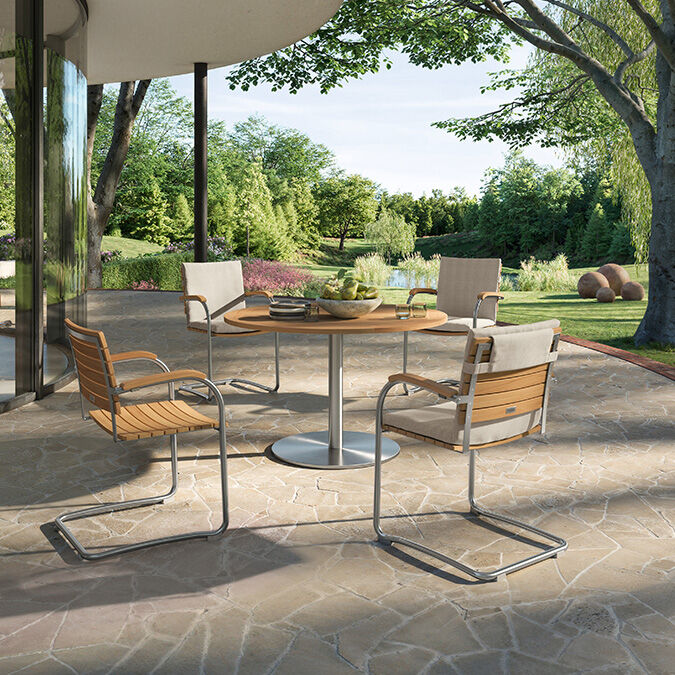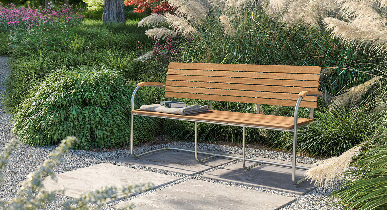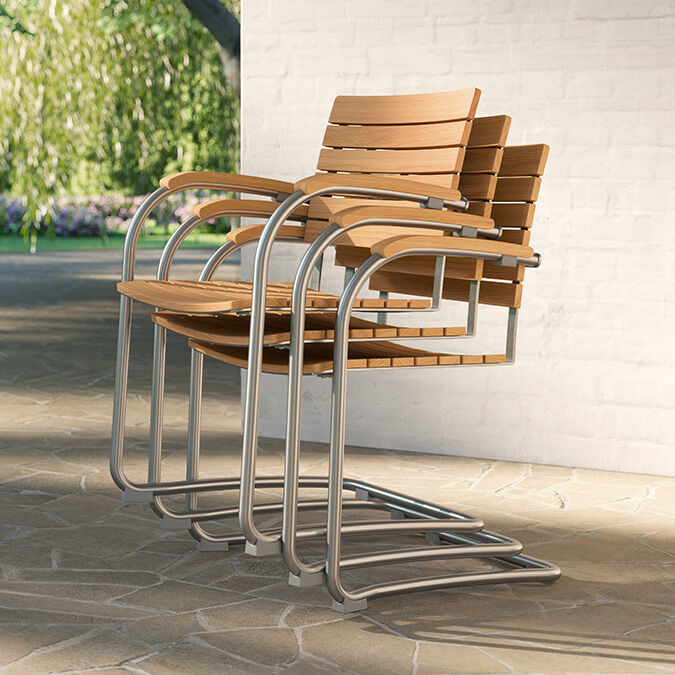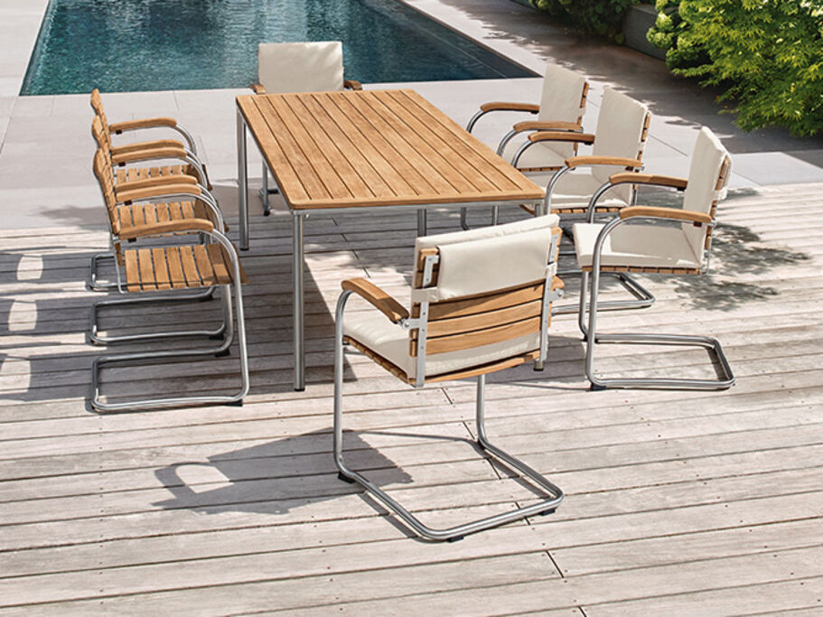 Der Freischwinger holt die unverkennbare Bauhaus-Ästhetik hinaus ins Freie, direkt vor die Sonnenseite des Hauses. Wer auf ihm Platz nimmt, genießt bequeme Beinfreiheit – und ein Gefühl des Schwebens, ohne die Bodenhaftung zu verlieren. Alles fördert die Entspannung: Die Teakholzleisten für Sitz und Rückenlehne sind nach den Konturen des Körpers modelliert, das Rohrgestell aus satiniertem Edelstahl federt stärkste Belastungen ab.