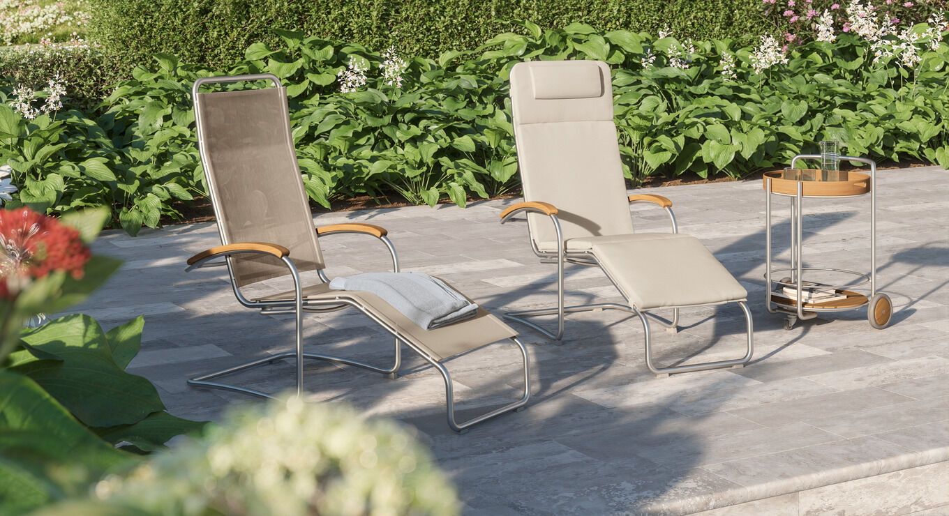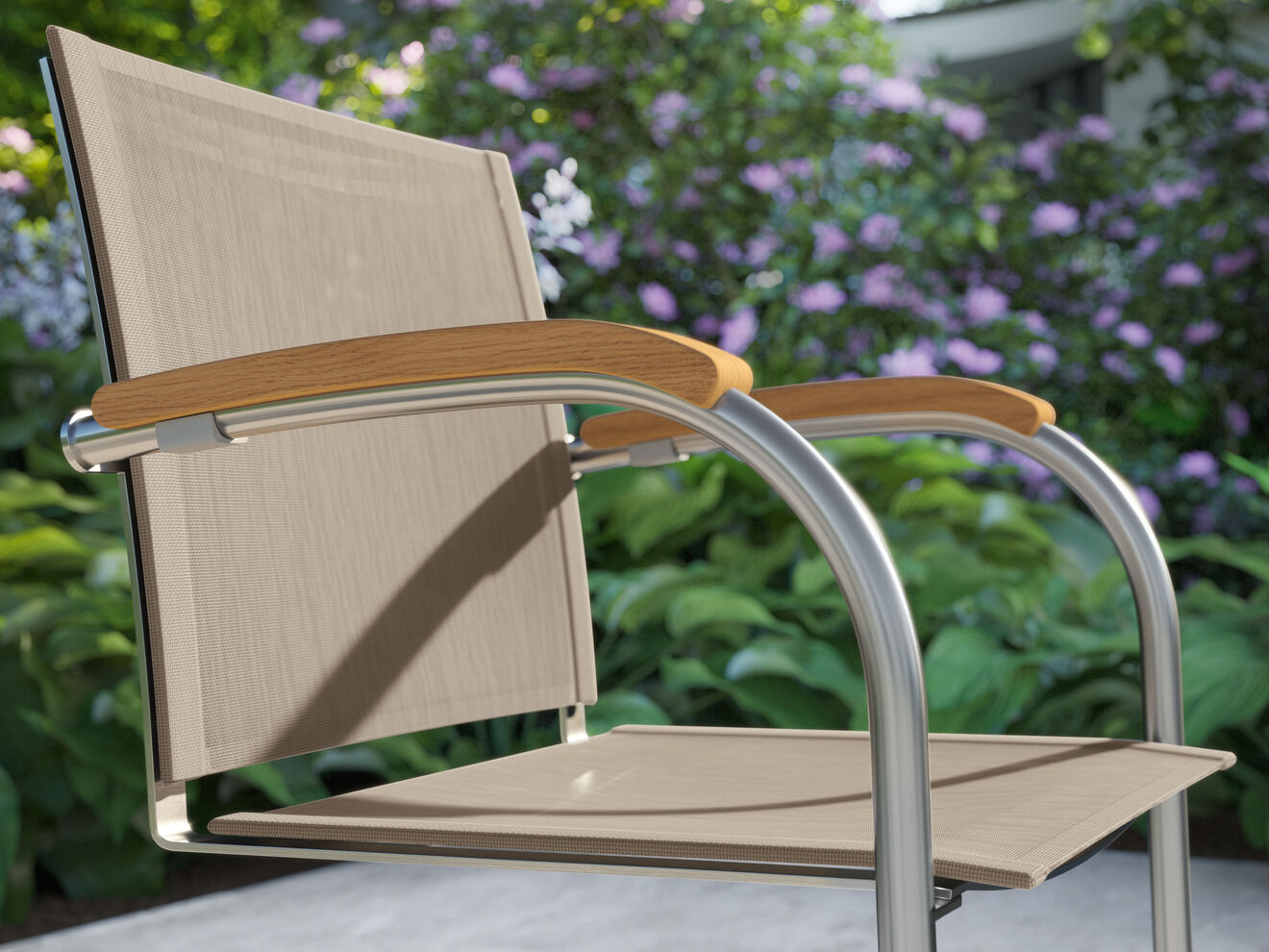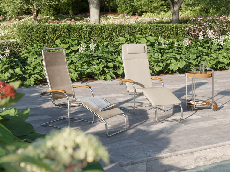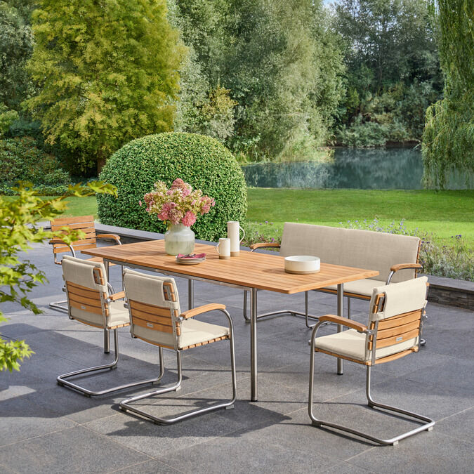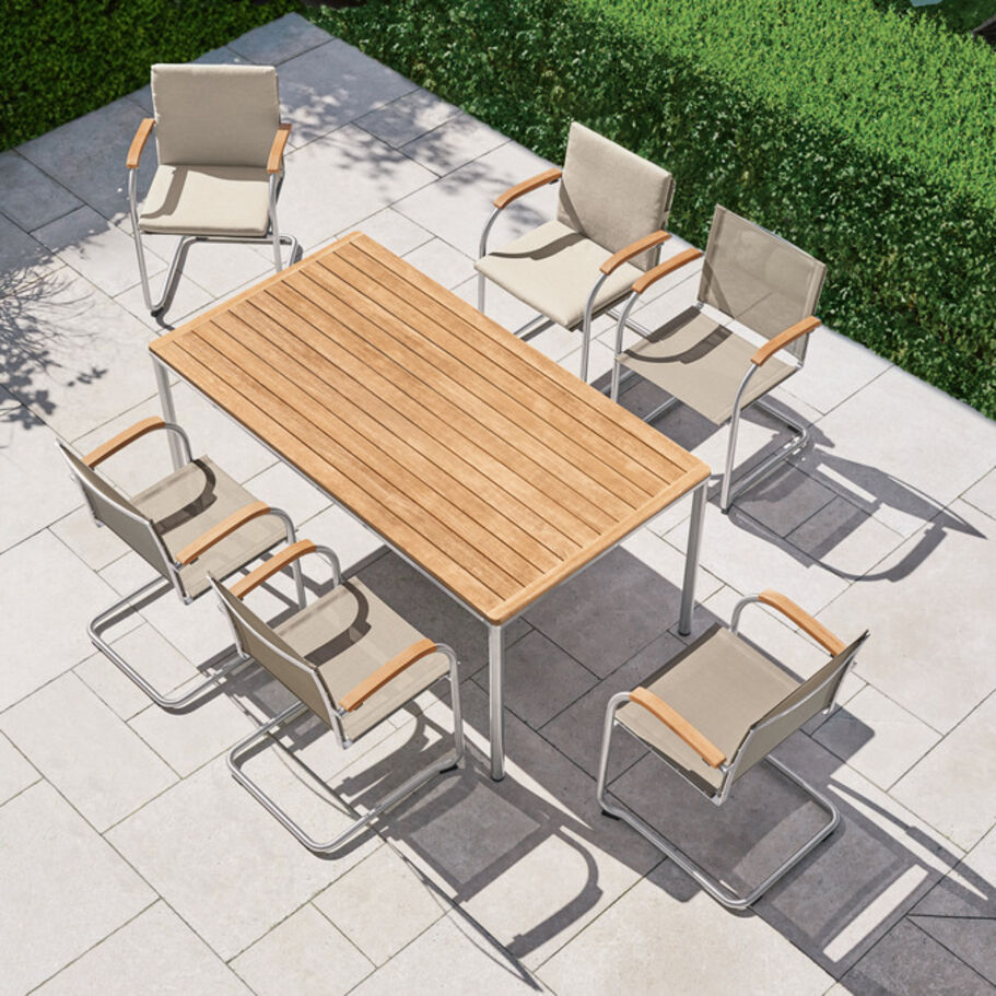 Die federnde Verbindung aus hochwertigem Polymergewebe und satiniertem Edelstahl ermöglicht ein einzigartiges Sitzerlebnis. Die straffe, überraschend anschmiegsame Gewebebespannung verspricht spürbaren Komfort, der mit Auflagen noch potenziert werden kann. Armlehnen aus handschmeichelnd gewölbtem Teakholz sind eine bewusste Reminiszenz an das Vorbild des modernen Gartenstuhls – an den zeitlosen Bolero Freischwinger Teak.