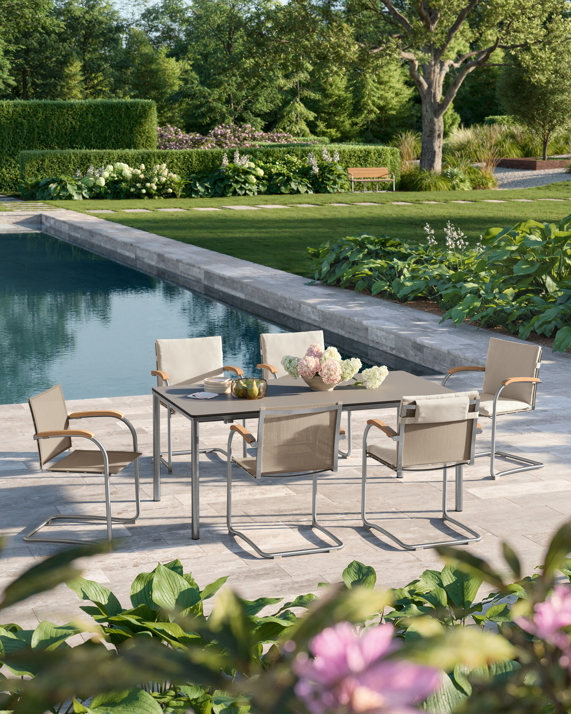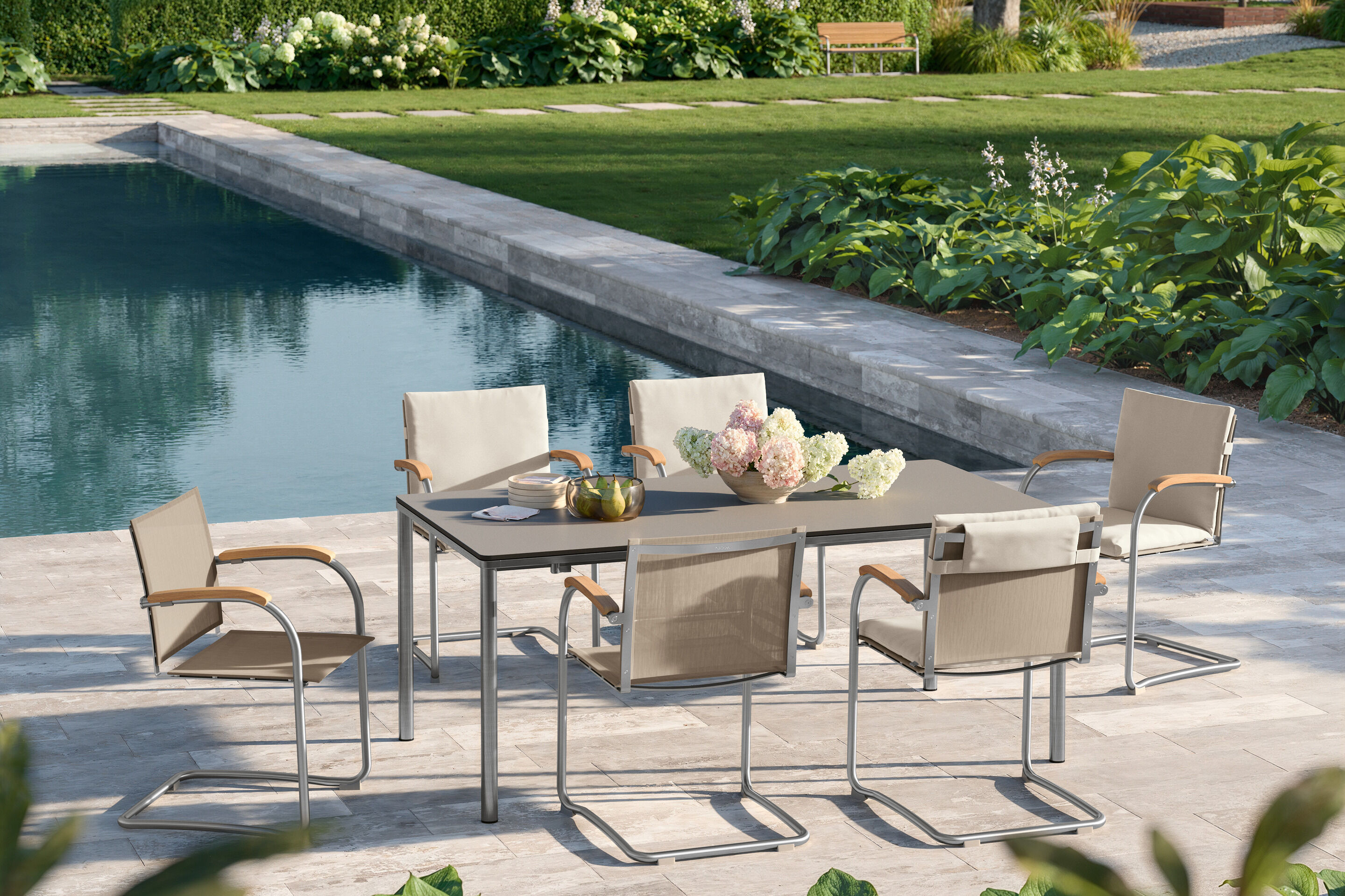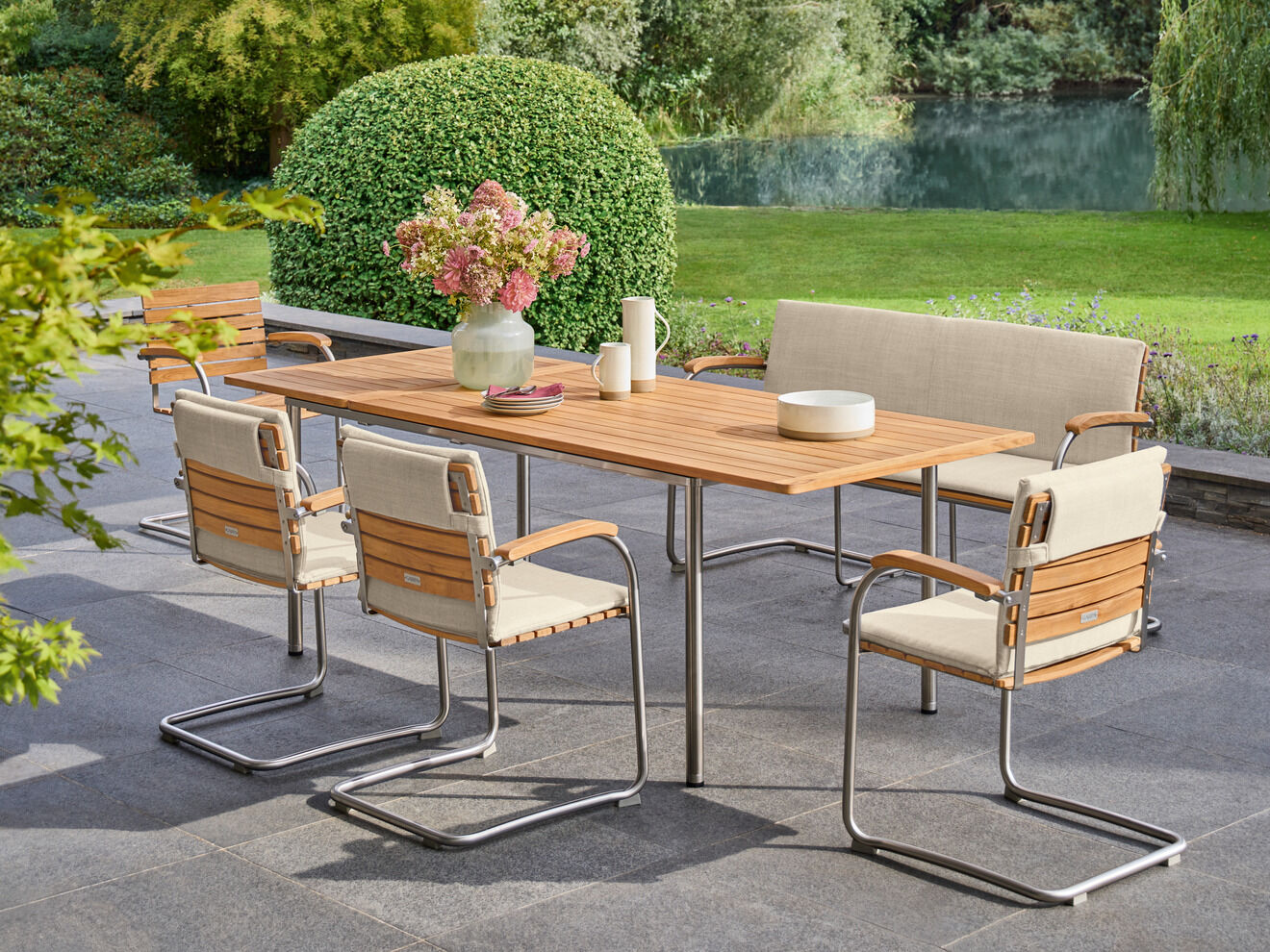 Die federnde Verbindung aus hochwertigem Polymergewebe und satiniertem Edelstahl ermöglicht ein einzigartiges Sitzerlebnis. Die straffe, überraschend anschmiegsame Gewebebespannung verspricht spürbaren Komfort, der mit Auflagen noch potenziert werden kann. Armlehnen aus handschmeichelnd gewölbtem Teakholz sind eine bewusste Reminiszenz an das Vorbild des modernen Gartenstuhls – an den zeitlosen Bolero Freischwinger Teak.