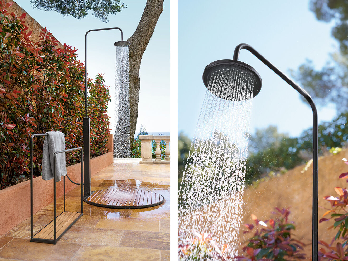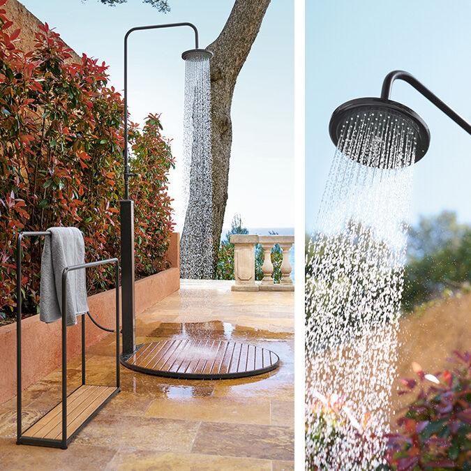 Herrlich aufgedreht: Prickelnde Schauer an heißen Tagen beschert eine Dusche, die modernste Technik in ein klassisches Design aus Teak und Stahl integriert. Die runde Bodenplatte sorgt für sicheren Stand. Über die Armatur lässt sich die Wasserzufuhr einfach regulieren. Zum Anschluss genügen Wasserhahn und Gartenschlauch. Am Handtuchhalter aus pulverbeschichtetem Stahl und Teak hängt schon das flauschige Handtuch bereit.