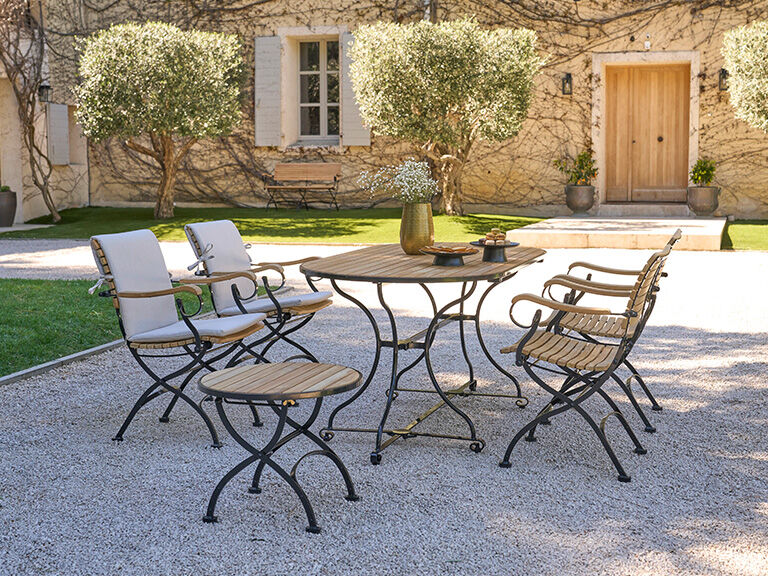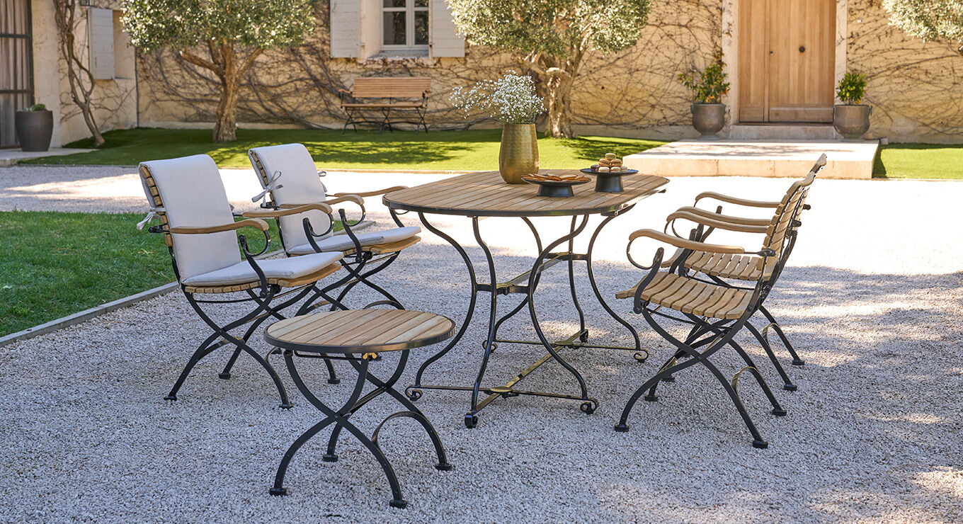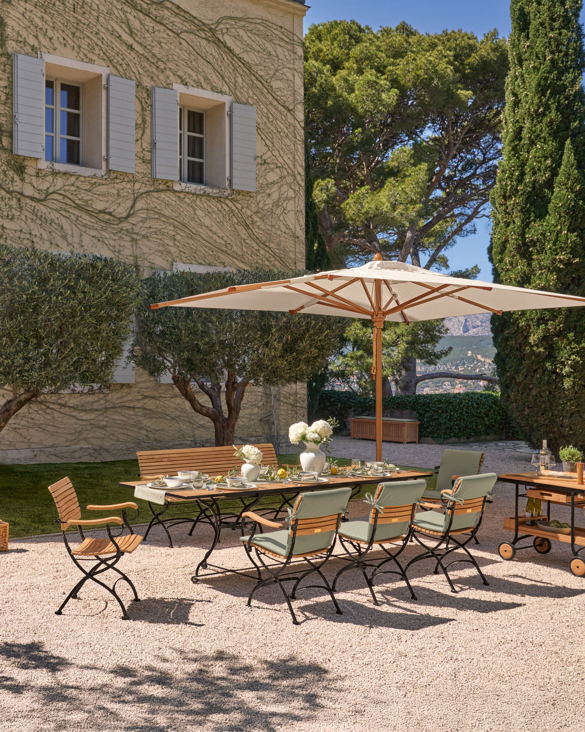 Alles lädt ein, den Sommer zu feiern: strahlender Sonnenschein, ein offenes Haus – und vollendet schöne Gartenmöbel, die das Beste aus Vergangenheit und Gegenwart in sich vereinen.