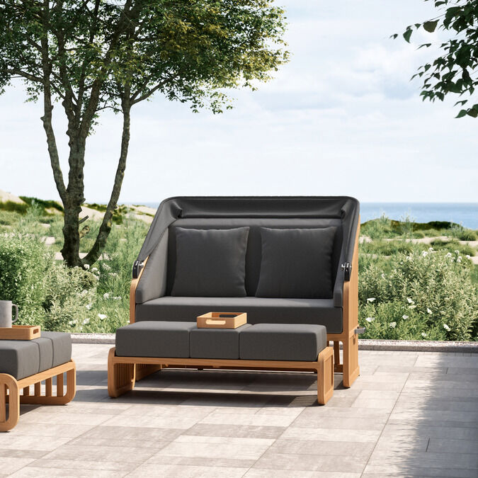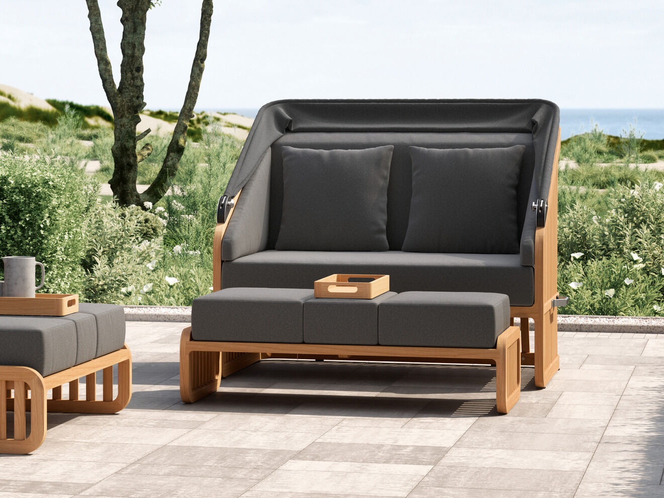 Sehnsuchtsziel und Rückzugsort zugleich: Der Solitär aus Teak interpretiert den Strandkorb neu und entführt auf eine luxuriöse Entdeckungsreise zu sich selbst.