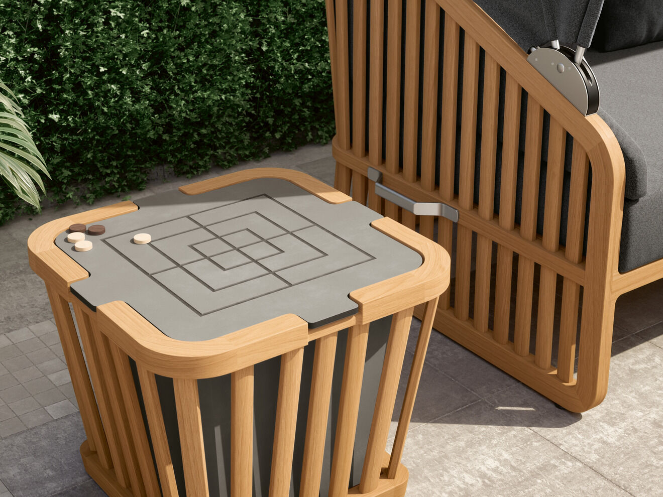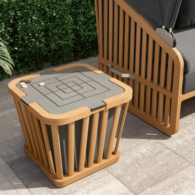 Im Inneren des speziellen Racks aus Teak und Kunstharz verschwinden Räder, Abdeckhaube und Schutzhülle für das Sommerdach, solange sie nicht gebraucht werden. Daneben bleibt noch genug sicherer Stauraum für ein Plaid oder die Kopfhörer. In den gewendeten Deckel ist ein klassisches Mühlebrett eingearbeitet.