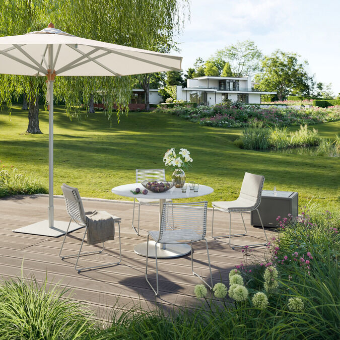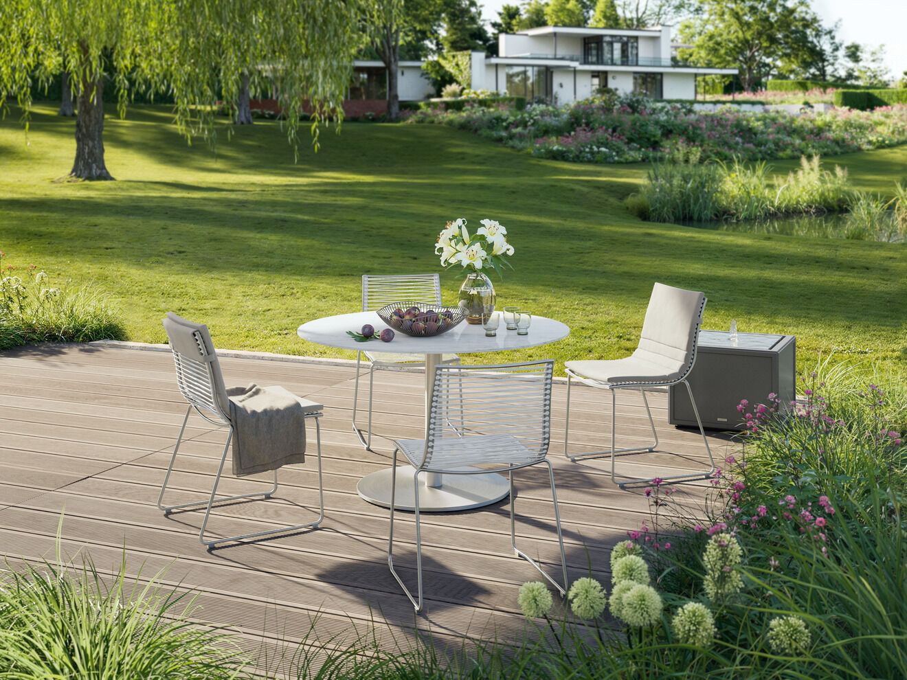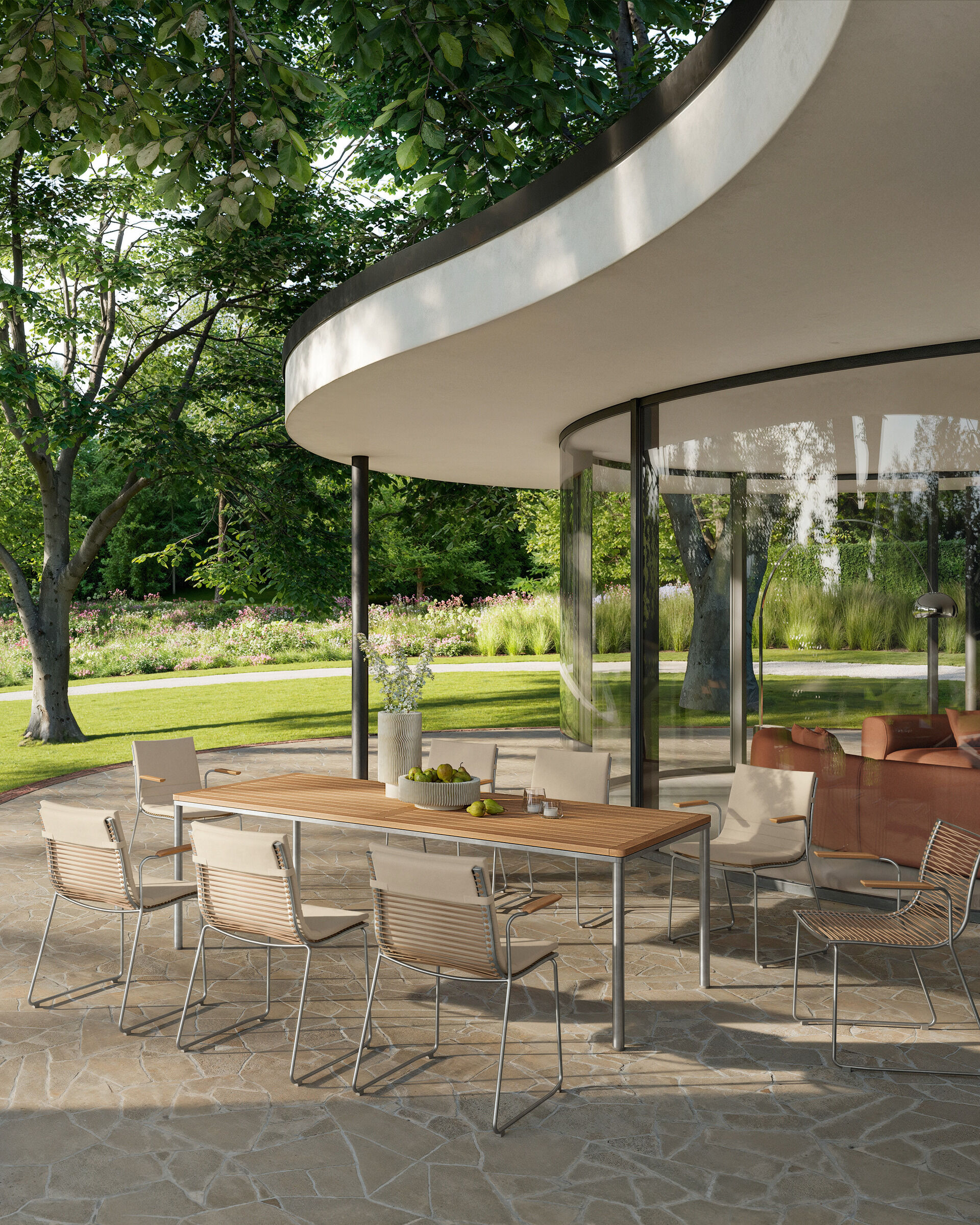 Tische in vielen Größen, gebürstet oder mit graphitgrauer Pulverbeschichtung, empfehlen sich als ideale Begleiter für Pan. Feste oder ausziehbare Varianten der exklusiven Portland Tische bilden großzügige Ensembles, Ronda Mittelfußtische bieten angenehm viel Beinfreiheit. Die Tischplatten aus hochwertigem Teak oder grauem Kunstharz ermöglichen harmonische Kombinationen, für Ronda stehen auch weiße Steinkeramikplatten mit marmorgleicher Maserung zur Wahl.