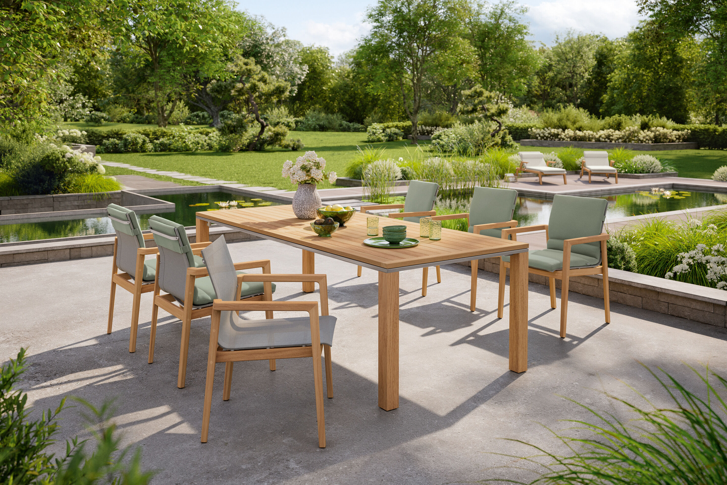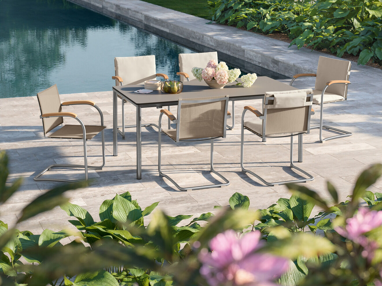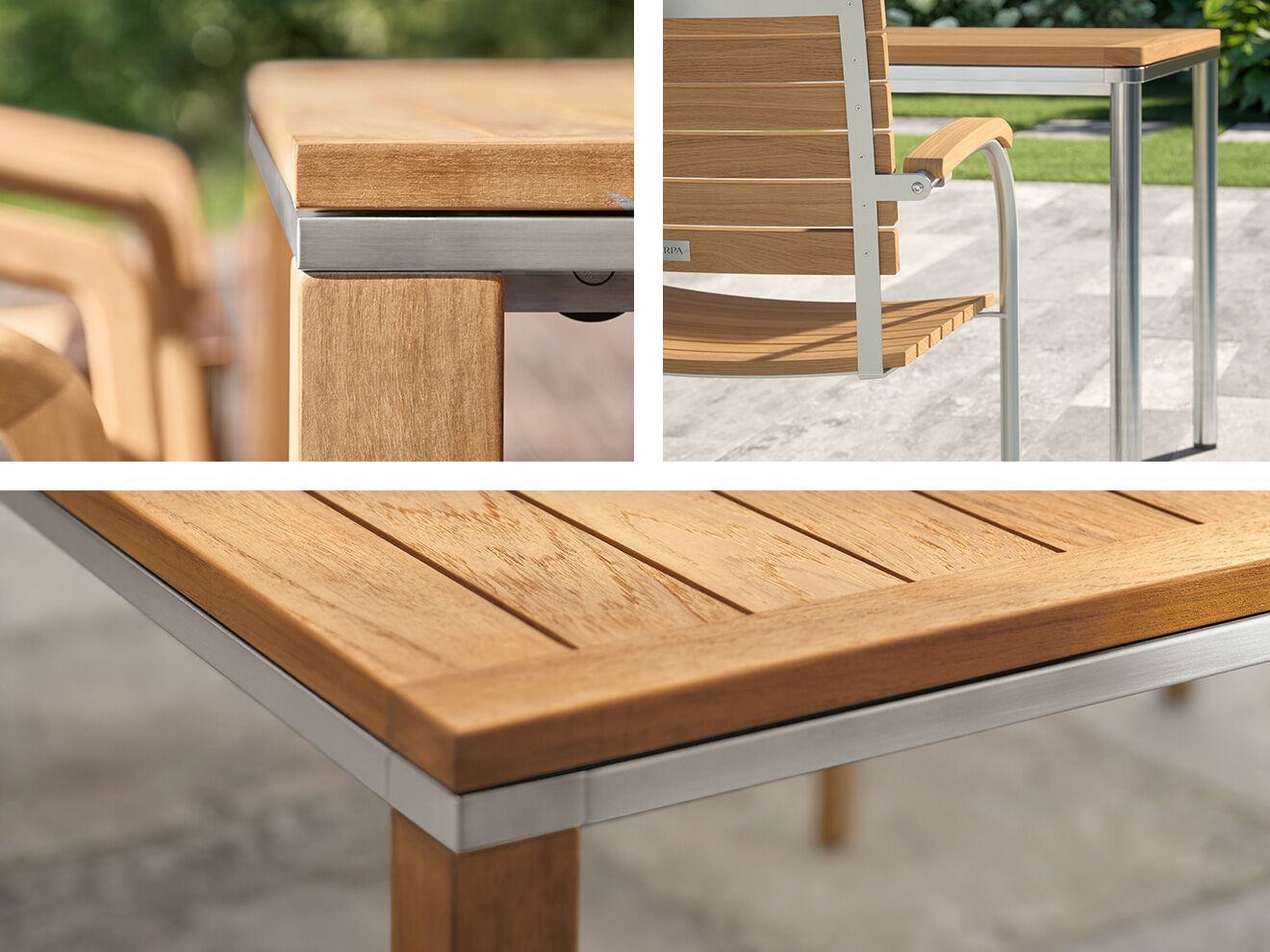 Portland Tische haben Beine aus Teak, Edelstahl, graphitgrau pulverbeschichtetem Edelstahl oder eloxiertem Aluminium. Insbesondere die Armlehnstühle, Stühle und Freischwinger der Kollektionen Pan und Bolero passen perfekt zu Portland. Einladende Sitzgruppen verspricht auch die Kombination von Portland Silk und Monterey Silk.