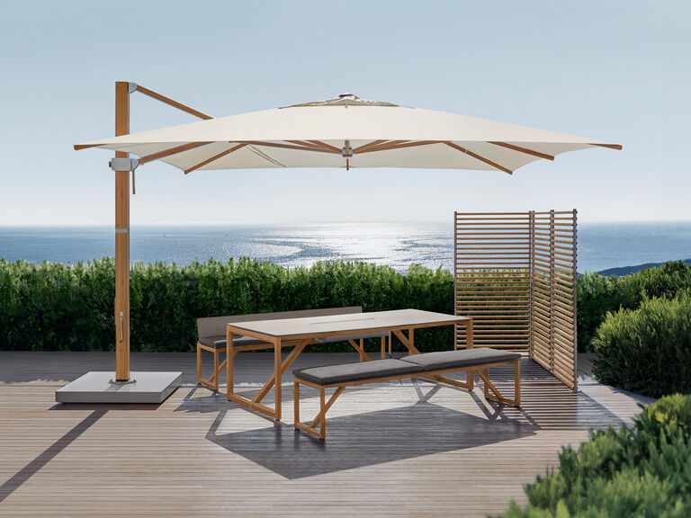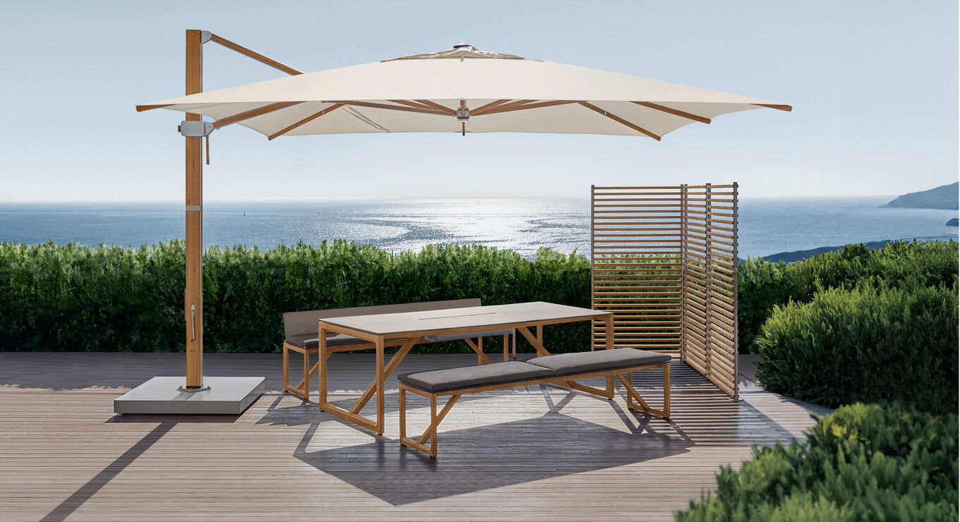Die Bänke, mit oder ohne Lehne, gleichen in ihrer Konstruktion aus Teakholzrahmen und Kunstharzplatten dem Tisch. Nach geselligen Abenden oder bei Dauerregen können sie in voller Länge unter ihm verschwinden und bilden gemeinsam eine kompakte Quaderform.