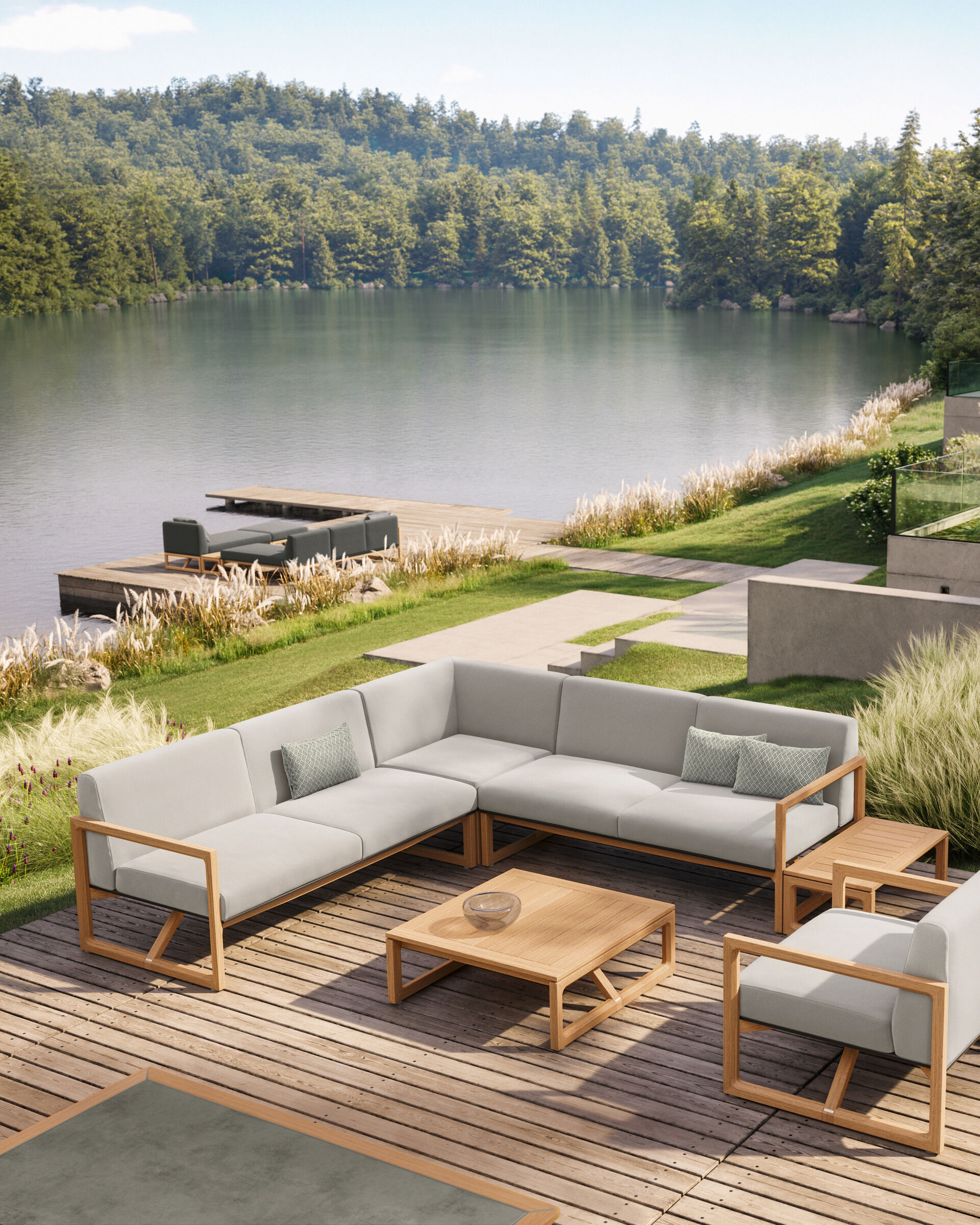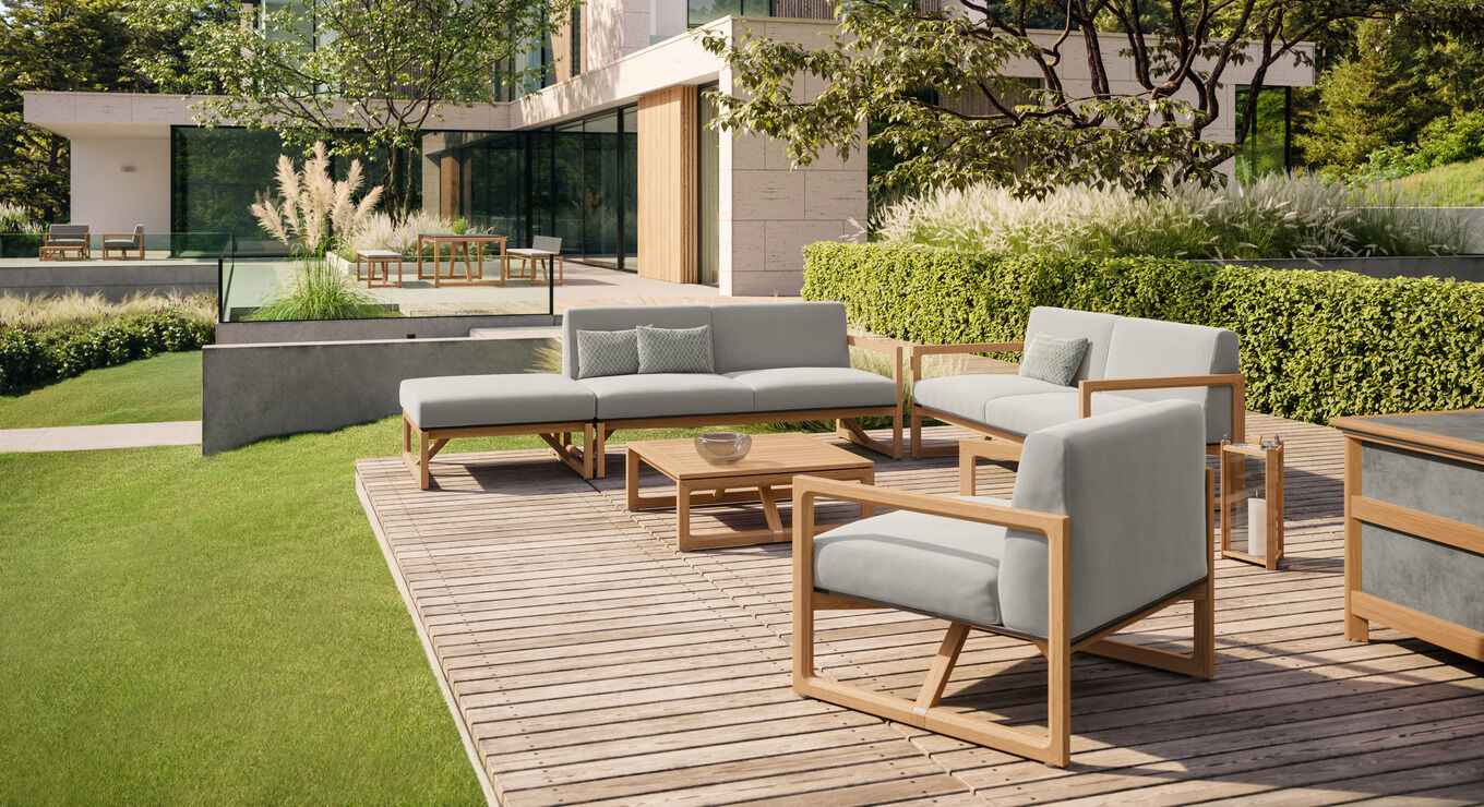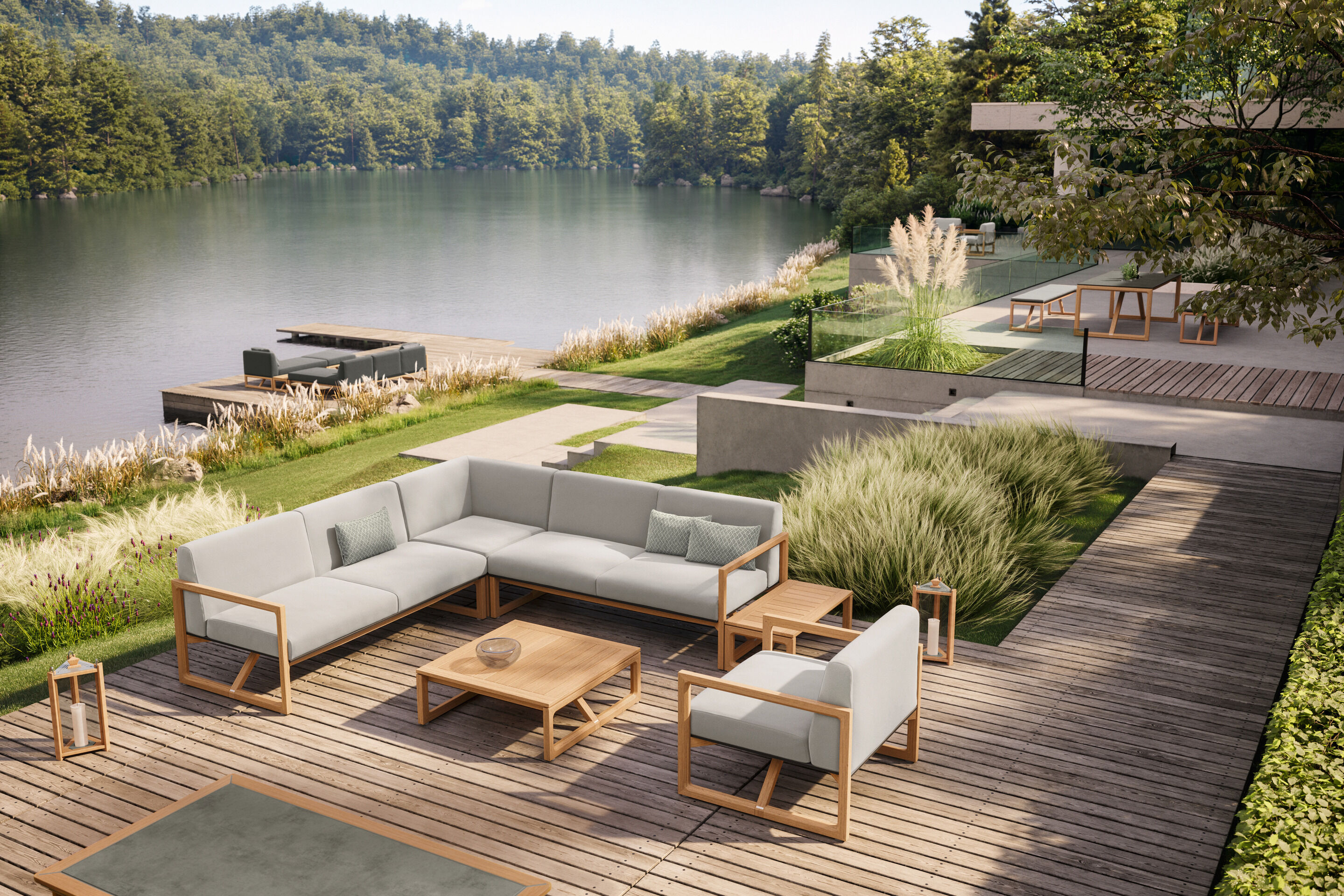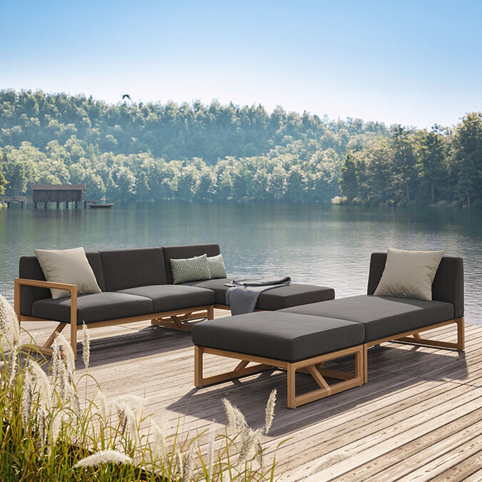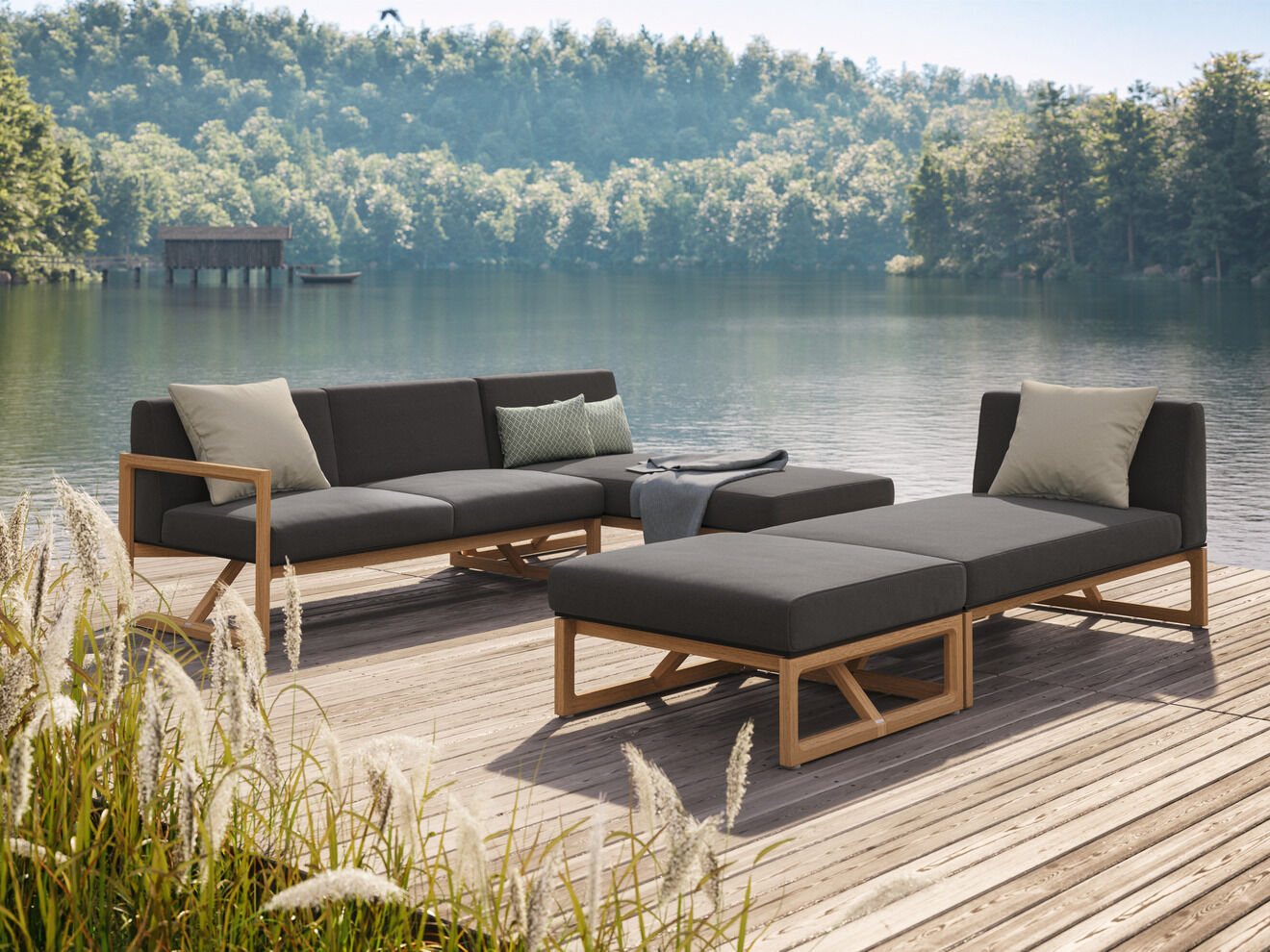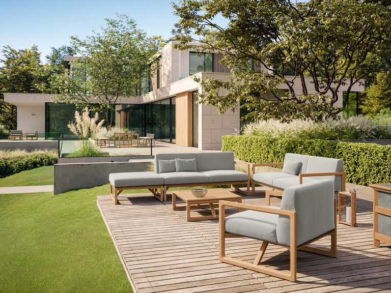 Weiche Polstermöbel gruppieren sich in Wunschformation um einen niedrigen Couchtisch. Ein Beistelltisch ergänzt das wohnliche Szenario. Gemeinsames Merkmal der behaglichen Loungemöbel ist das selbstbewusste Design, das klassische Ruhebedürfnisse zeitgemäß erfüllt: Gestelle aus hochwertigem Plantagenteak tragen Polster, die zu 100 % aus Polyacryl gefertigt und für optimale Stabilität fest miteinander verbunden sind. Minimalisten mit Familiensinn wissen das zu schätzen.