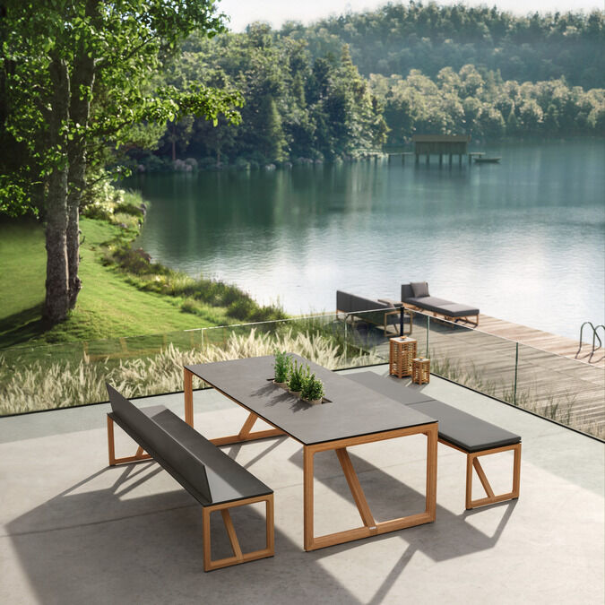 Variable Lounge oder kompakte Sitzgruppe – die Konstruktion der Wangen und Streben aus hochwertigem Teakholz ist die gleiche. Tisch und Bänke bieten Platz zum Essen, für Geselligkeit, als Spielecke oder Homeoffice. Entdecken Sie die Diningmöbel der Trey Kollektion.