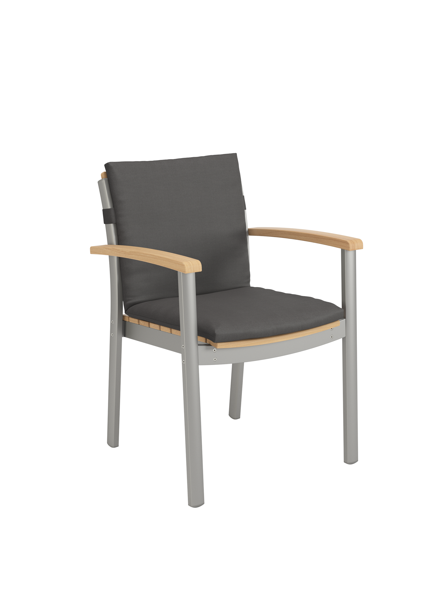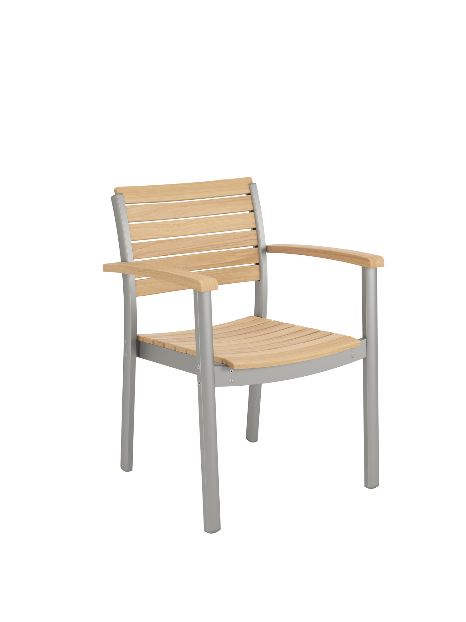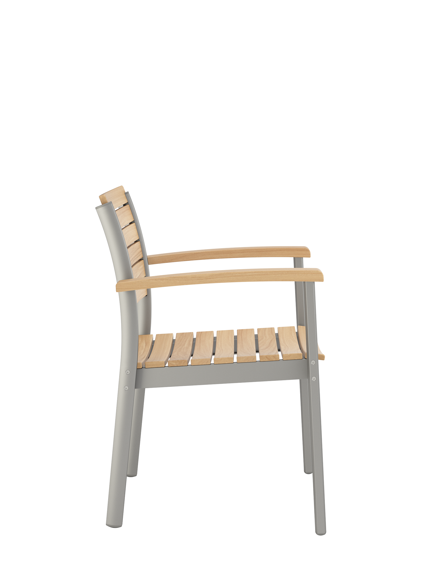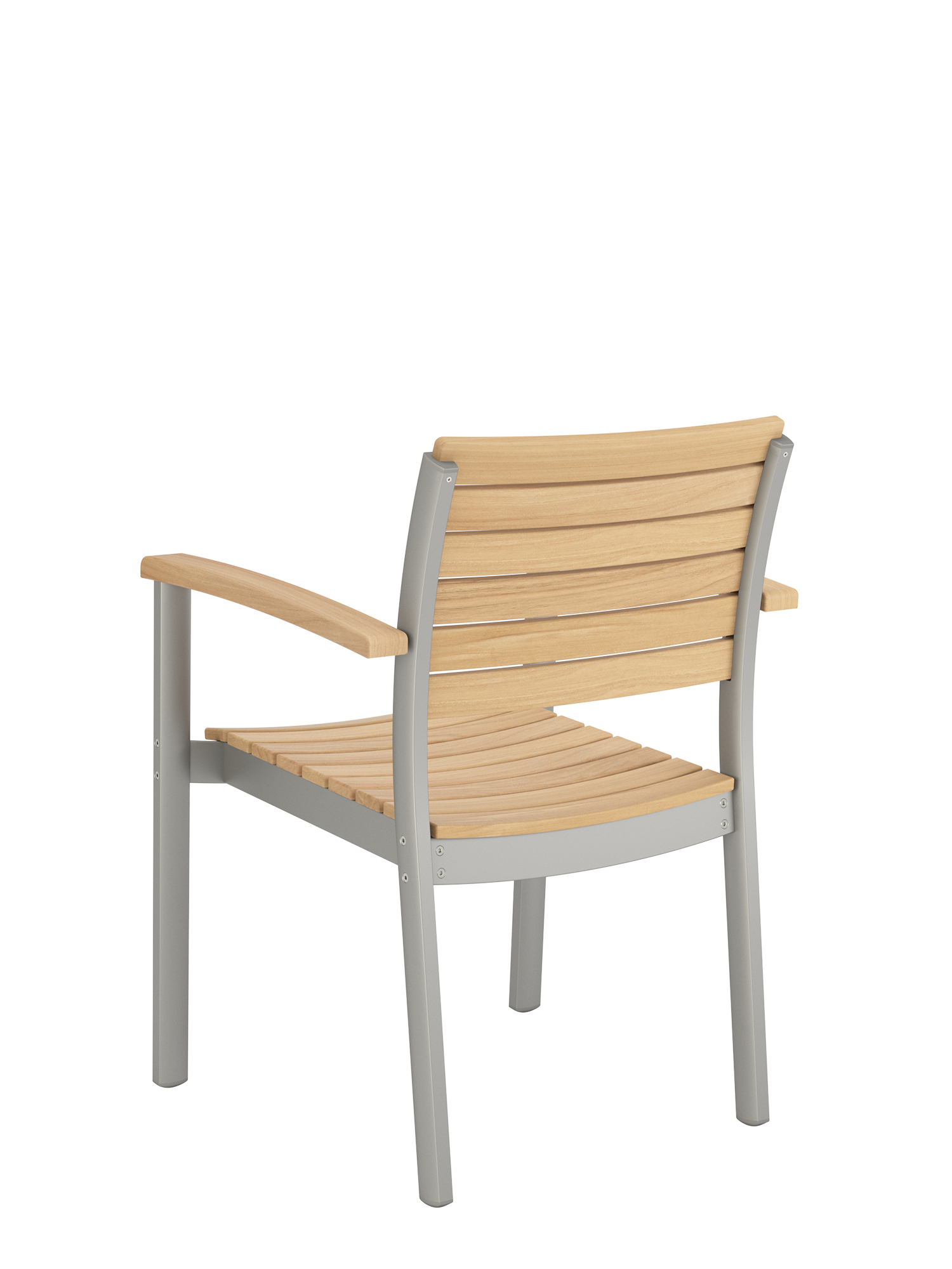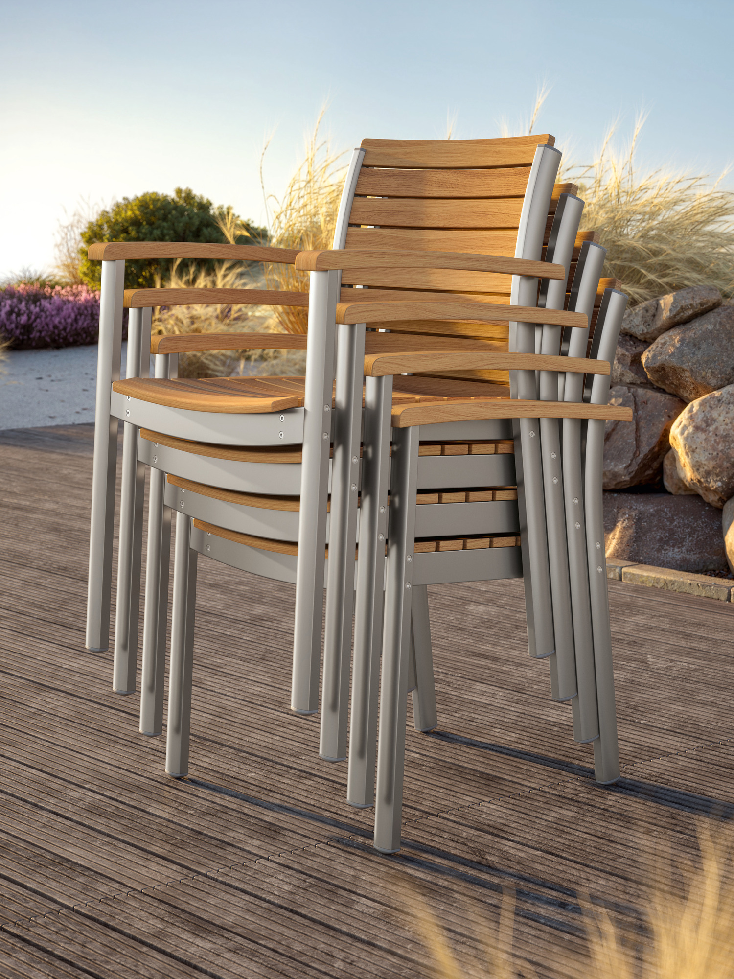Hier werden langlebige Materialien perfekt in Szene gesetzt: Die eloxierten Profile des seidig glänzenden Aluminiumgestells umfassen passgenau die ergonomisch modellierten Teakleisten an Sitz und Rückenlehne. Und verleihen dem stapelbaren Designklassiker eine moderne Note.