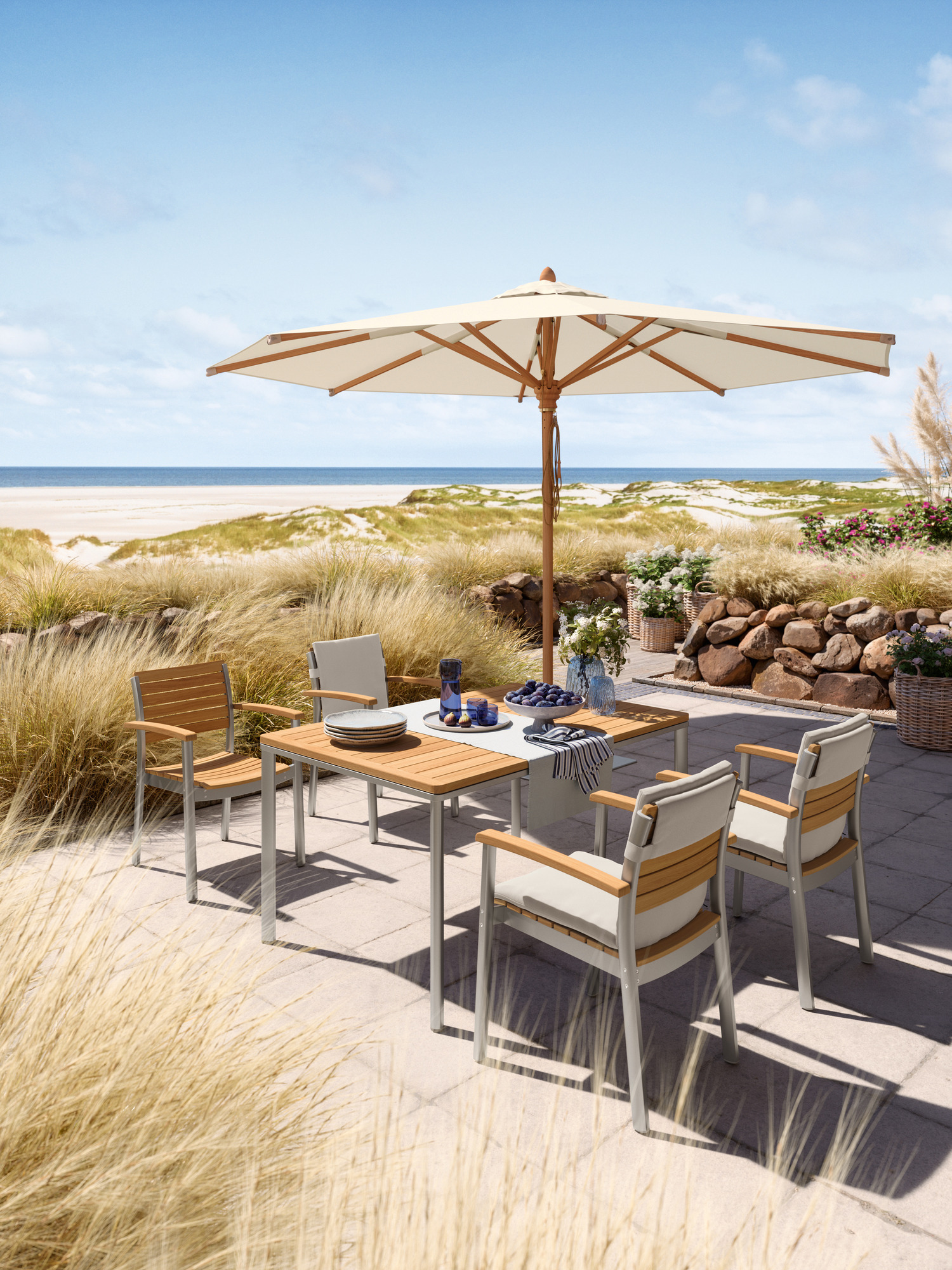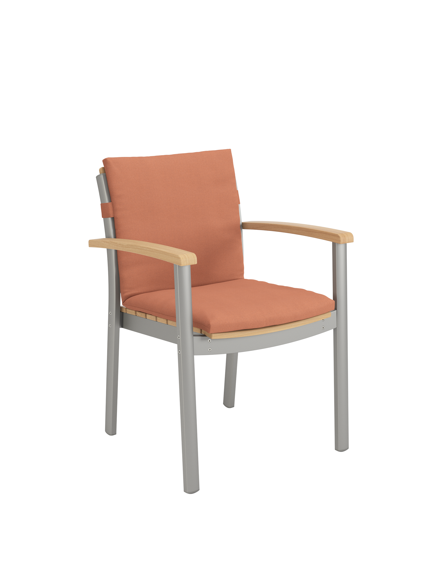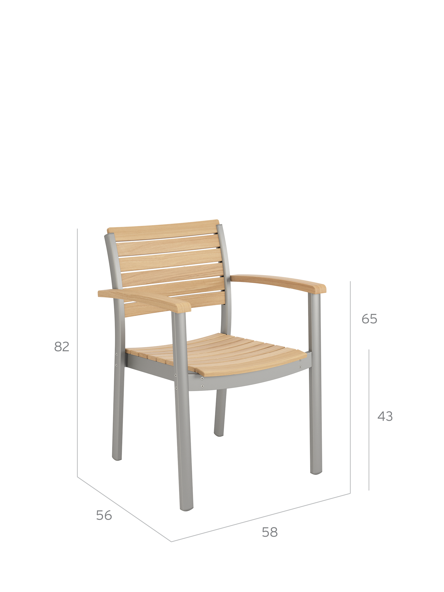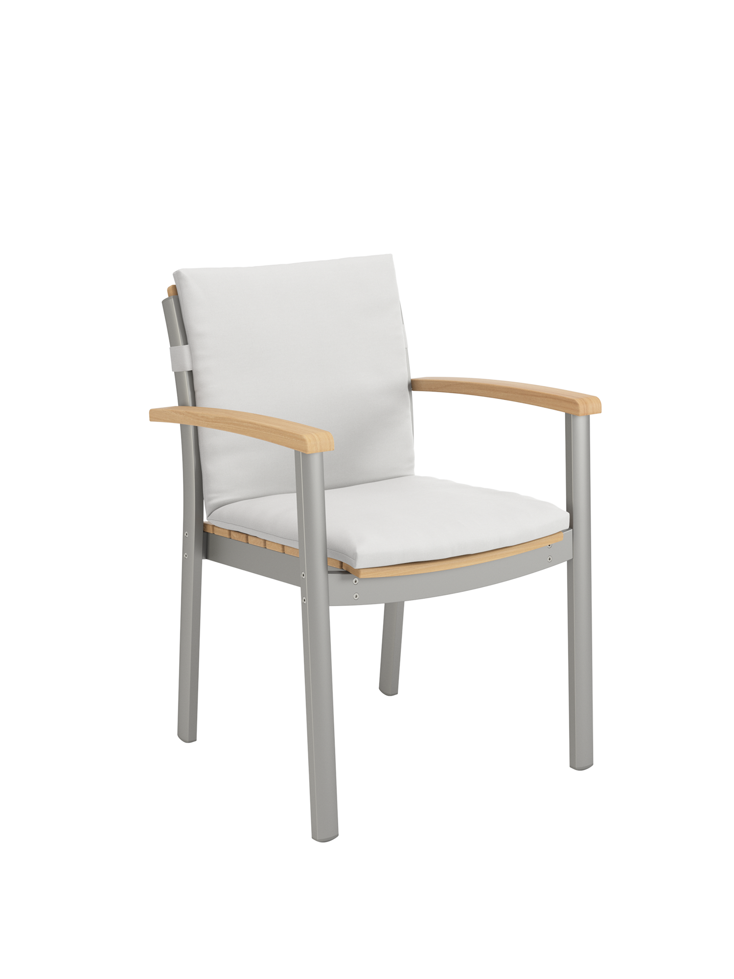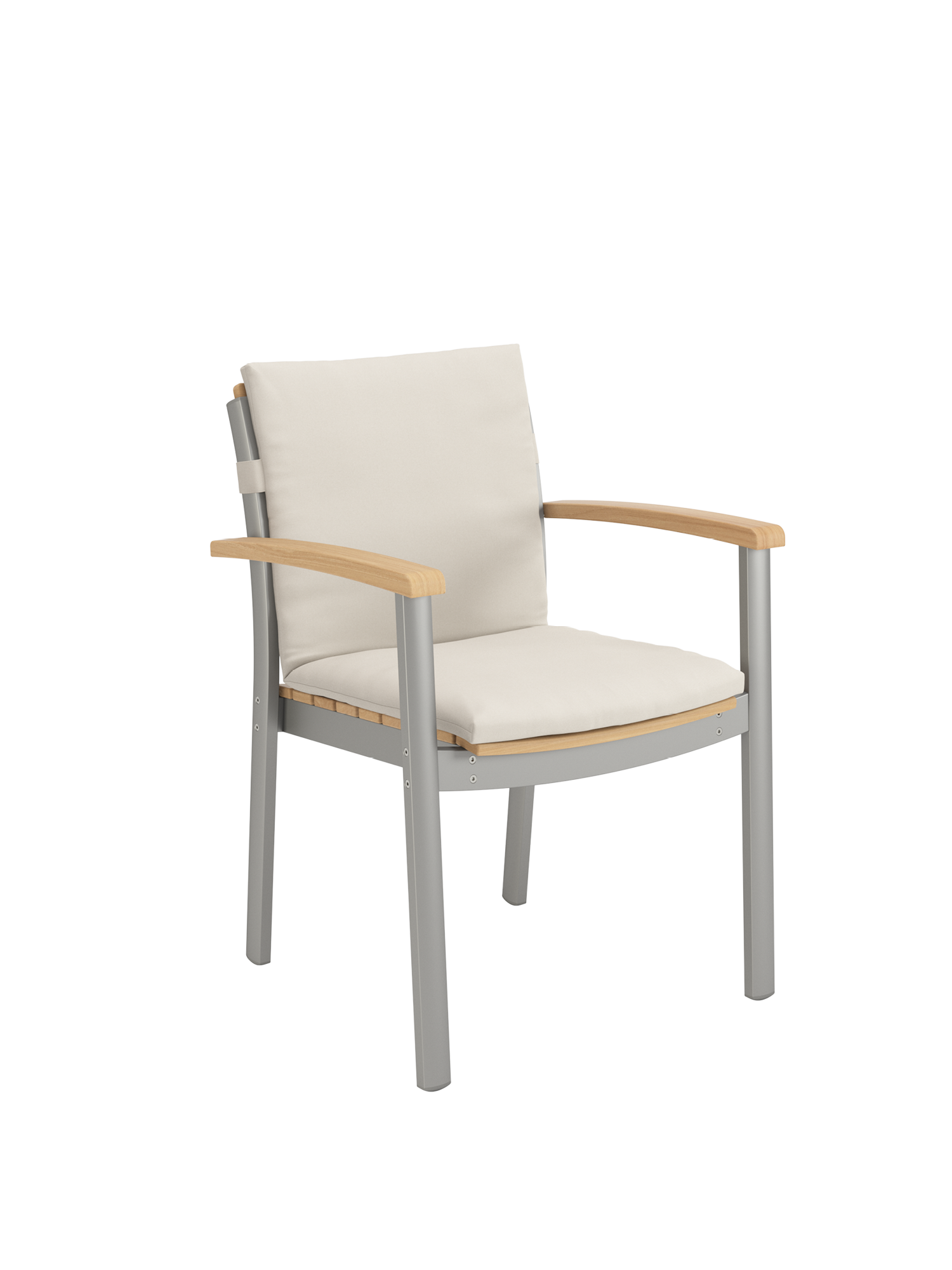 Hier werden langlebige Materialien perfekt in Szene gesetzt: Die eloxierten Profile des seidig glänzenden Aluminiumgestells umfassen passgenau die ergonomisch modellierten Teakleisten an Sitz und Rückenlehne. Und verleihen dem stapelbaren Designklassiker eine moderne Note.