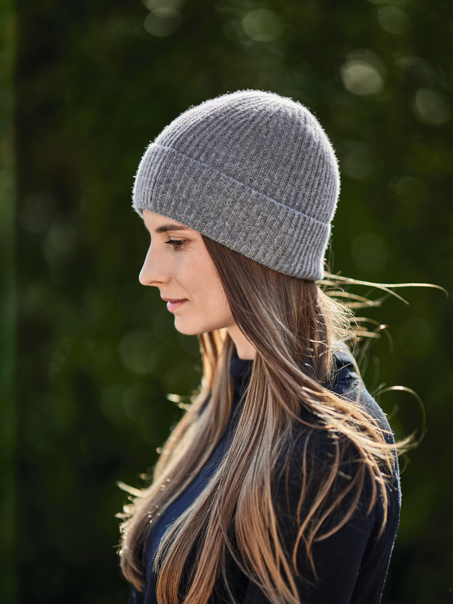 Die aus Eco-Cashmere und Melangegarn gefertigte Mütze kann im Wollwaschgang bei bis zu 30 Grad gereinigt werden und sollte anschließend im Liegen trocknen.