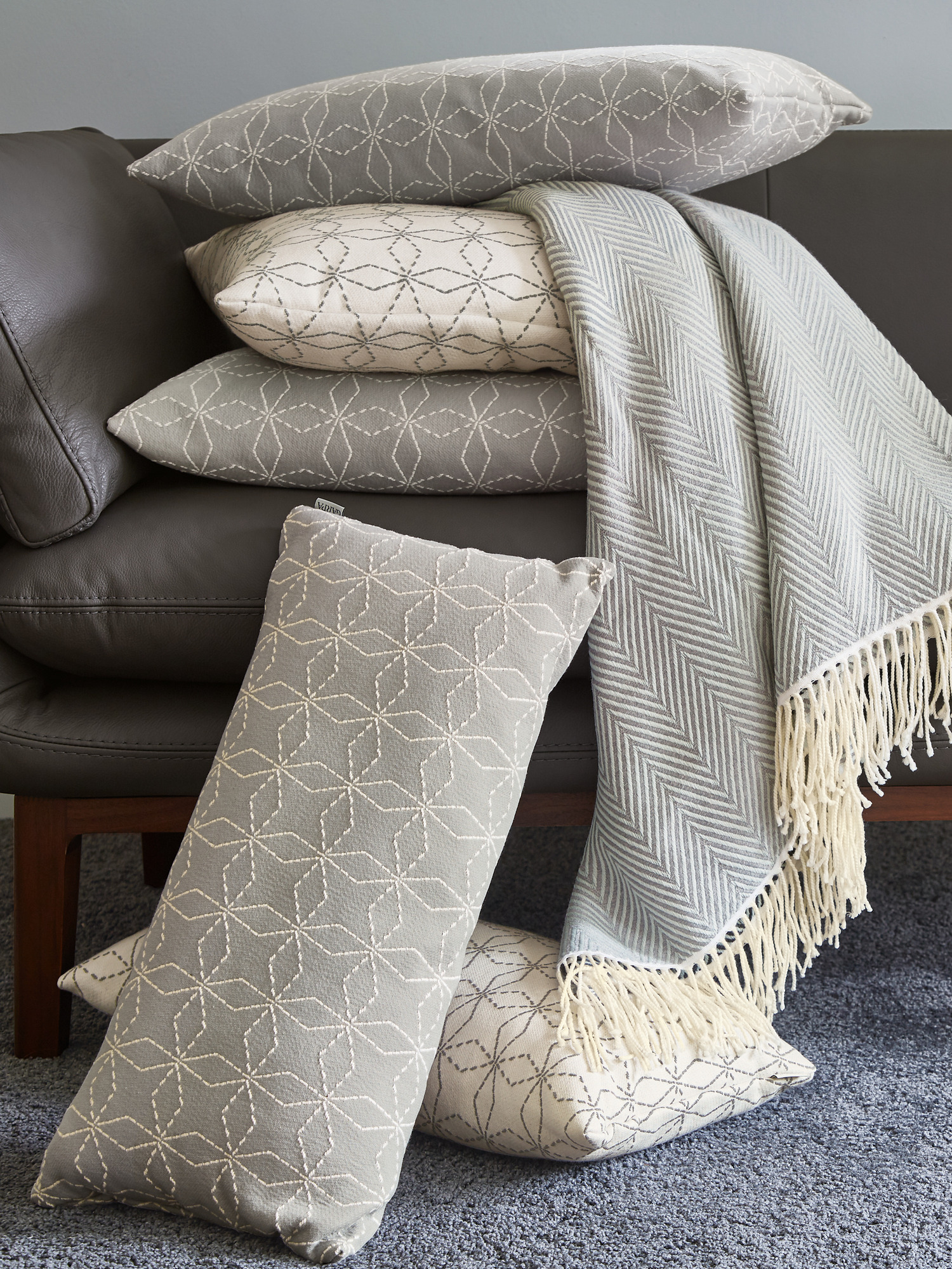 Helles Grau und zartes Beige im Wechselspiel: Die Grundfarbe der Mulino Kissen kehrt im grafischen Dessin des jeweils anderen wieder. Quadratische Federkissen und längliche Zusatzkissen lassen sich harmonisch kombinieren.